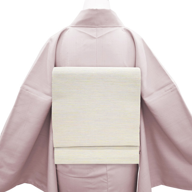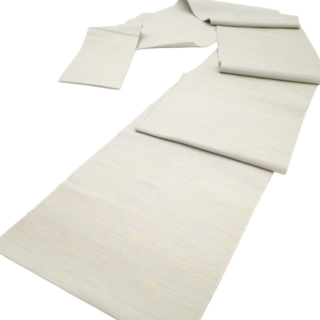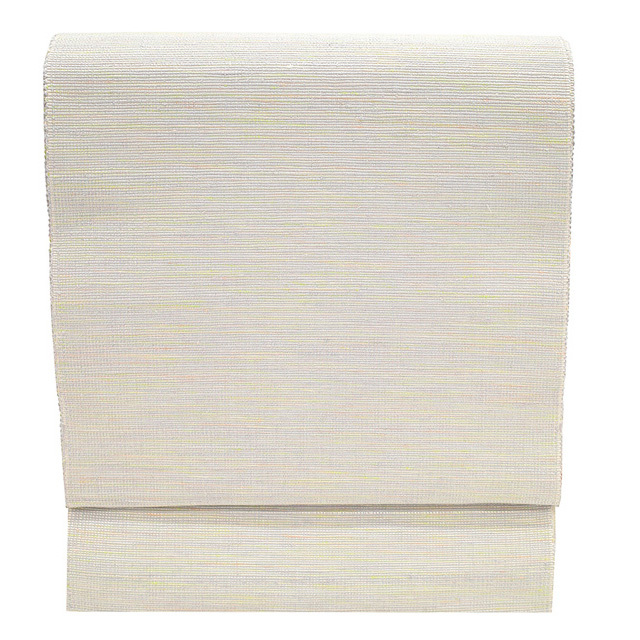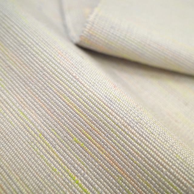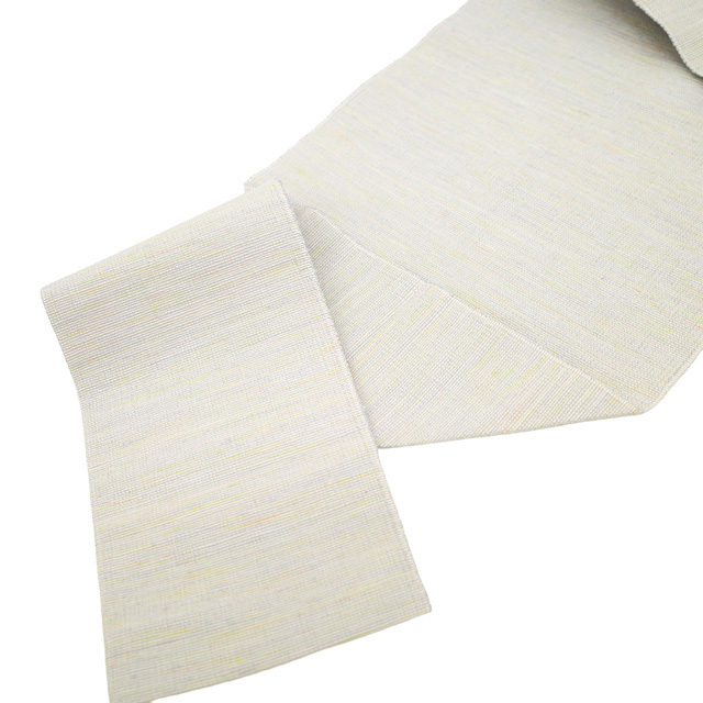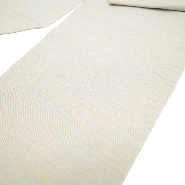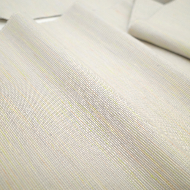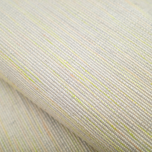 こちらのお品は、白ベージュを基調にライトグレー・黄緑・オレンジ の糸が織り込まれた無地感覚でお締めいただけるデザイン。