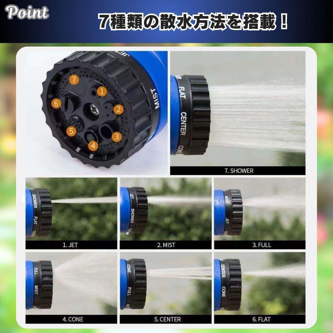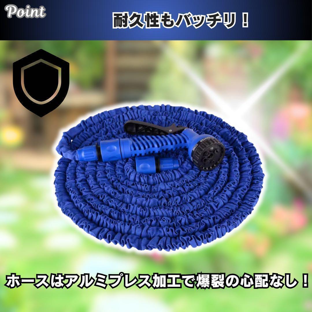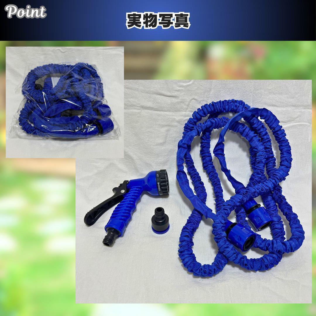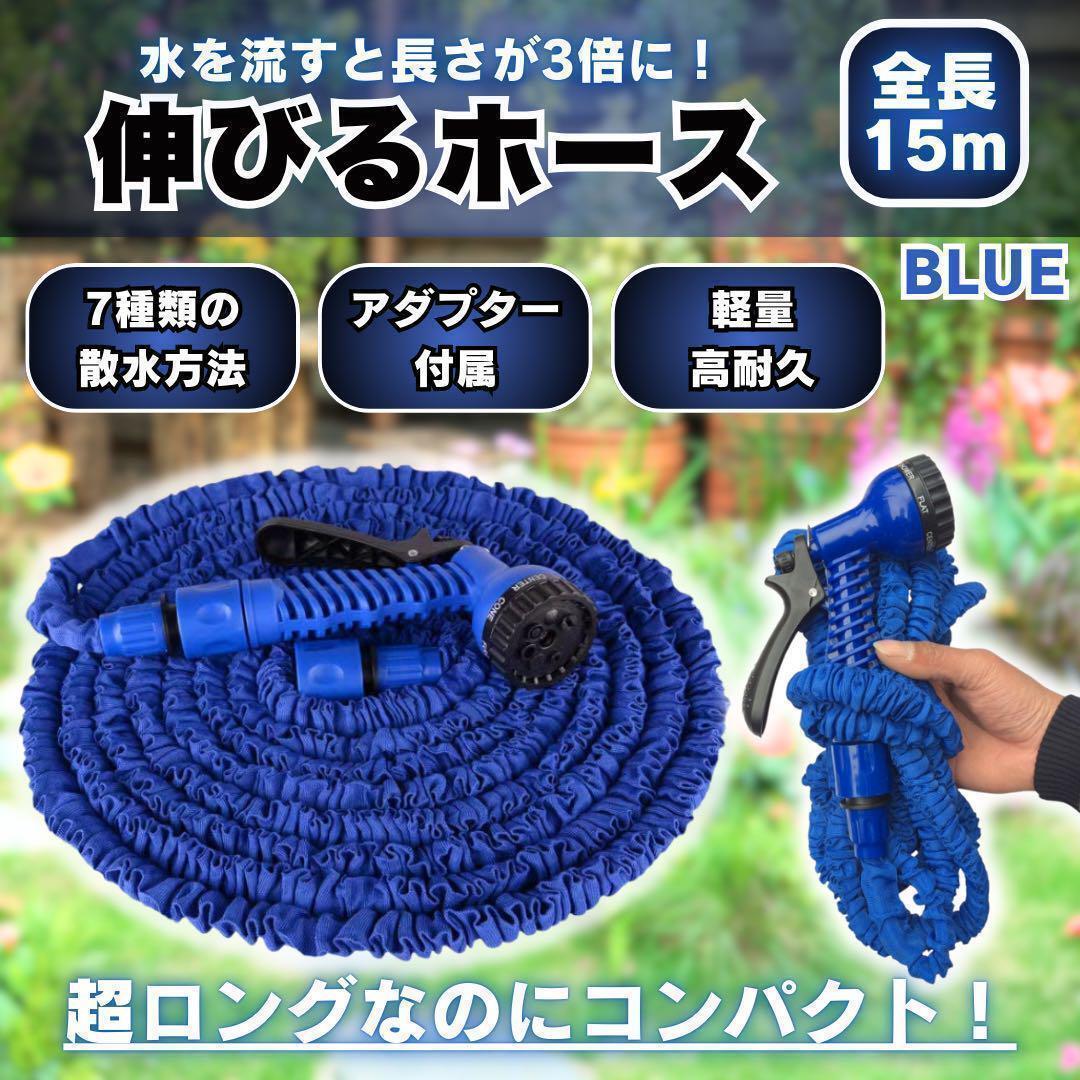 伸縮ホース 伸びるホース 15m ブルー 散水 ノズル付 洗車 ガーデニング 家庭菜園 掃除 プール 水遊び 園芸 軽量 コンパクト収納