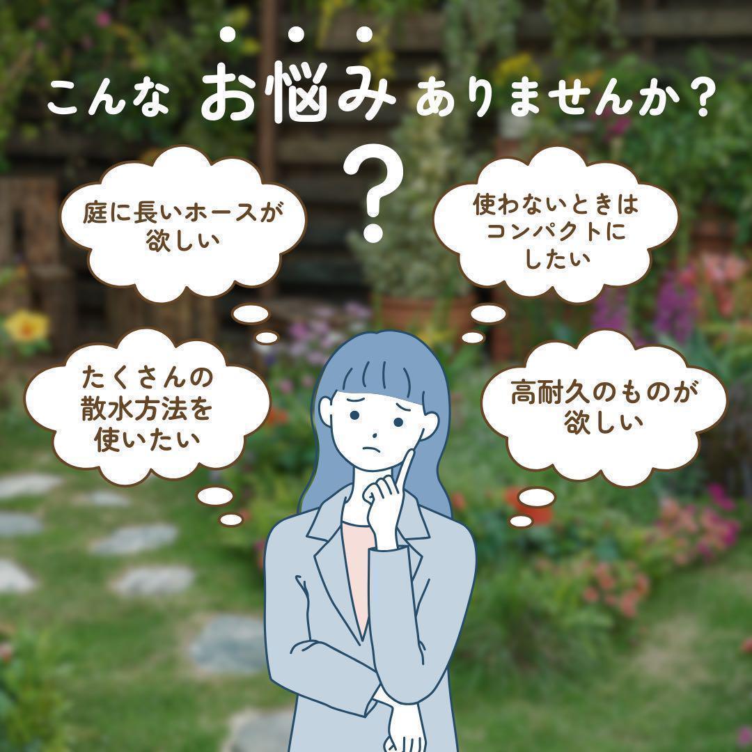 収納時は約5mでコンパクト、使用時は水圧で一気に伸びて広範囲に散水可能。