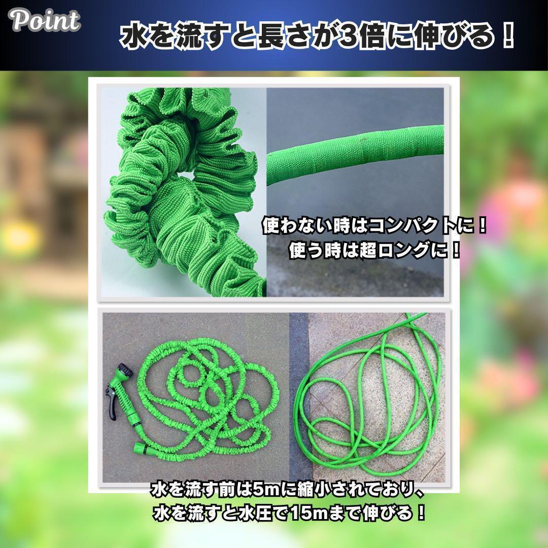 水を通すと最長15mまで伸びる便利な伸縮ホースです!