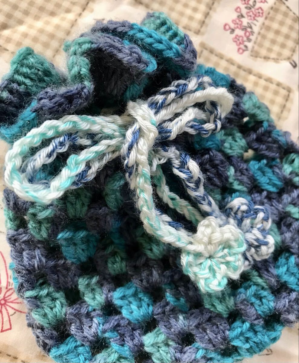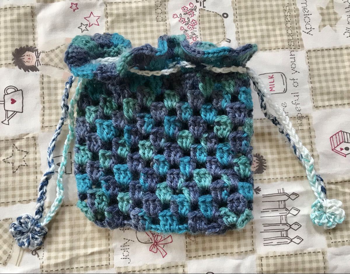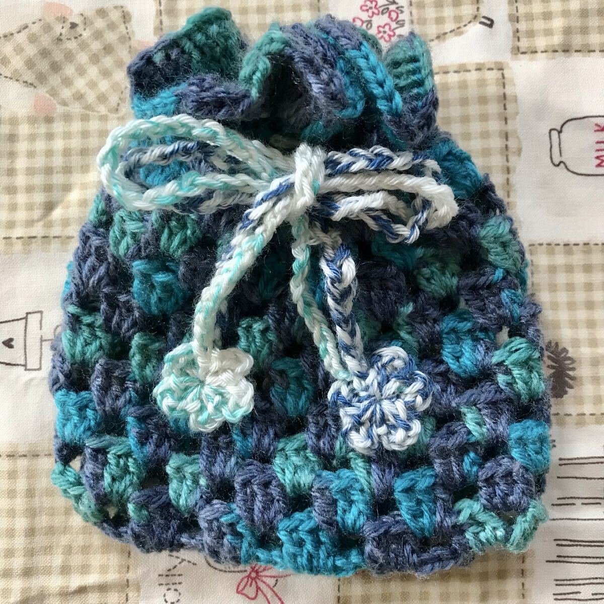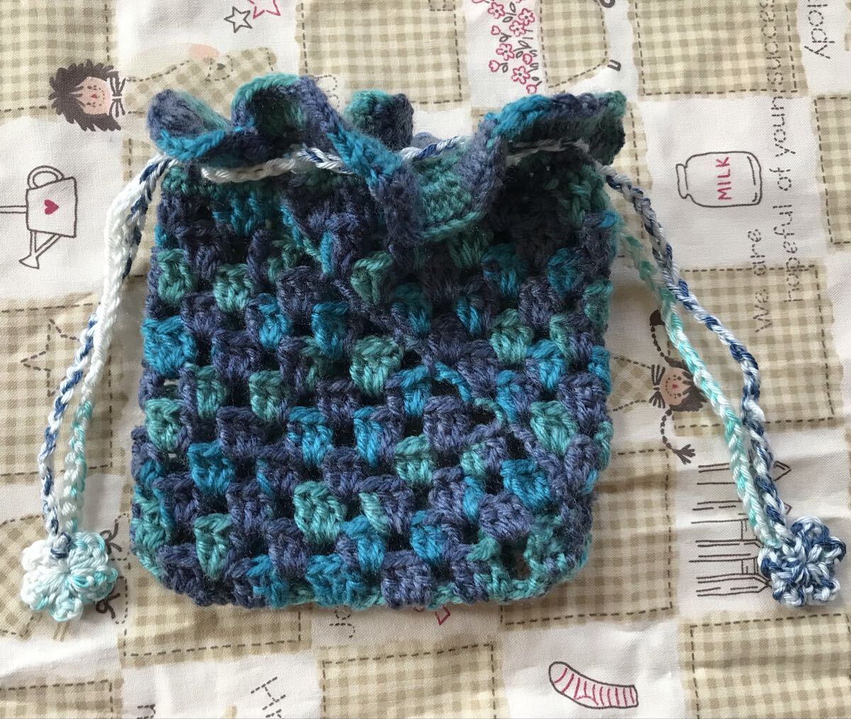 かぎ針で編んだハンドメイドのグラニースクエア巾着ポーチです。