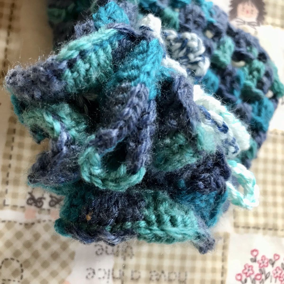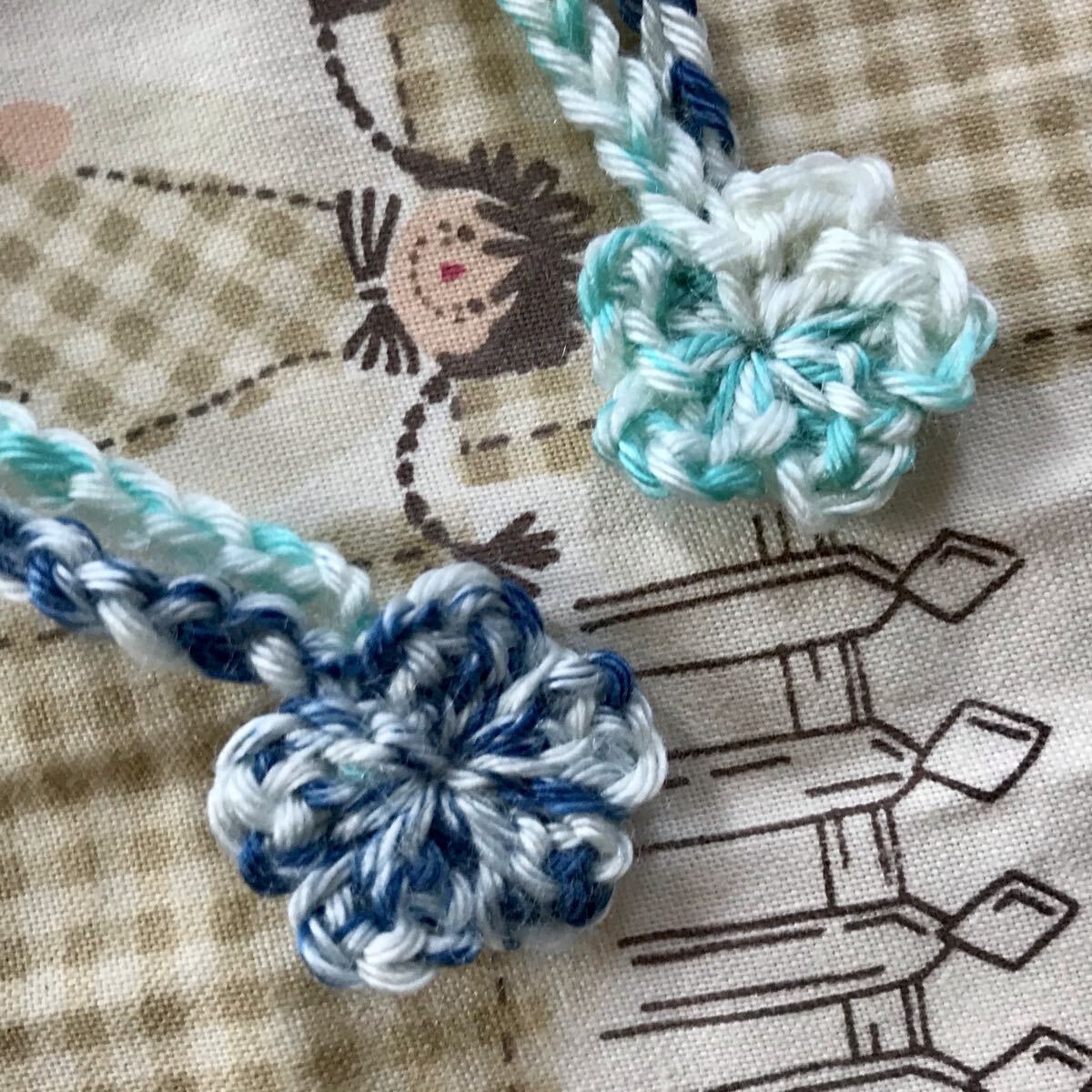 ターコイズブルーミックスな本体に淡いブルー×ホワイトなお花モチーフ付きの紐の組み合わせがキュートで引き絞ると長編みで編んだ口が薔薇の花びらのように折り重なるデザインがエレガントな一品です!