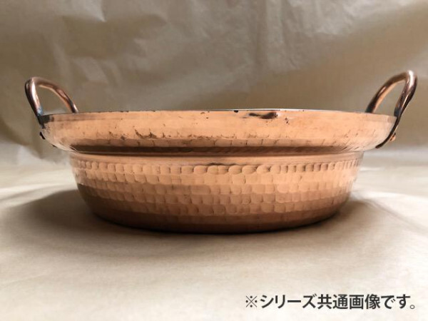 | 熱伝導率が高い銅製です。鍋物の際に欠かせないアイテムです。 ※こちらの商品は手作業で製作しているため、若干のサイズ誤差が生じる場合がございます。予めご了承ください。 【最初にご使用になる前に】 食器用洗剤をつけたスポンジで洗って、水でよく流し完全に乾かします。 その後、鍋7分目を目安に油を入れて火にかけ、弱火で4~5分煮てください。 (鍋から目を離さぬよう注意してください。) こうする事で油が鍋になじみ、焦げ付きを防ぎます。 煮終わった油には不純物が浮き上がる事があるので、完全に冷めてからお捨てください。 【お手入れ方法】 ●鍋が冷めてから、キッチンペーパー等で内側のくずを取り除き、薄く油を引いて収納してください。 ※油が鍋になじみ、一層焦げ付きにくく使い勝手のよい鍋になります。 ※油が気になる場合、又はしばらくご使用にならない場合には軽くスポンジで洗い、次回使用の際に油馴らしをしてください。 ●外側は、食器用洗剤等を使用してスポンジで洗ってください。 ●焦げ付いた場合、鍋に水を入れ火にかけ、沸騰させた後にスポンジで洗って最初に使用するときと同じように油で煮てください。たわし、クレンザーなどでこするのはおやめください。傷つきの原因になり、またその部分が焦げ付きやすくなります。 ●長期間ご使用にならない場合は、油を引いた後にキッチンペーパー等を内側に引き、かぶせておくことにより長持ちします。 【ご使用上の注意】 ●空焚きは絶対にしないでください。 ●銅は熱伝導率が非常に高いため、火力は弱め(中火~中火以下)に調整してください。 ●内側(銀色の部分)は、たわし、クレンザー、金属製の器具をご使用にならないでください。 ●持ち手がゆるんだ状態でのご使用はおやめください。 ●持ち手部分が熱い時には、鍋つかみ等をご使用ください。 ●鍋の中に調理物を長時間保存しますと錆びの原因になりますので、調理後はすぐに調理物を他の器に移してください。 |