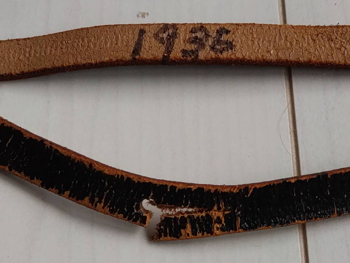 オリジナルの首掛けの革なのですが、画像の様に破損しているのでオマケ位に思って下さい。書かれてる番号は不明です。
