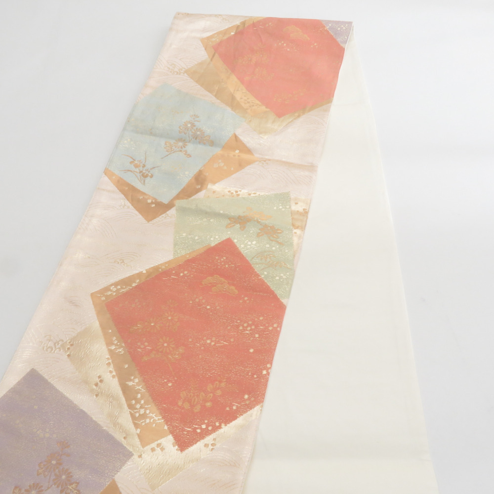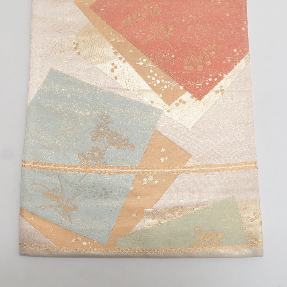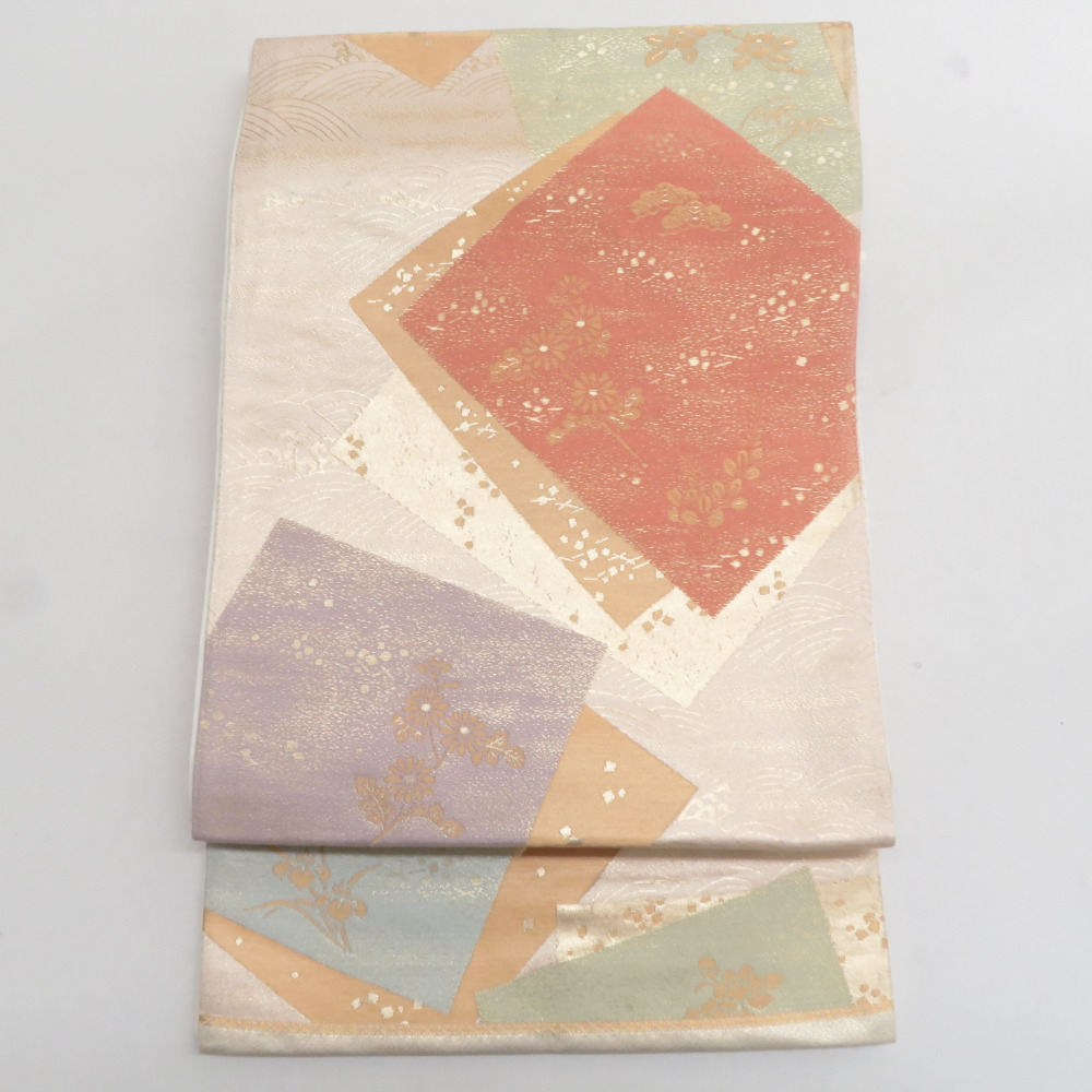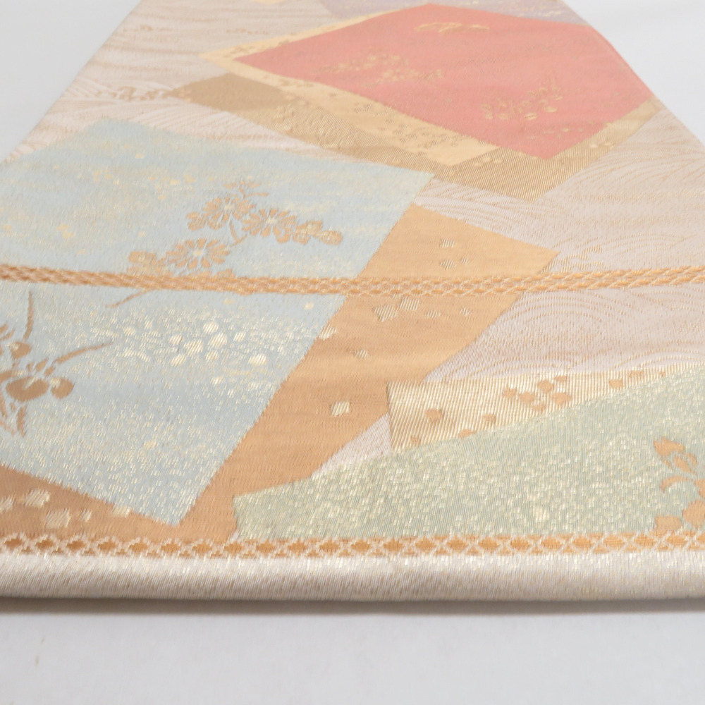 | 袋帯 正絹 金糸 色紙文様 ベージュ色x金色x多色 パステル系 六通柄 フォーマル 礼装 長さ430cm |