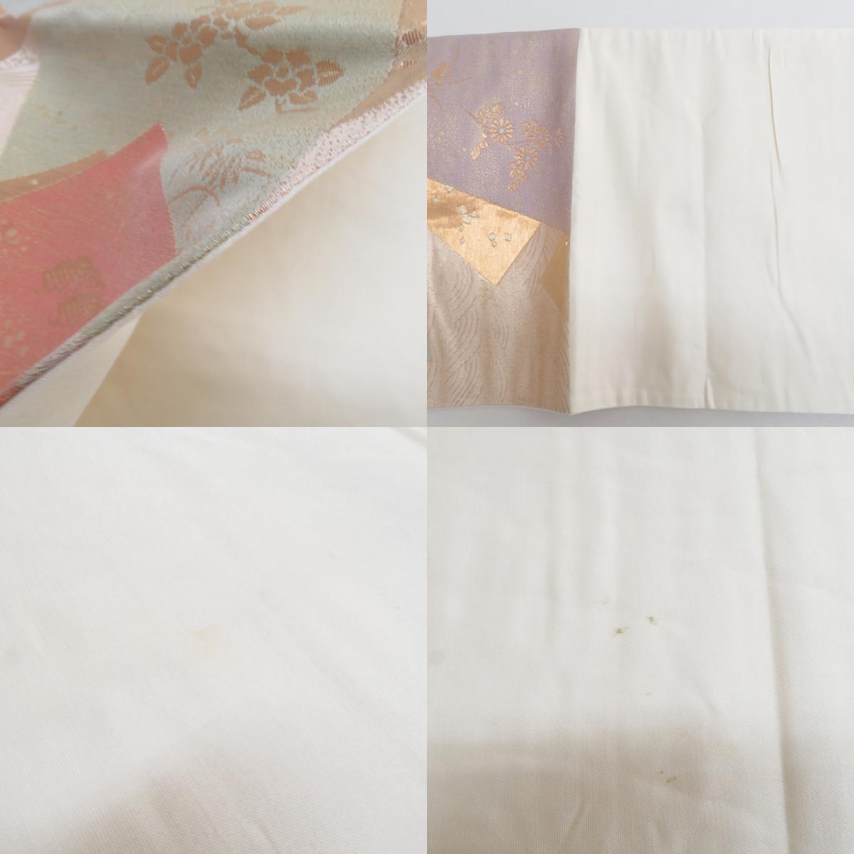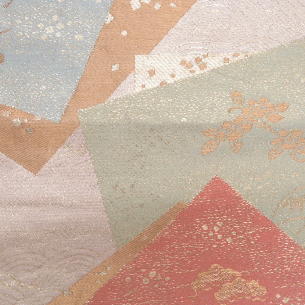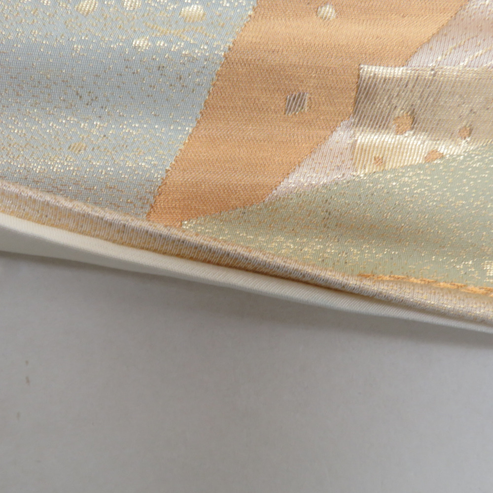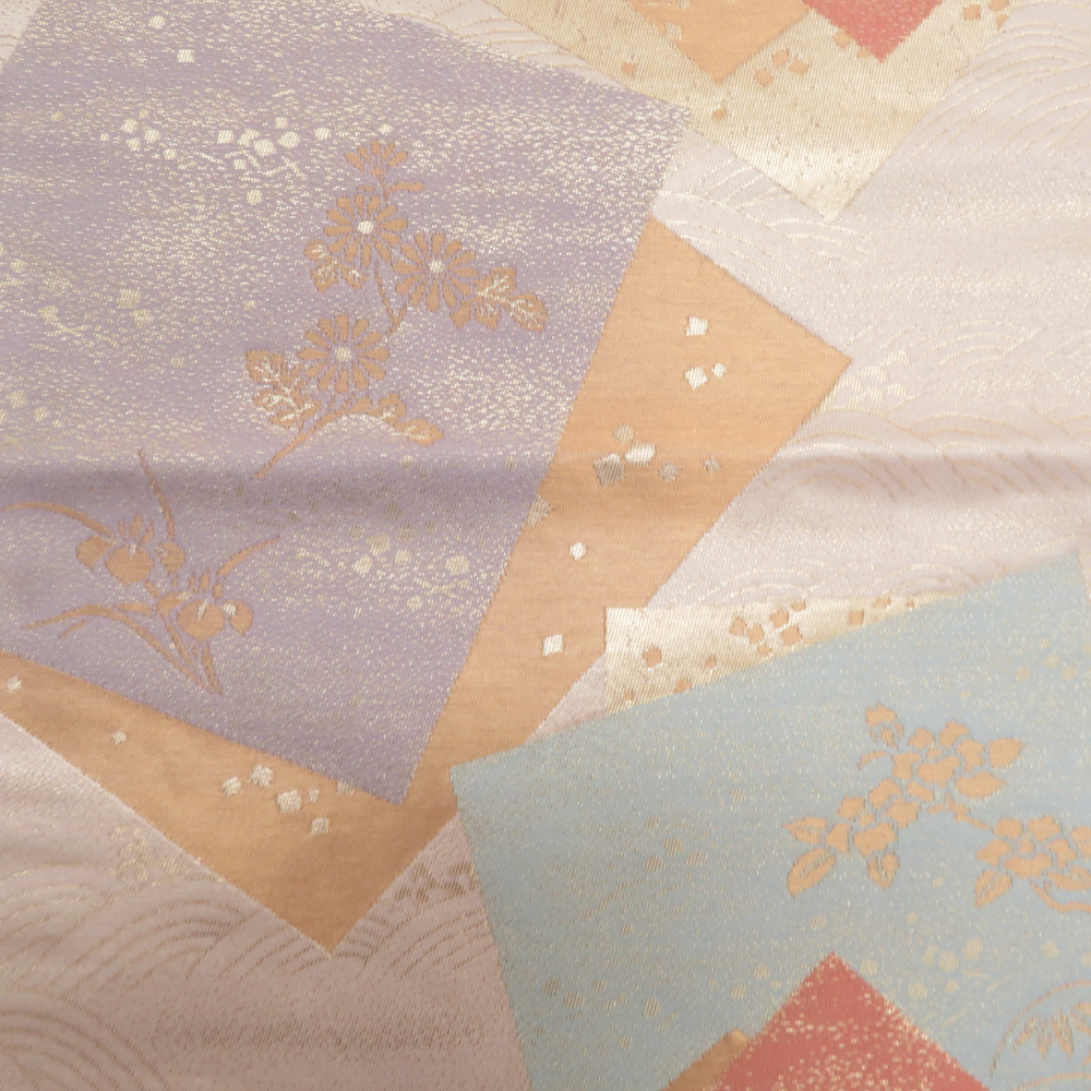 | 袋帯 正絹 金糸 色紙文様 ベージュ色x金色x多色 パステル系 六通柄 フォーマル 礼装 長さ430cm |