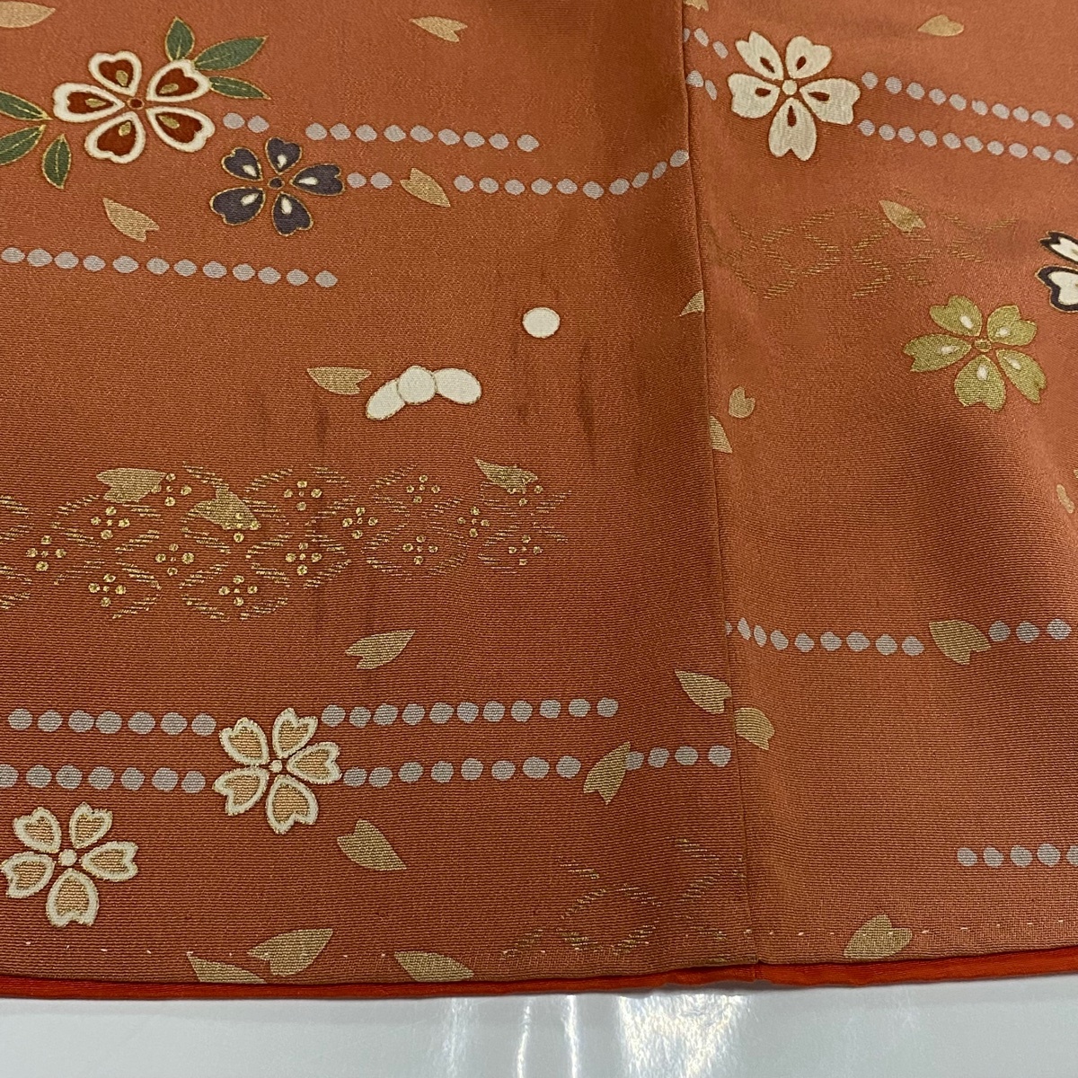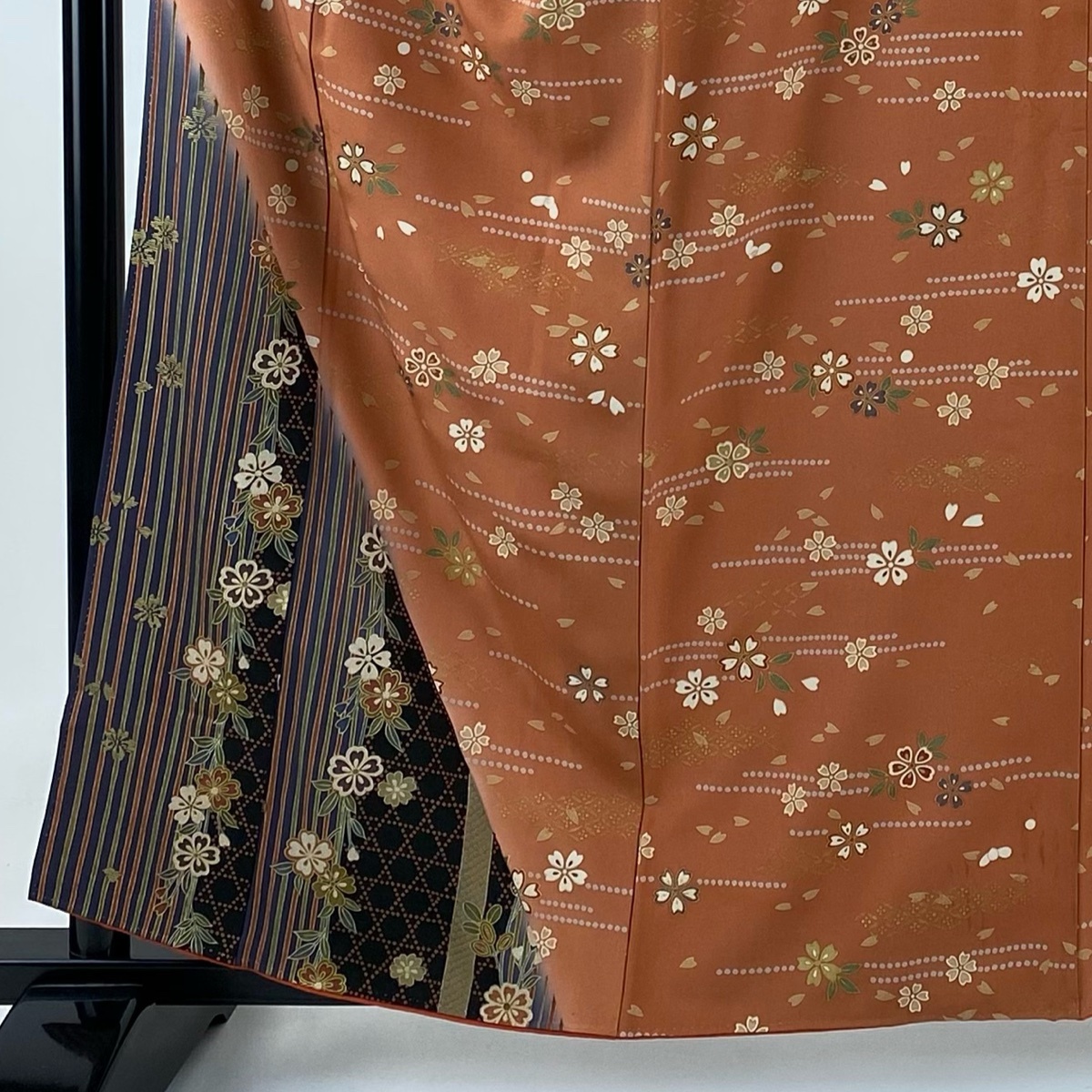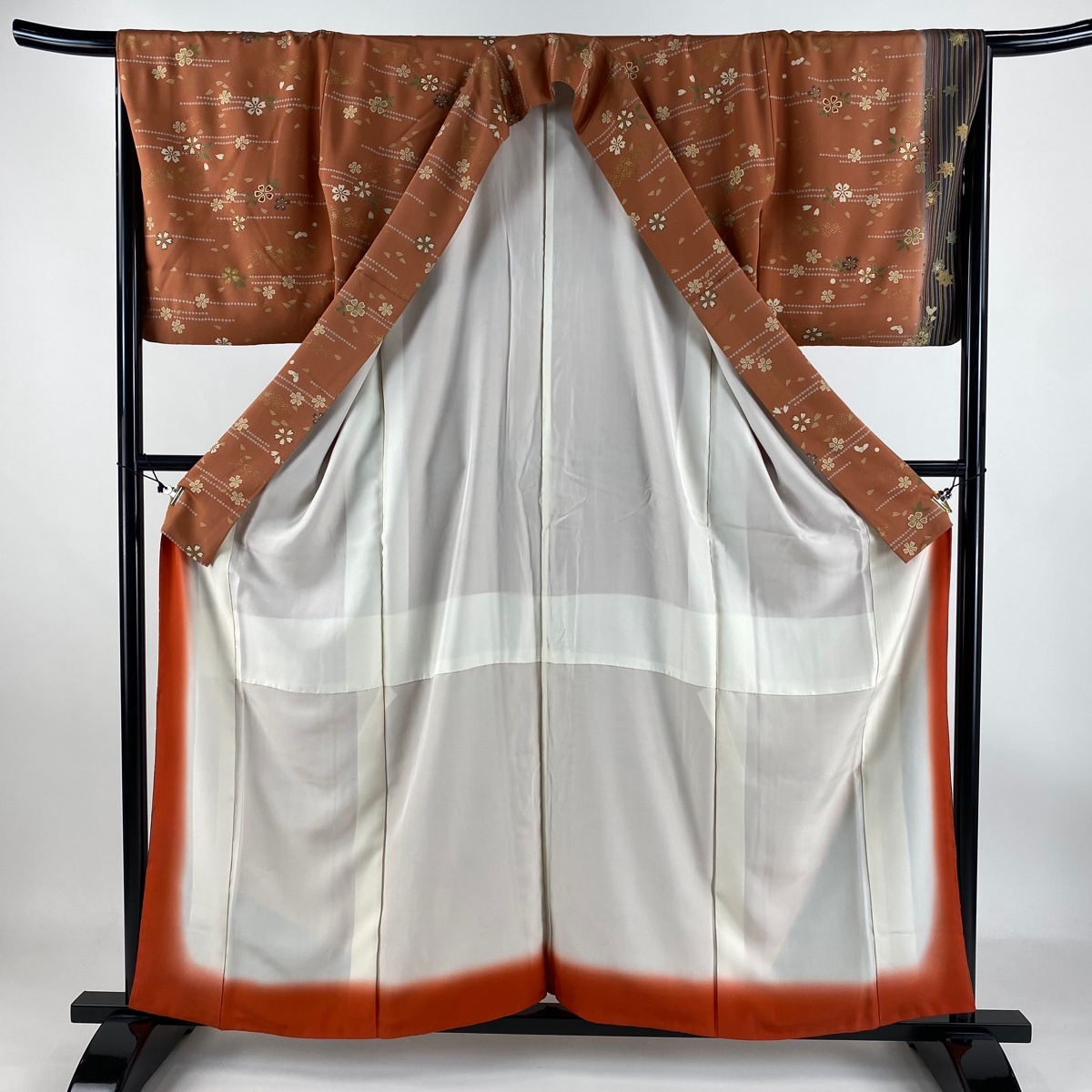 | 付下げ 秀品 桜 縞 金彩 ぼかし 赤茶 袷 身丈158.5 裄丈66 M 正絹 【中古】 |