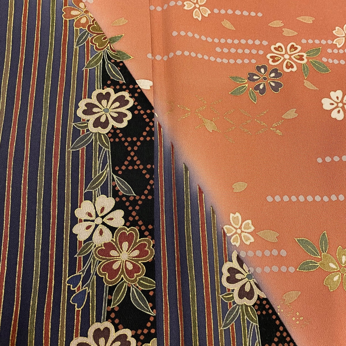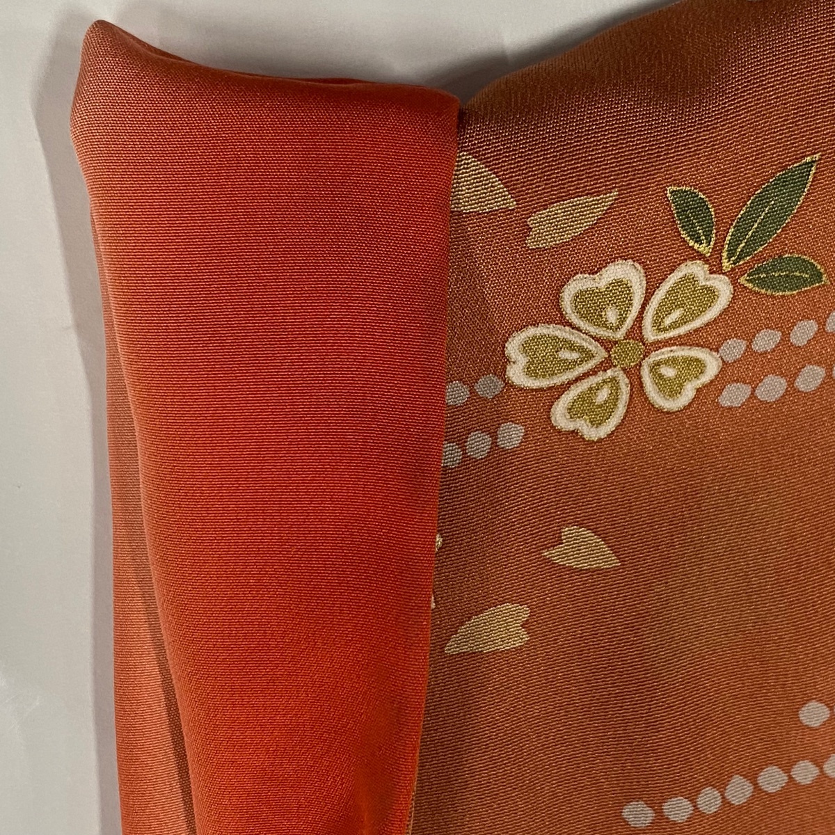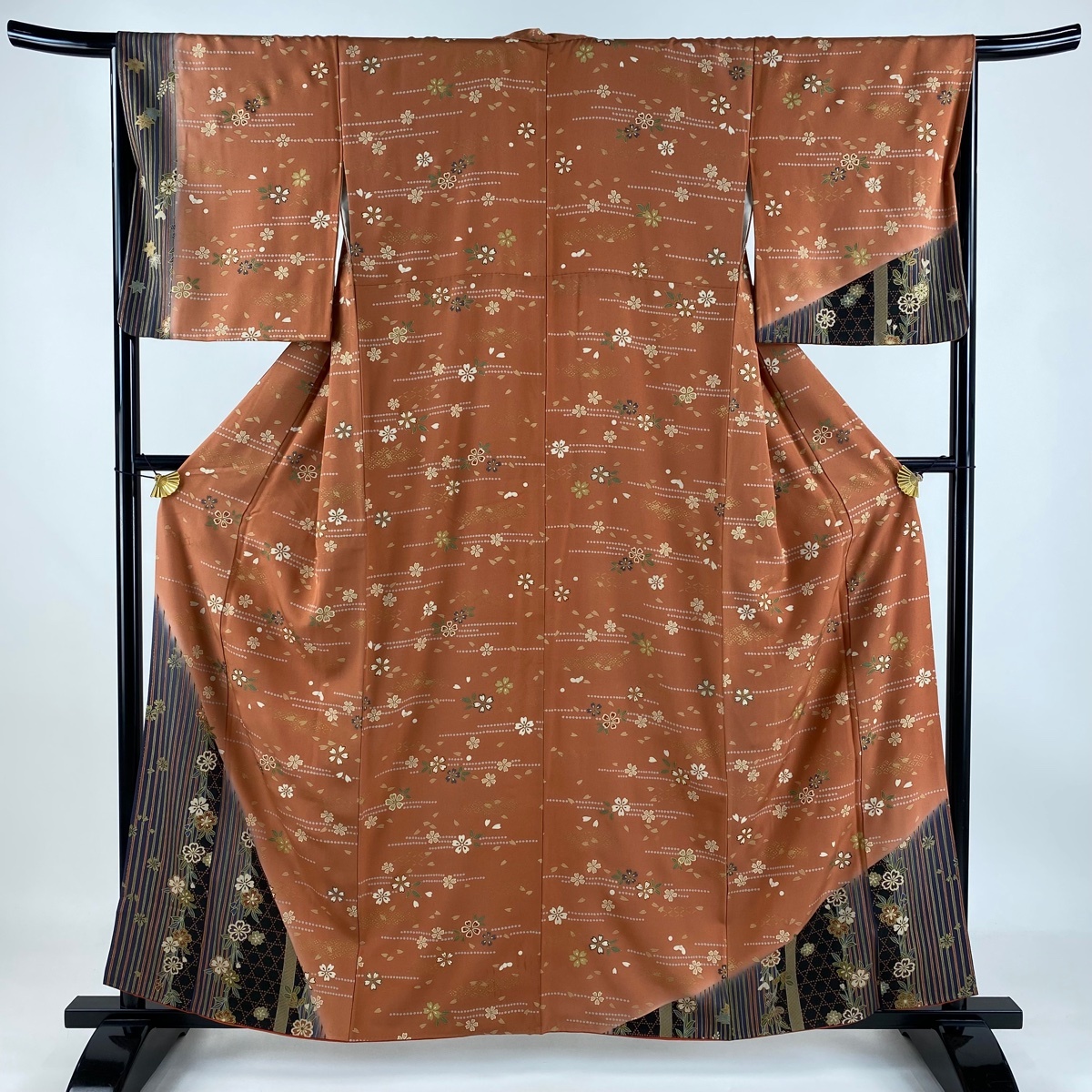 | 付下げ 秀品 桜 縞 金彩 ぼかし 赤茶 袷 身丈158.5 裄丈66 M 正絹 【中古】 |