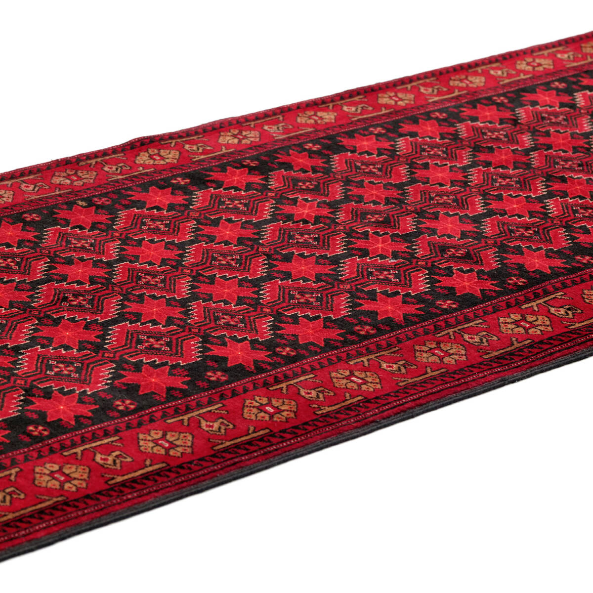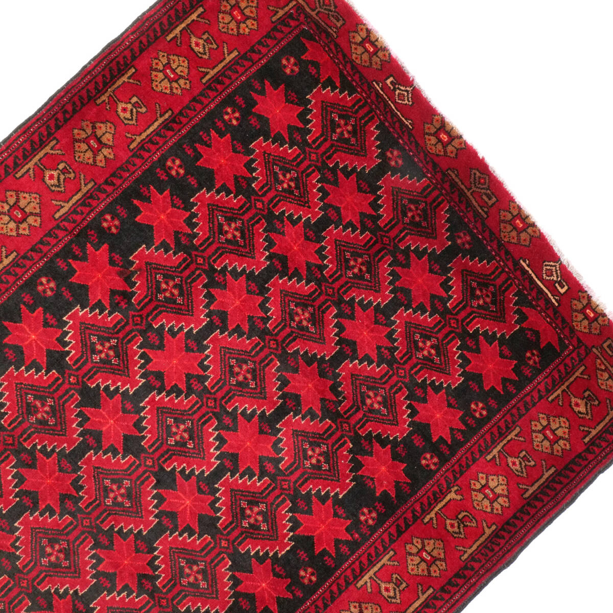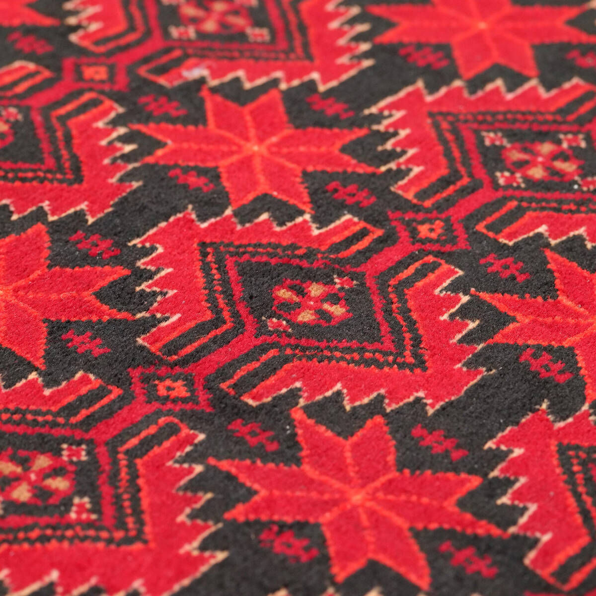 1970年代に制作されたトルバトヘイダリエ産のセミアンティークラグです。フィールド全体には反復する星型のモチーフが整然と配され、黒と赤のコントラストによって力強い印象を与えています。規則的に並ぶ文様は部族的な秩序と装飾性を兼ね備えており、空間を引き締める存在感を放ちます。