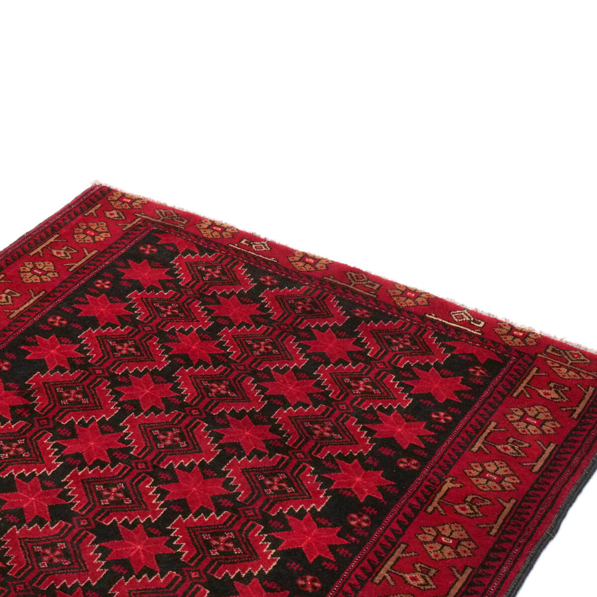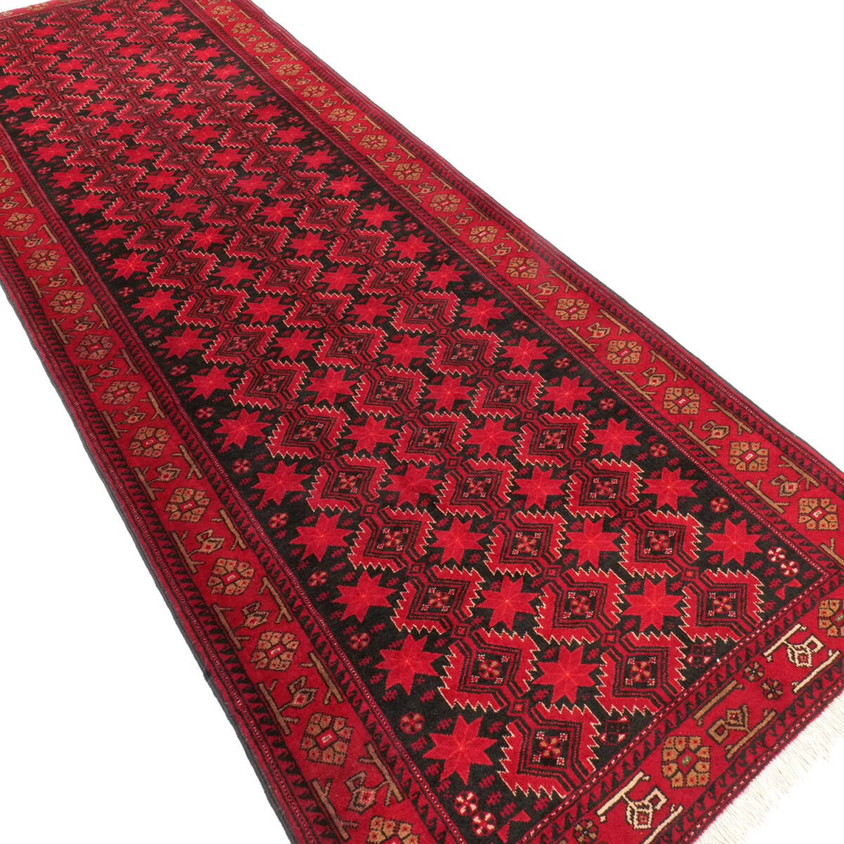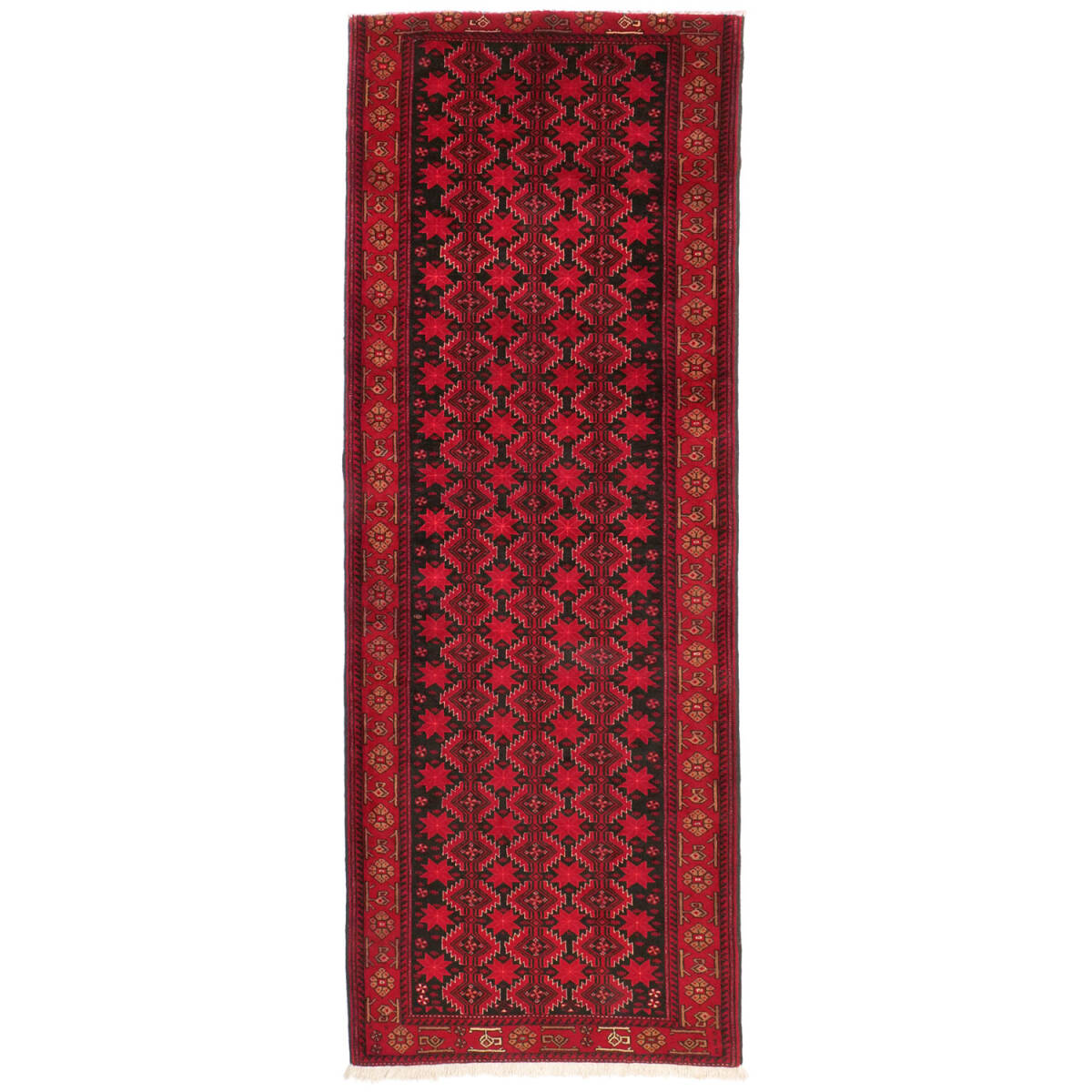 1970年代に制作されたトルバトヘイダリエ産のセミアンティークラグです。フィールド全体には反復する星型のモチーフが整然と配され、黒と赤のコントラストによって力強い印象を与えています。規則的に並ぶ文様は部族的な秩序と装飾性を兼ね備えており、空間を引き締める存在感を放ちます。