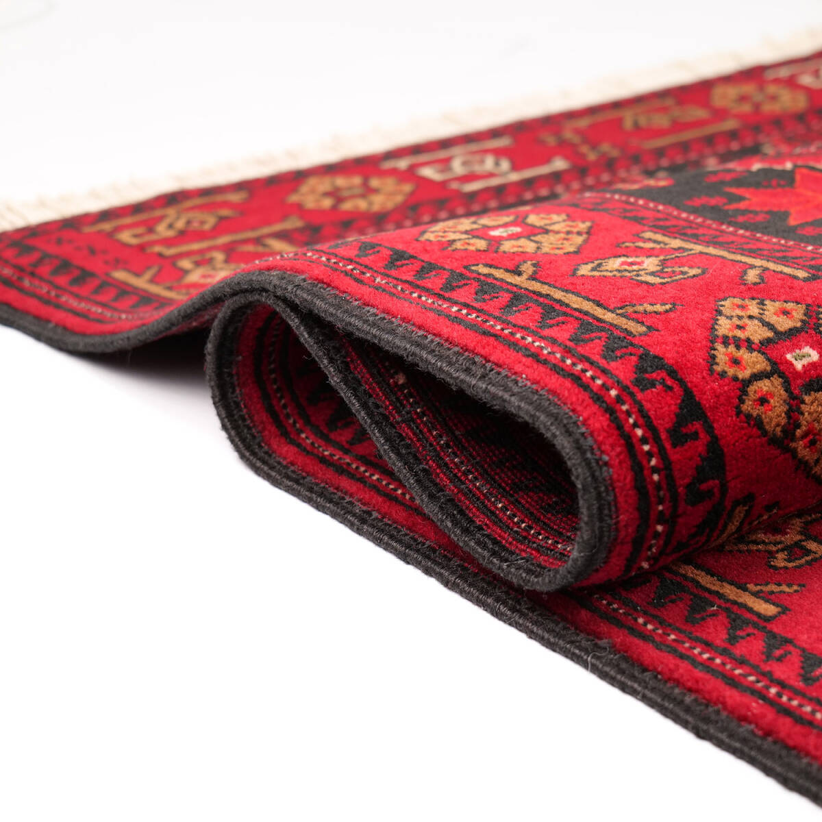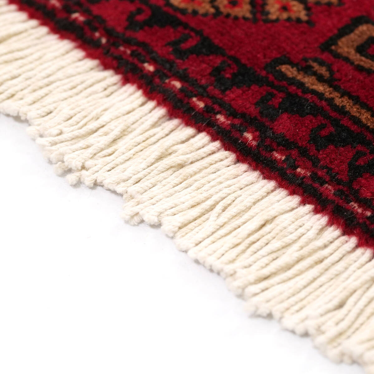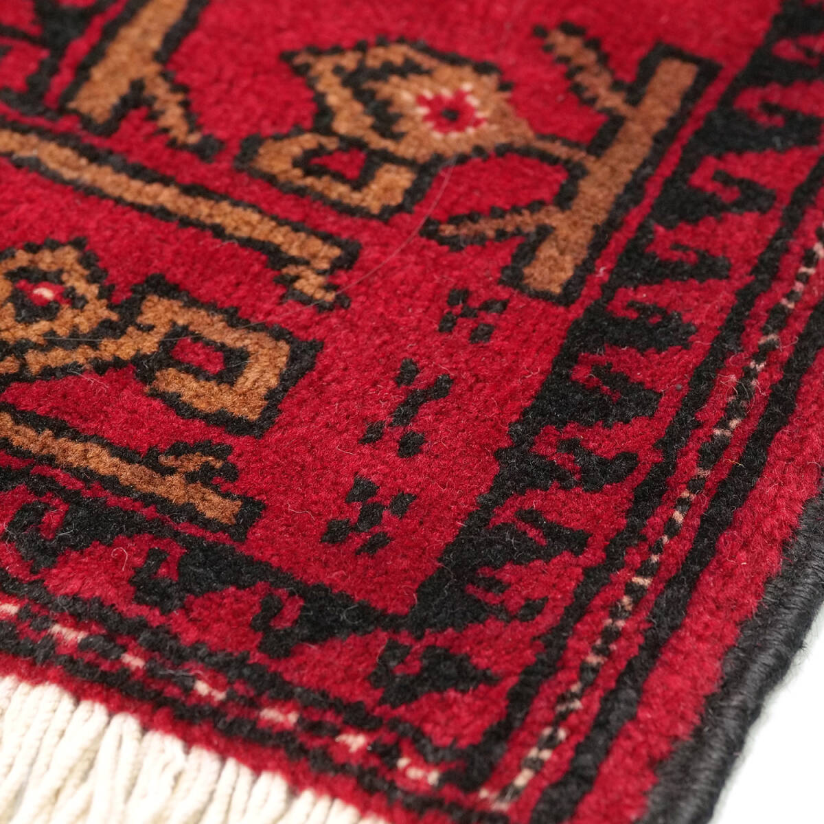 鮮やかな赤を基調に、黒と生成りがアクセントを添えています。長年の使用により落ち着きを帯び、セミアンティークならではの柔らかい色合いが楽しめます。