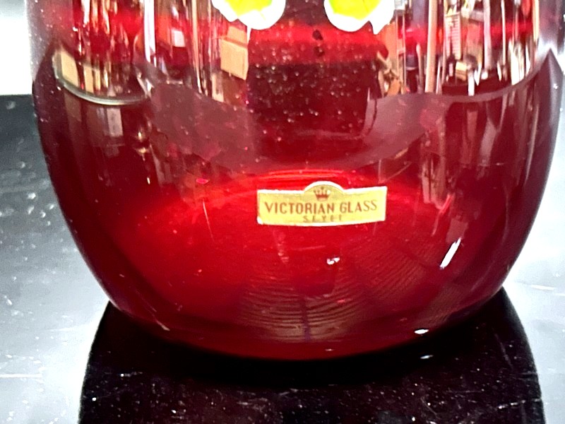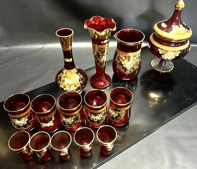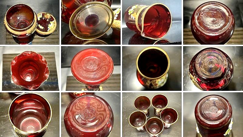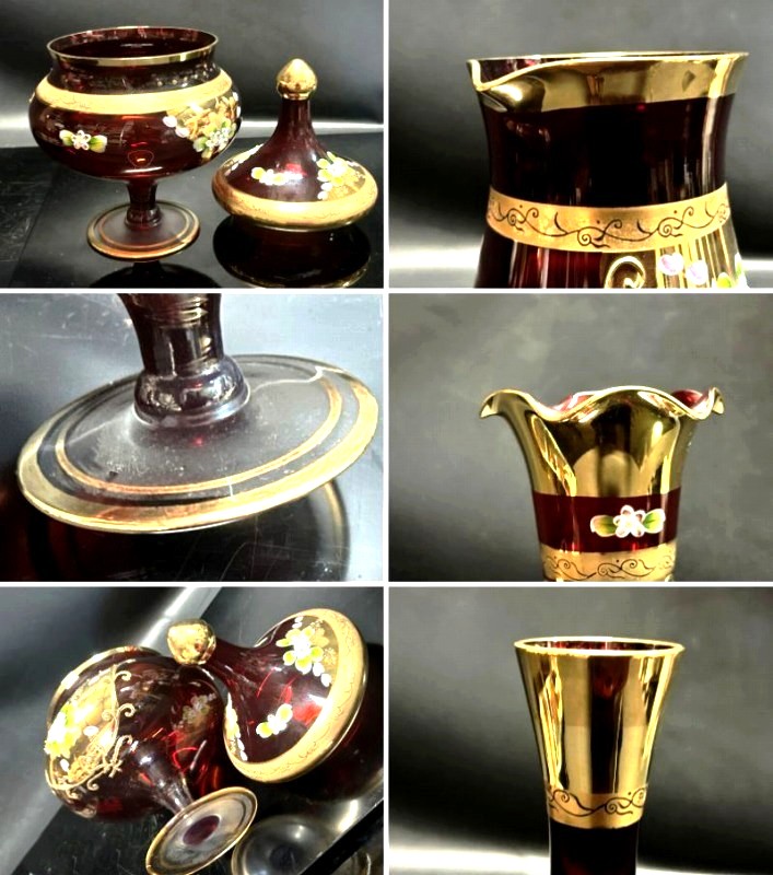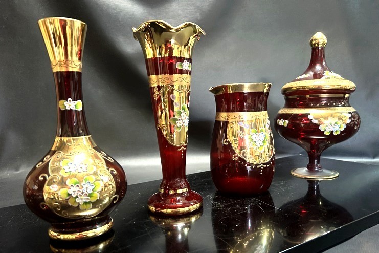 深紅のガラスに金彩が舞い、手描きの花々が咲き誇る