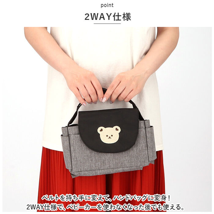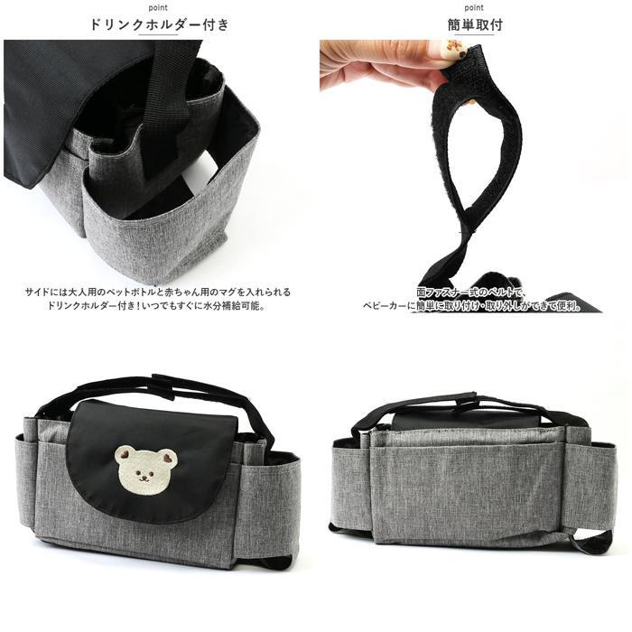 商品説明 | ・・ベビーカーに取り付けてお出かけの負担を軽減♪2WAYで使えるベビーカーバッグの登場。 ・【欲しいものをサッと出せる】 ・外出先で、おむつ・哺乳瓶・おもちゃ・お菓子・スマホ・鍵etc...バッグから取り出したいものはいっぱい。ベビーカーの持ち手に取り付けることで、欲しいものを手元からサッと出せる! ・【2WAY仕様】 ・ベルトを持ち手に変えて、ハンドバッグに変身!2WAY仕様で、ベビーカーを使わなくなった後でも使える。 ・【整理整頓】 ・メインルームはマチ約11cmと大容量。取り外し可能な仕切りと、前面のオープンポケットで、ベビー用品と自分用のスマホや、鍵などを分けて整理整頓!メイン収納は面ファスナーで簡単開閉&中身が見えにくいのも嬉しいポイント◎ ・【ドリンクホルダー付き】 ・サイドには大人用のペットボトルと赤ちゃん用のマグを入れられるドリンクホルダー付き!いつでもすぐに水分補給可能。 ・【簡単取付】 ・面ファスナー式のベルトで、ベビーカーに簡単に取り付け・取り外しができて便利。 ・【使い方いろいろ】 ・グレーXブラックでどんなスタイルにも合わせやすい♪ベビーカーに取付以外にも、車のヘッドレストやベビーベッドにも取り付けたりと、使い方も多種多様。 |
