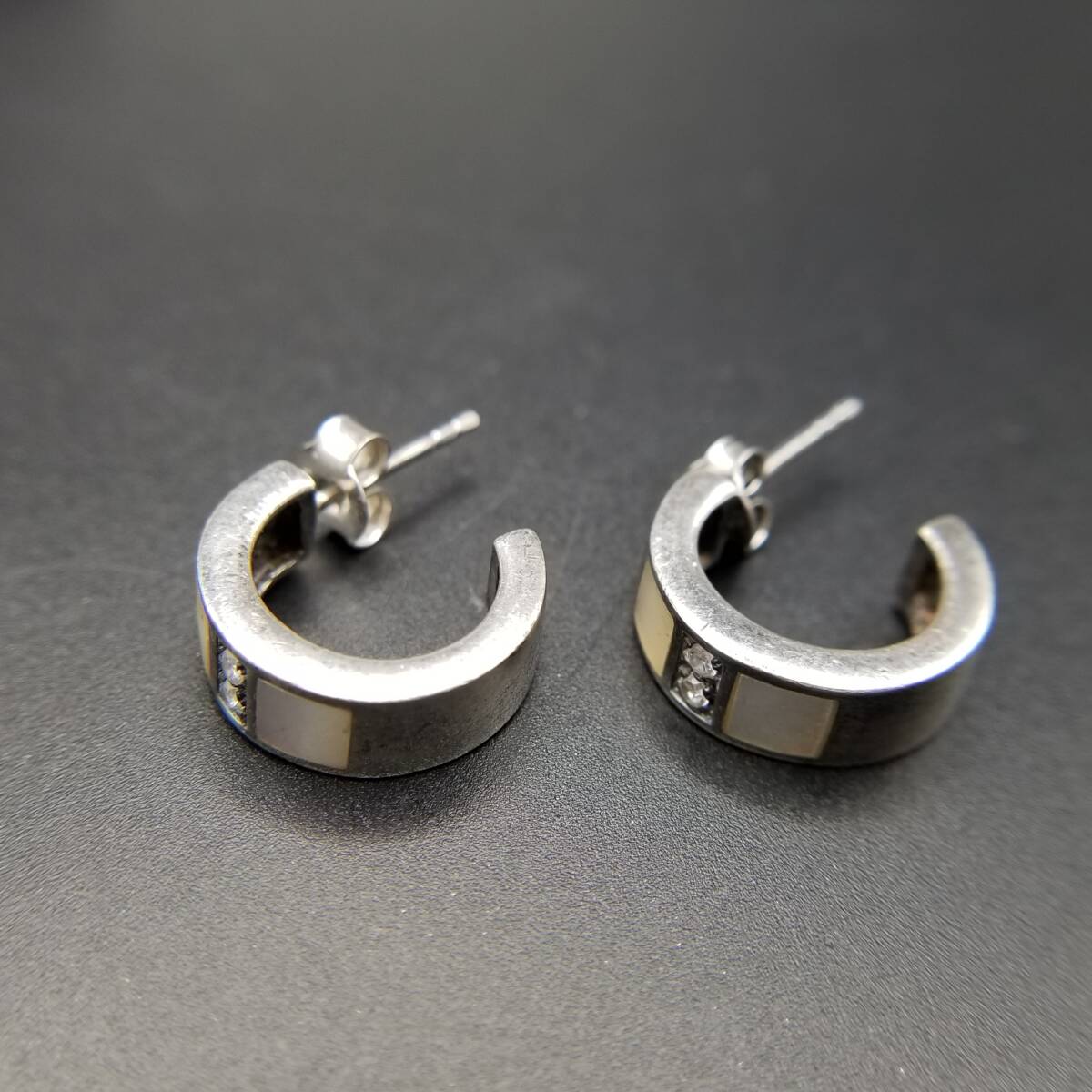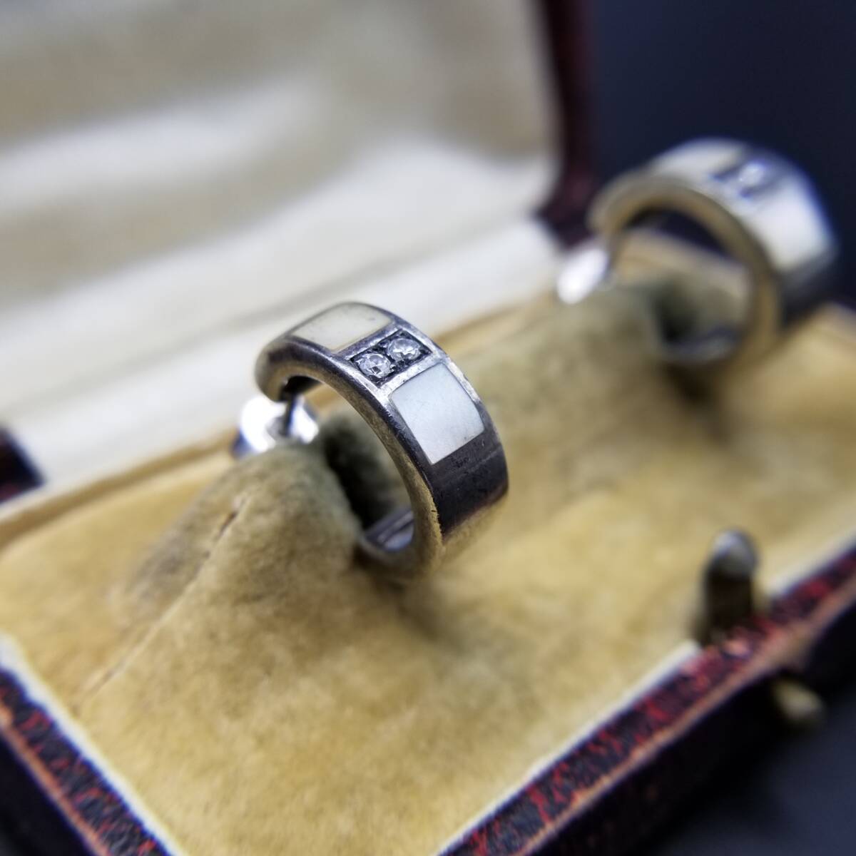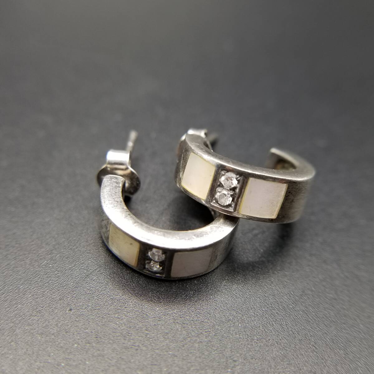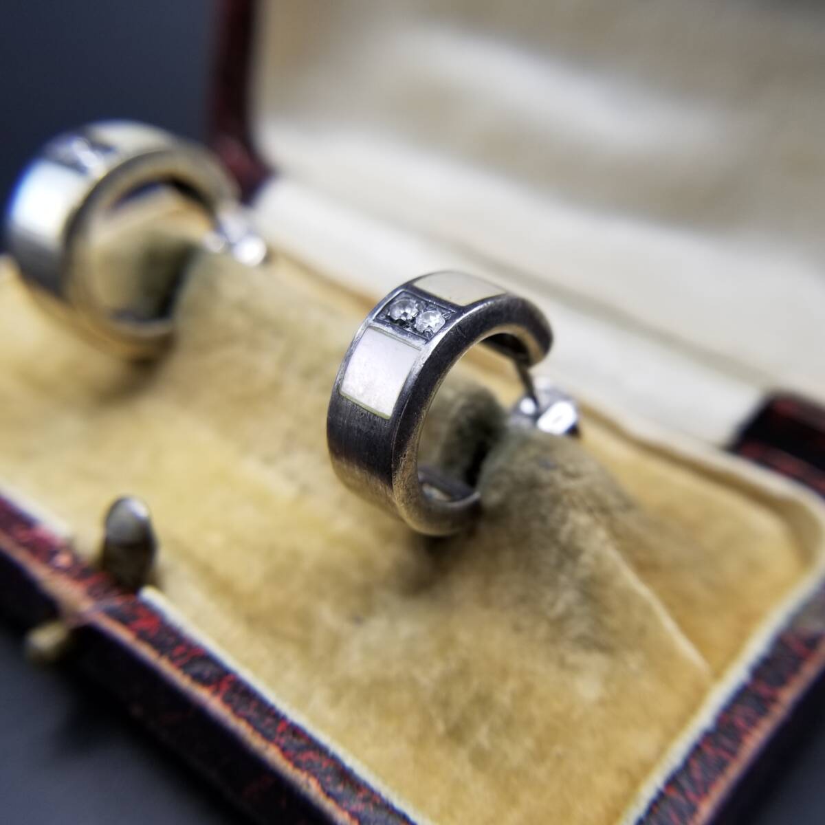 マザーオブパール ラインストーン インレイ 925 シルバー ヴィンテージ フープ ピアス 銀幅広 小ぶり 上品なサイズ感 Y24-N