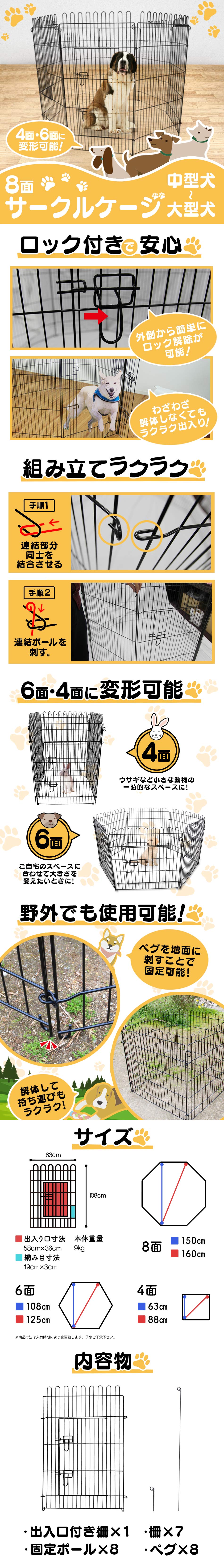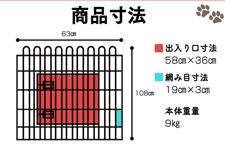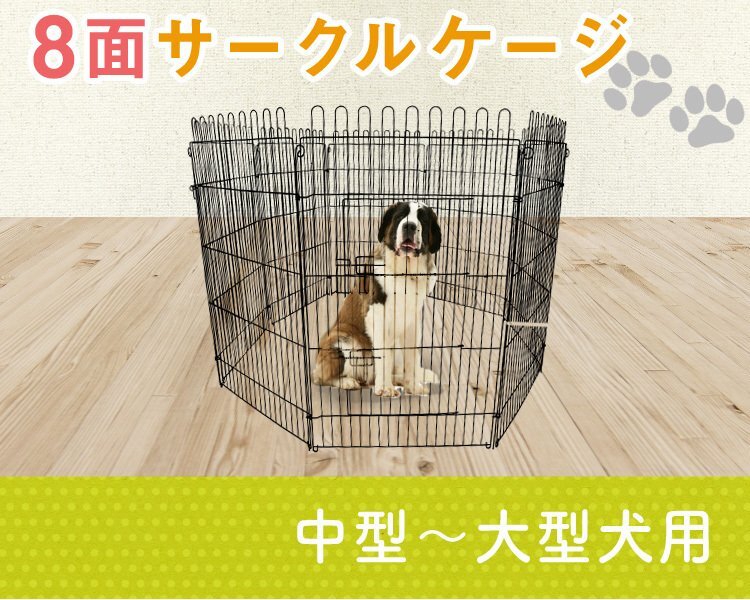 | ワンちゃんにぴったりのサークル! 室内でもアウトドアでもご使用いただけます。 設置場所、用途に合わせ簡単に色んな形に出来ます♪ 組立ては超カンタンです! ウサギなどの小さな動物でも使えます♪ 上部はワンちゃんが怪我をしないように丸く加工しています。 ドア付きで簡単に出入りできます。 もちろん、ロックで脱出防止! 屋外使用時に便利なペグが付属しています。 アウトドアやお庭で大活躍! 【商品仕様】 形状:8面 1面サイズ(約):幅63cm×高さ108cm 入口サイズ(約):幅58cm×高さ36cm 本体重量(約):9kg 材質:スチール 扉の向き:右開き 【商品内容】 ドア付き柵 ×1 柵 ×7 ペグ ×8 固定ポール ×8 【注意事項】 ・ペットに合った高さのサークルをお選びください。 ・室内でのご使用時には床に傷がつかないよう保護してお使いください。 ・商品は、モニターによって色合いが異なって見える場合があります。 ・仕様・デザインは改良のため予告なく変更することがあります。 |