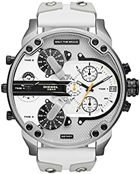 Dieselのスニーカーのアウトソールのように、レザーをシリコンが包むストラップが他にはない個性を放つ。ホワイトと薄いグレーにオレンジとさりげなくグリーンの色調を帯びるルミノバがアクセントを添え、ブラックが引き締めているマイアミにインスパイアされたカラーリングがクールなFused Collection。無骨で大ぶりなケースが最大の魅力のDADDY コレクション。メカニカルなダイアルは自動車や航空機の操縦席に並ぶ計器類からインスパイアされている。