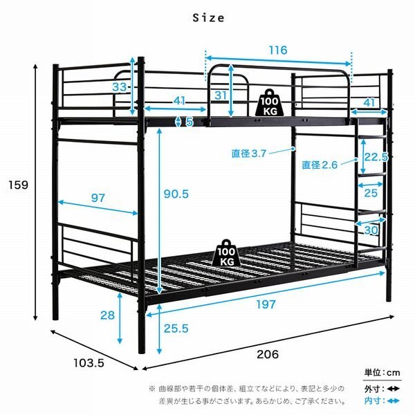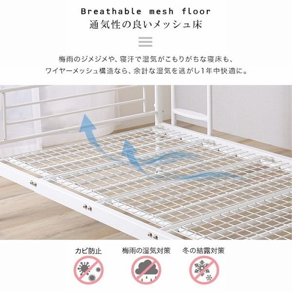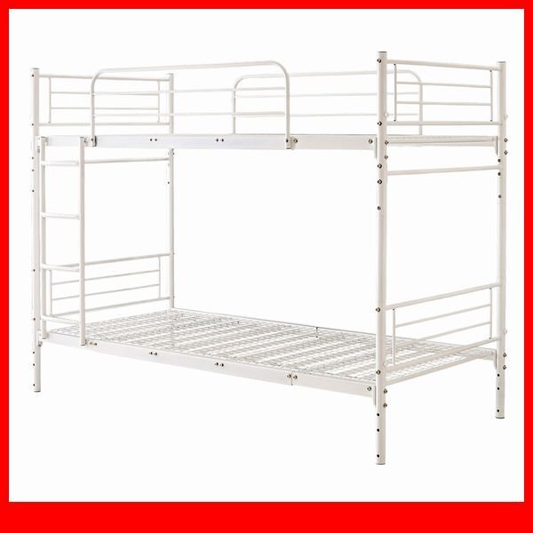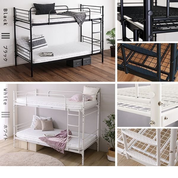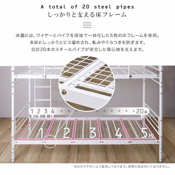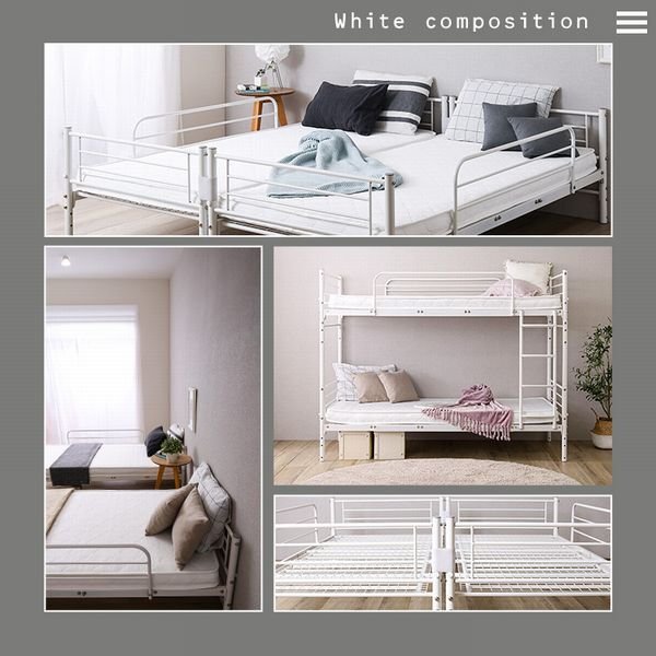 並べて連結もできる パイプ2段ベッド! 上下を分割することができ、シングルベッドや、連結してキングベッドとしてもお使いいただけるので、お子様の成長やライフスタイルの変化に合わせて長くお使いいただけます。 サイドにワイヤーを付けなくても頑丈な作りになっていますので、見た目もすっきりとしていてスタイリッシュです。 上段には両方にサイドフレームがありますので、落下することはありません。 壁傷防止のネジ頭キャップが付いていますので、賃貸でも安心してお使いいただけます。 |