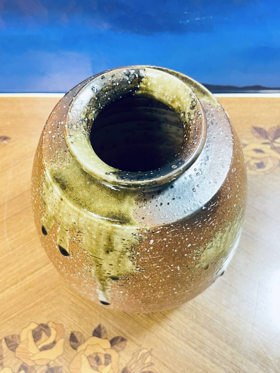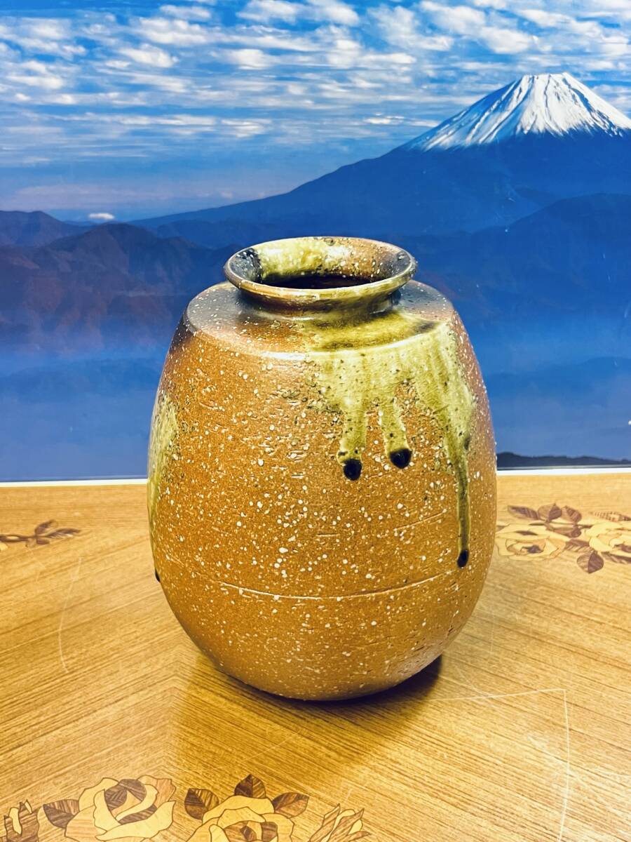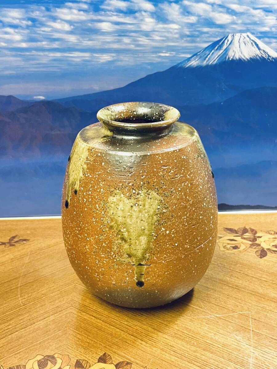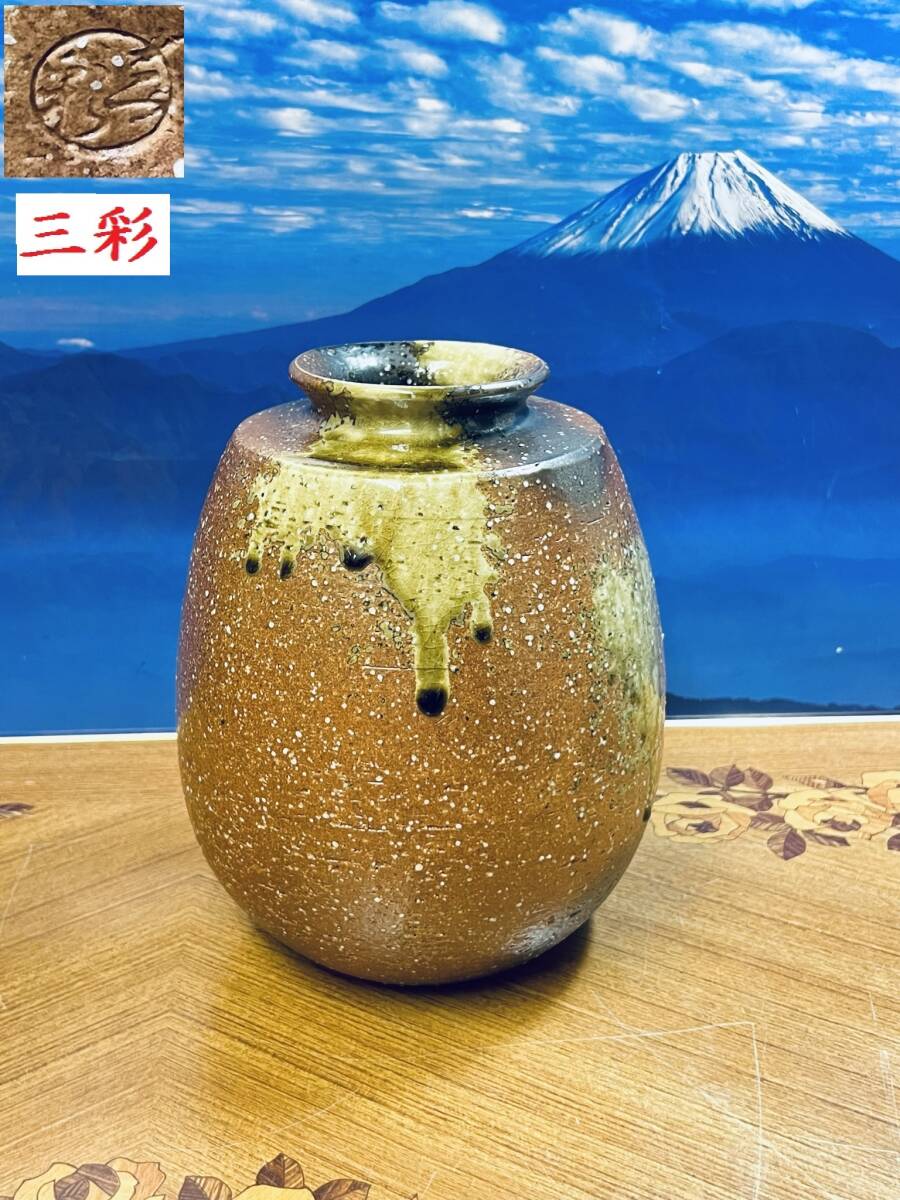 日本の陶磁 信楽焼 在銘 【三彩 花瓶】 陶器 壷 ツボ 壺 花入れ 花器 名人作 銘が有り 中古 美品 工芸品 美術品 滋賀県 陶芸 訳有り