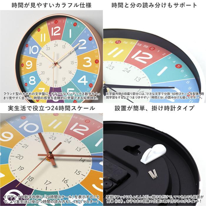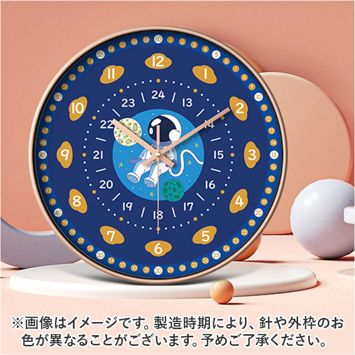 | 商品説明 | ・・大きく見やすい文字盤で、時計の読み方を楽しくお勉強!壁に掛けて、自然に時間が学べる「子ども 知育掛け時計」が新登場。 ・【時間が見やすいカラフル仕様】 ・ラウンド型の大きめの文字盤に、カラフルなインデックス数字をくっきり見やすく並べた、時間の感覚を直観的に学習できる知育時計。 ・【時間と分の読み分けもサポート】 ・文字盤外側の目盛り部分には、小さな文字で分数・60秒スケールを配置。時間学習をする上でつまづきやすい「時間と分」の読み分けも優しくサポート。 ・【実生活で役立つ24時間スケール】 ・インデックス数字内側に「24時間スケール」を表示することで、より実生活に役立つ時間の読み方もしっかりマスター! ・【設置が簡単、掛け時計タイプ】 ・壁掛けフックにちょこんと引っ掛けるだけで、ママさんでも設置が簡単(※1)。お子さまの目線の位置に取り付けるのがポイント! ・【おやすみ時間を妨げない連続秒針】 ・静かな場所や夜中でも時計のカチコチ音が気にならない「連続秒針」を採用。秒針の音が気になって眠れなくなってしまうお子さまでも安心。 ・【お部屋に合わせて選べるデザイン】 ・インテリアに鮮やかに映えるシンプルデザイン(タイプA・B)や、恐竜や宇宙飛行士の絵柄が楽しいポップなデザイン(タイプC・D・E)まで、選べるカラーバリエーション。 ・【お子さまの“はじめての時計”に】 ・リビングやプレイルームなど、お子さまの目に触れる場所に設置することで、時間の読み方が自然に身に付く♪アナログ時計に馴染みのない現代っ子にオススメ。 ・※単3形乾電池×1本使用。電池は別売りです。 ・※専用壁掛けフックが付属しています。 |
