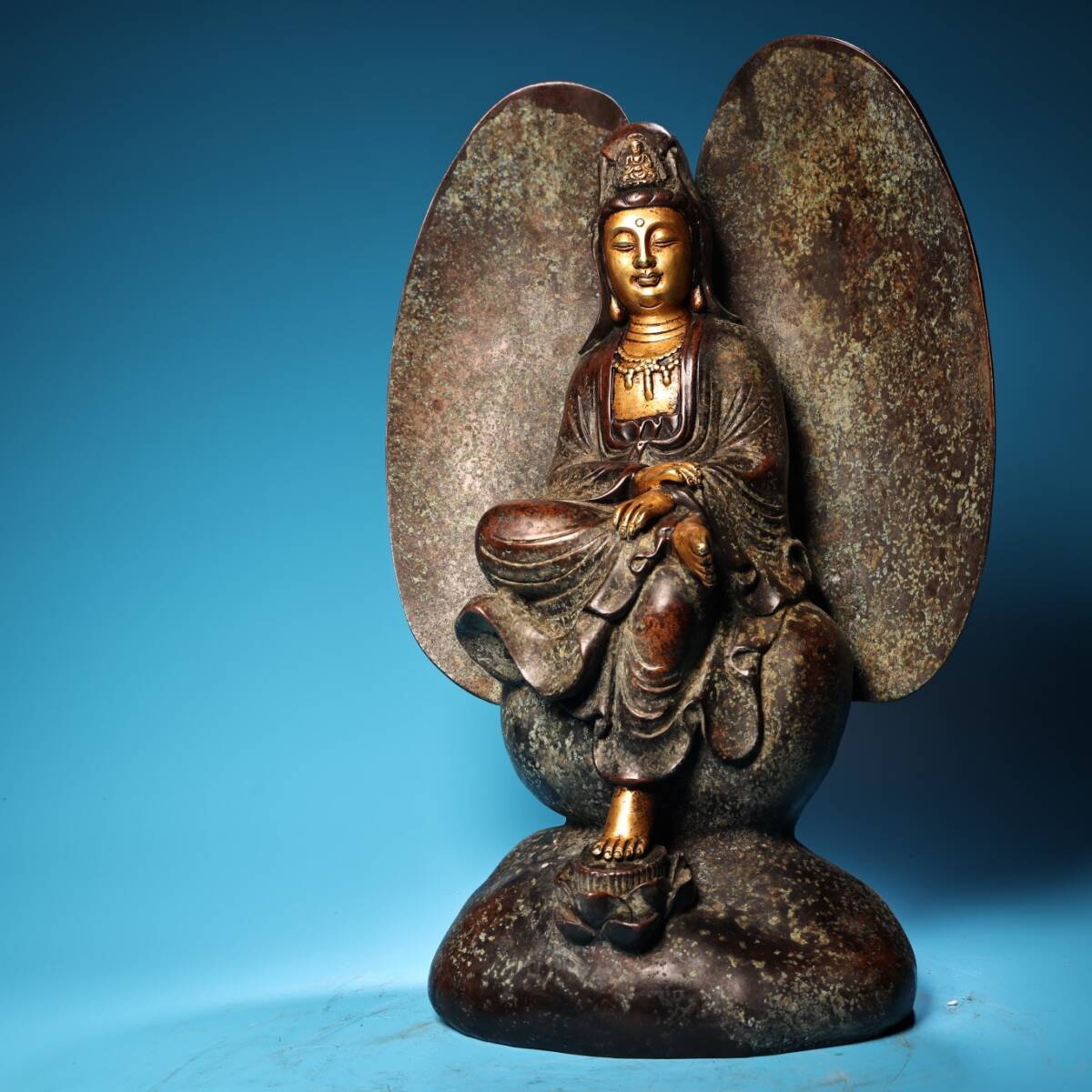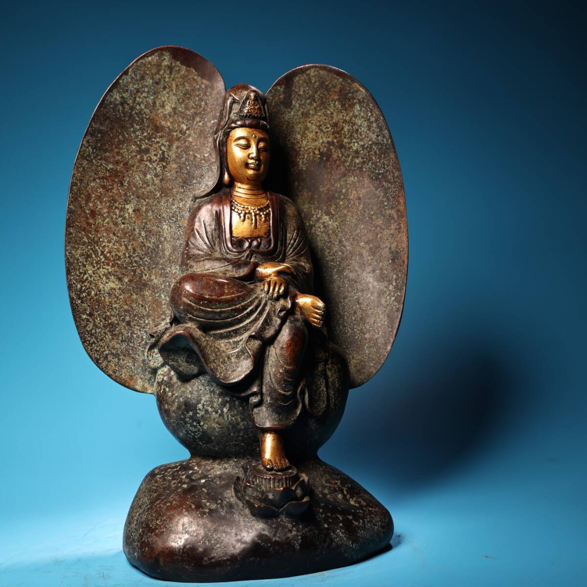 人間国宝209276 古代木工 彫刻品 【希少な明代の純銅製高浮き彫り金箔天使観音菩薩像】中国骨董 伝世家珍 時代物 本物 旧蔵 珍品