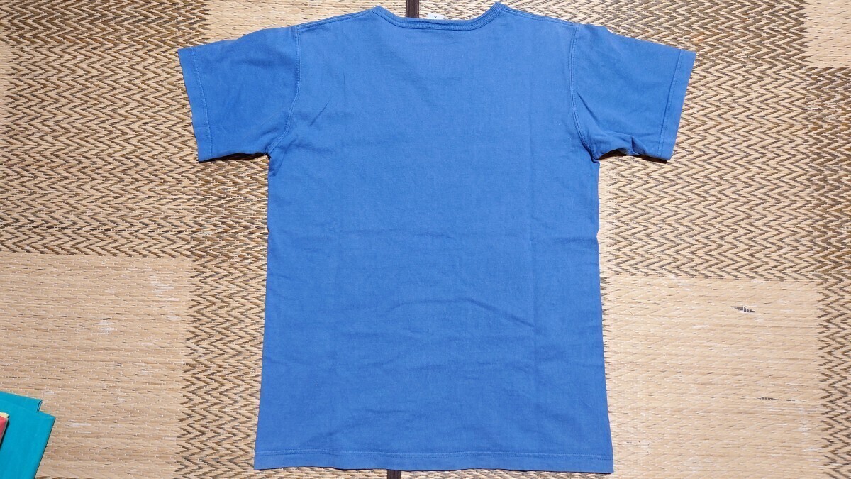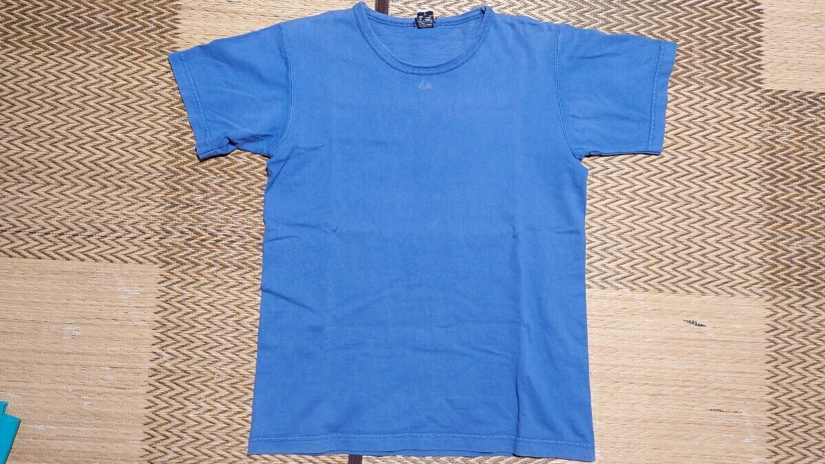 着用による全体的な色褪せと首の下に色抜けがあります。これからもっと着込んで色落ちすれば、周りと馴染んで目立たなくなるかもしれませんがご注意ください。