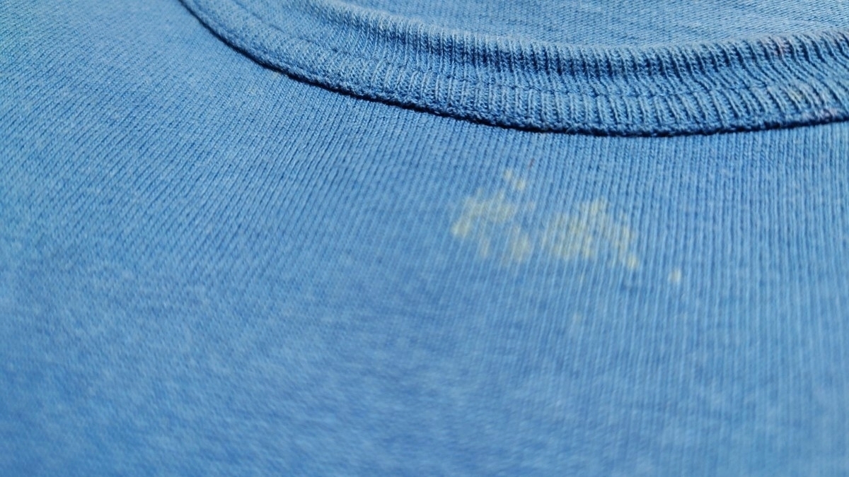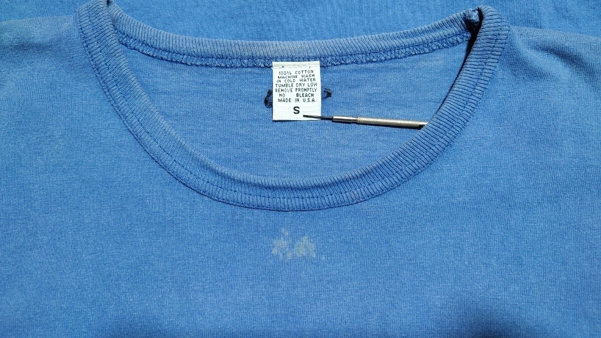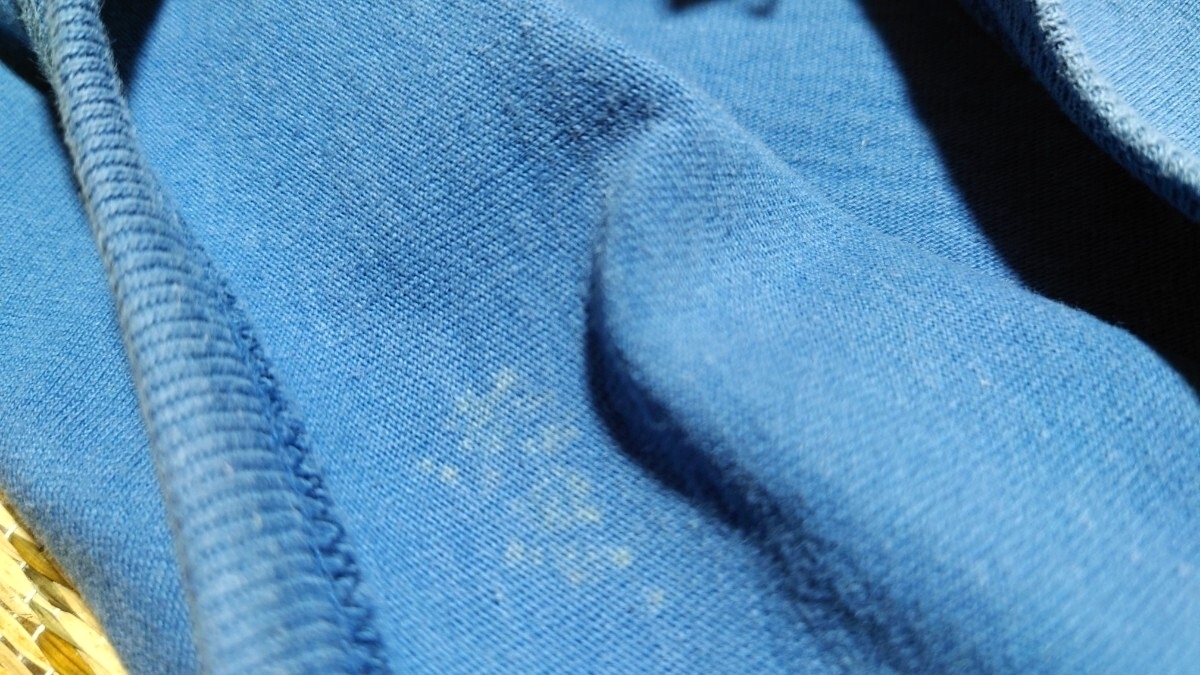 着用による全体的な色褪せと首の下に色抜けがあります。これからもっと着込んで色落ちすれば、周りと馴染んで目立たなくなるかもしれませんがご注意ください。