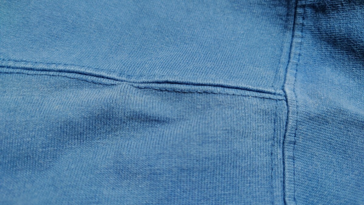 良い意味でがさっと乾いた質感で、バインダーネック、2本針縫製とディテールも拘っています。