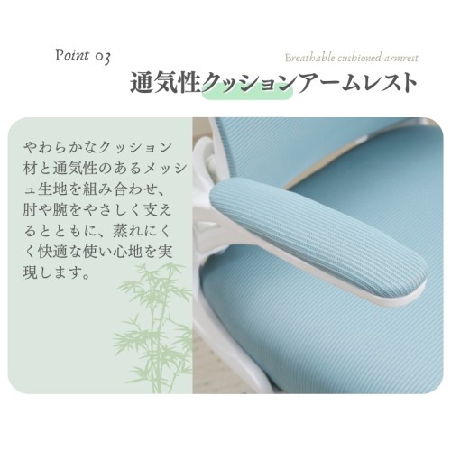 • 3.【通気性クッションアームレスト】やわらかなクッション材と通気性のあるメッシュ生地を組み合わせ、肘や腕をやさしく支えるとともに、蒸れにくく快適な使い心地を実現します。