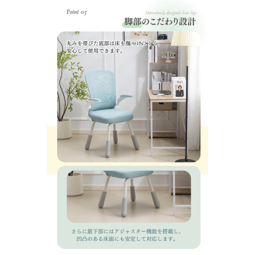 • 5.【脚部のこだわり設計】丸みを帯びた底部は床を傷つけにくく、安心して使用できます。さらに最下部にはアジャスター機能を搭載し、凹凸のある床面にも安定して対応します。