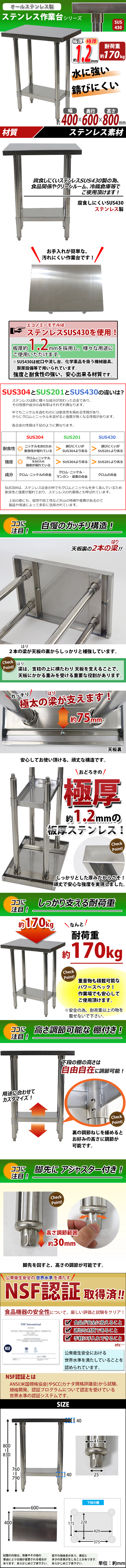 | 商品紹介 | ●水に強く錆びにくい、ステンレス製の作業台です。 ●腐食しにくいステンレスSUS430製です。 ●厨房やクリーンルーム等でご使用頂けます。 ●お手入れが簡単な、汚れにくい作業台です。 ●安心してお使い頂ける、頑丈な構造です。 ●高さ調節が可能な棚付き。 ●脚先にはアジャスター付き。 ●シリーズでサイズを豊富にご用意しております。 ※こちらの商品は、組立て式です。 ●新品商品ではありますが、輸入商品の為、多少の擦り傷などがある場合がございますので、ご納得の上ご購入下さいませ。 ●ご購入後、お客様ご都合によるご返品、ご返金等は一切お受け致しておりません。 ●本商品を使用した際に発生したトラブル、事故につきまして、当社は一切の責任を負いません。ご使用に関しましては、全て自己責任にてお願い致します。 |
