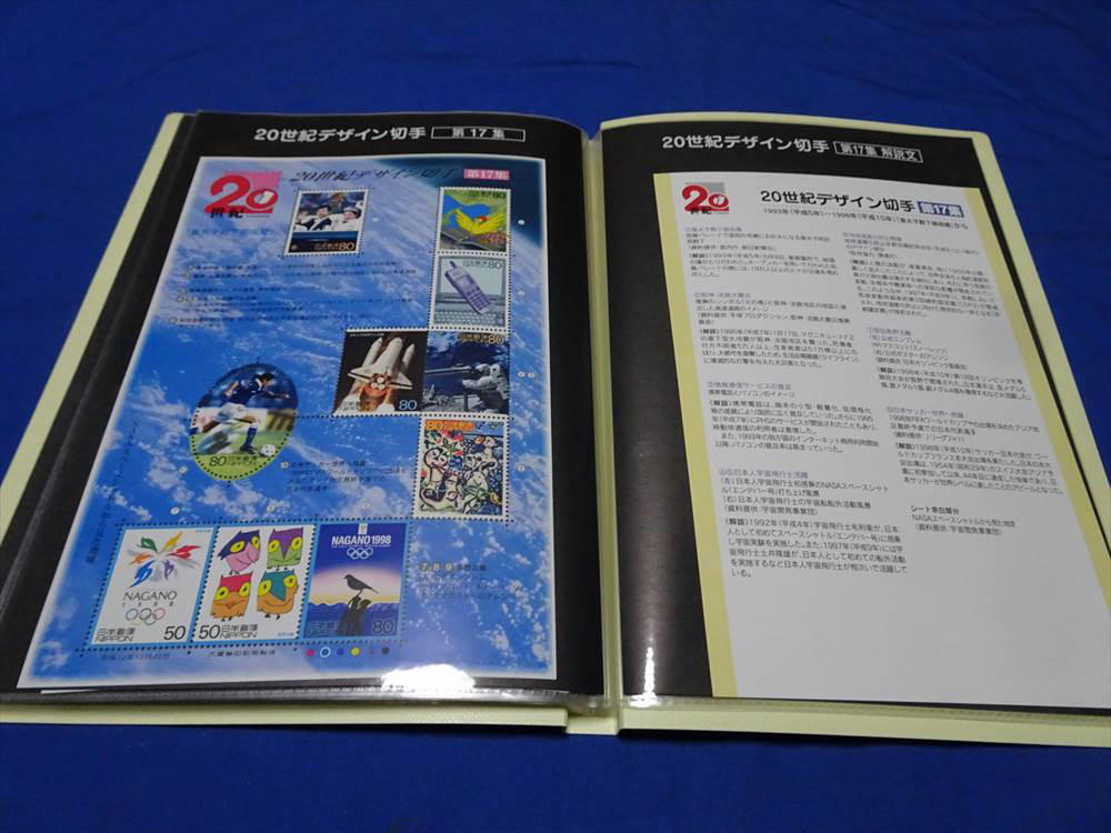 1999年から2000年にかけて17集発行された20世紀デザイン切手。そのフォルダと全未使用シート、解説文のセットです。さらに切手に熊本中央局の2000年1月1日のスタンプが押印されている台紙も入っています。