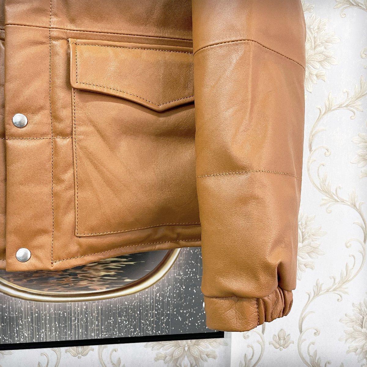 ヨーロッパ製・高級レザー・グースダウンジャケット。紳士定番のレザージャケットにワンポイントのアクセントを加えたお洒落な1枚。