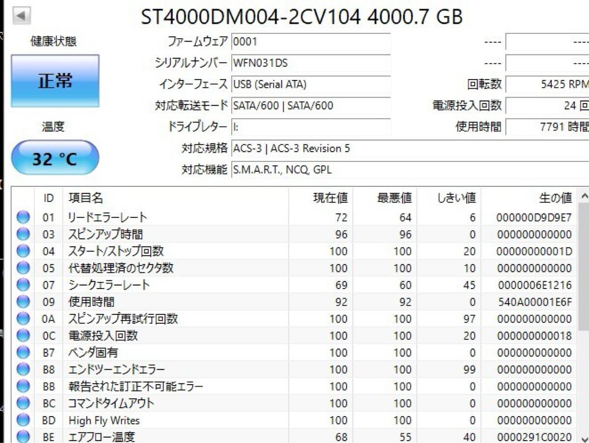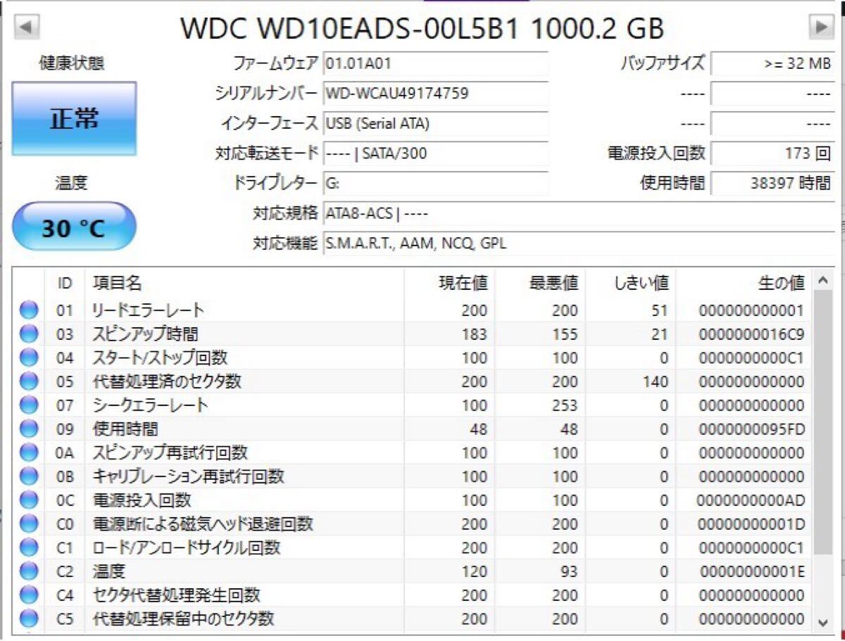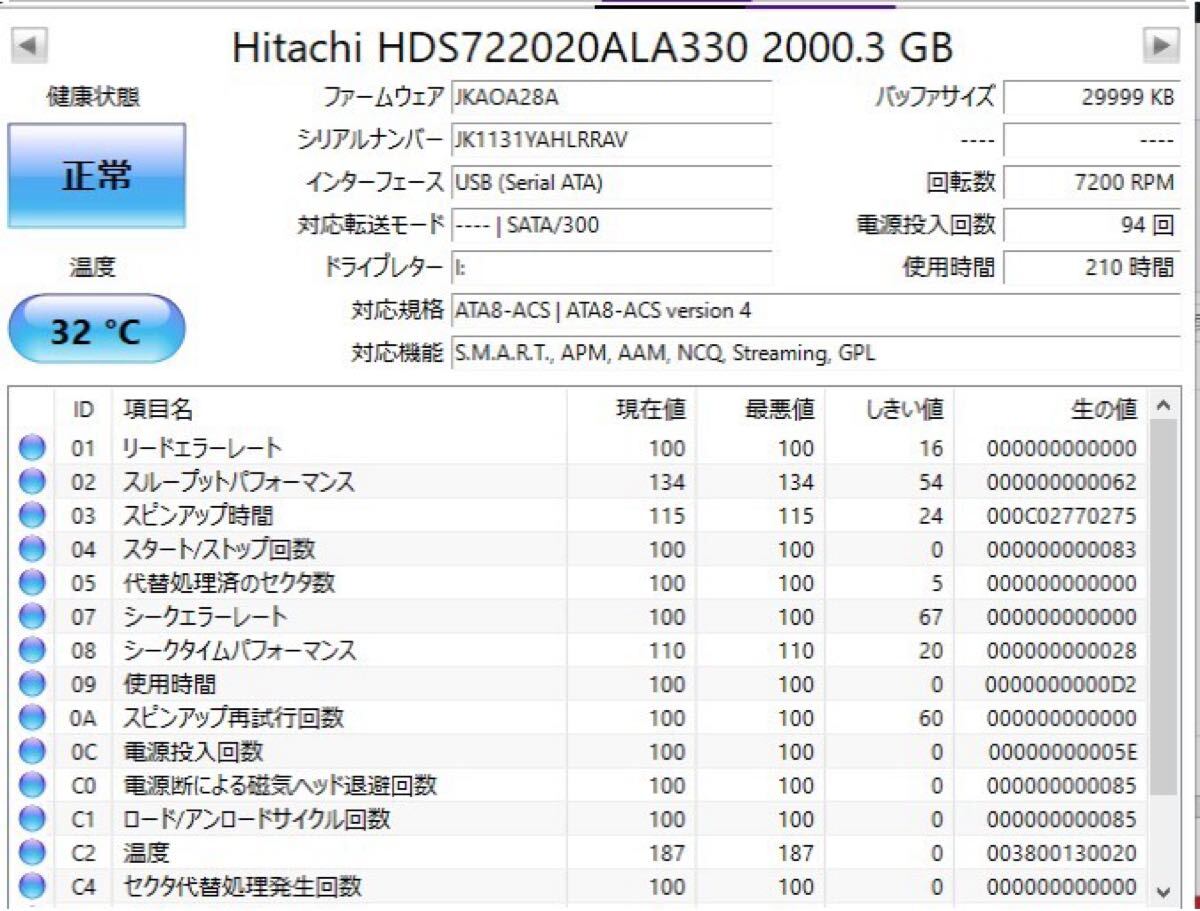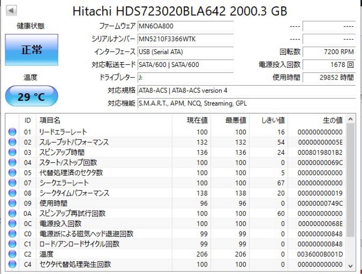 クリスタルディスクインフォの障害予兆情報(S.M.A.R.T.)に異常がないことを確認しています。