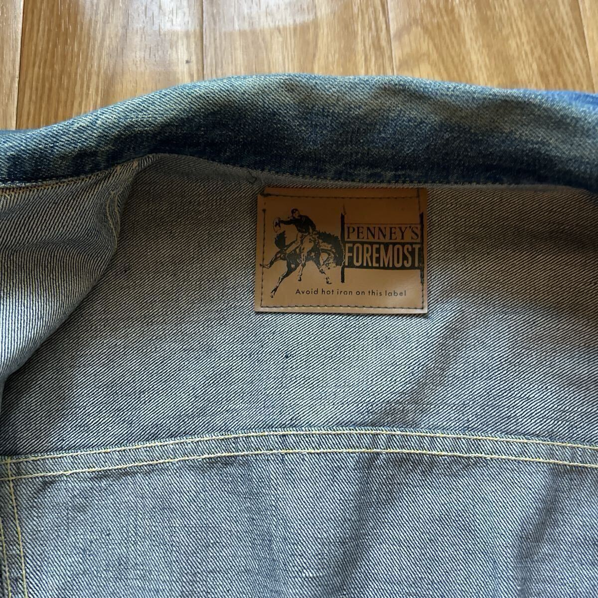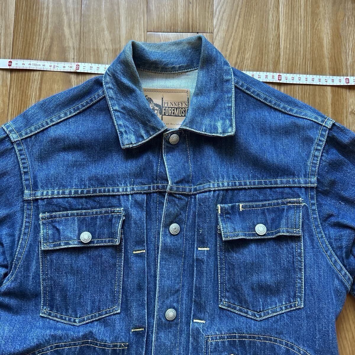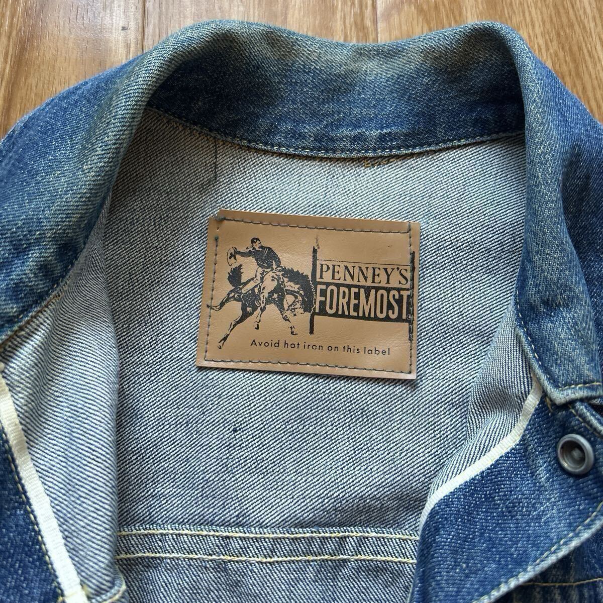 60年代製とみられるペニーズForemost のデニムジャケットです。リーバイス2ndによく似たデザインとサイズ感でフロントには赤耳デニムが使われています。スナップボタン、ステッチ、ビニールのパッチ等全て揃っています。特にほつれやリペアもありません。イエローステッチの色も鮮やかです。肩幅50センチ リーバイスの38より少し小さめの着用感です。