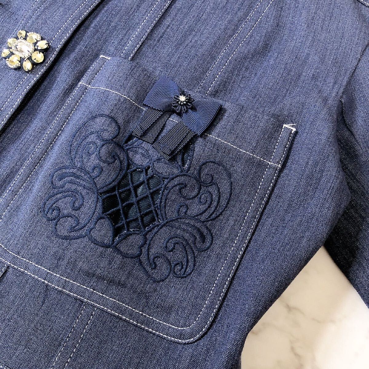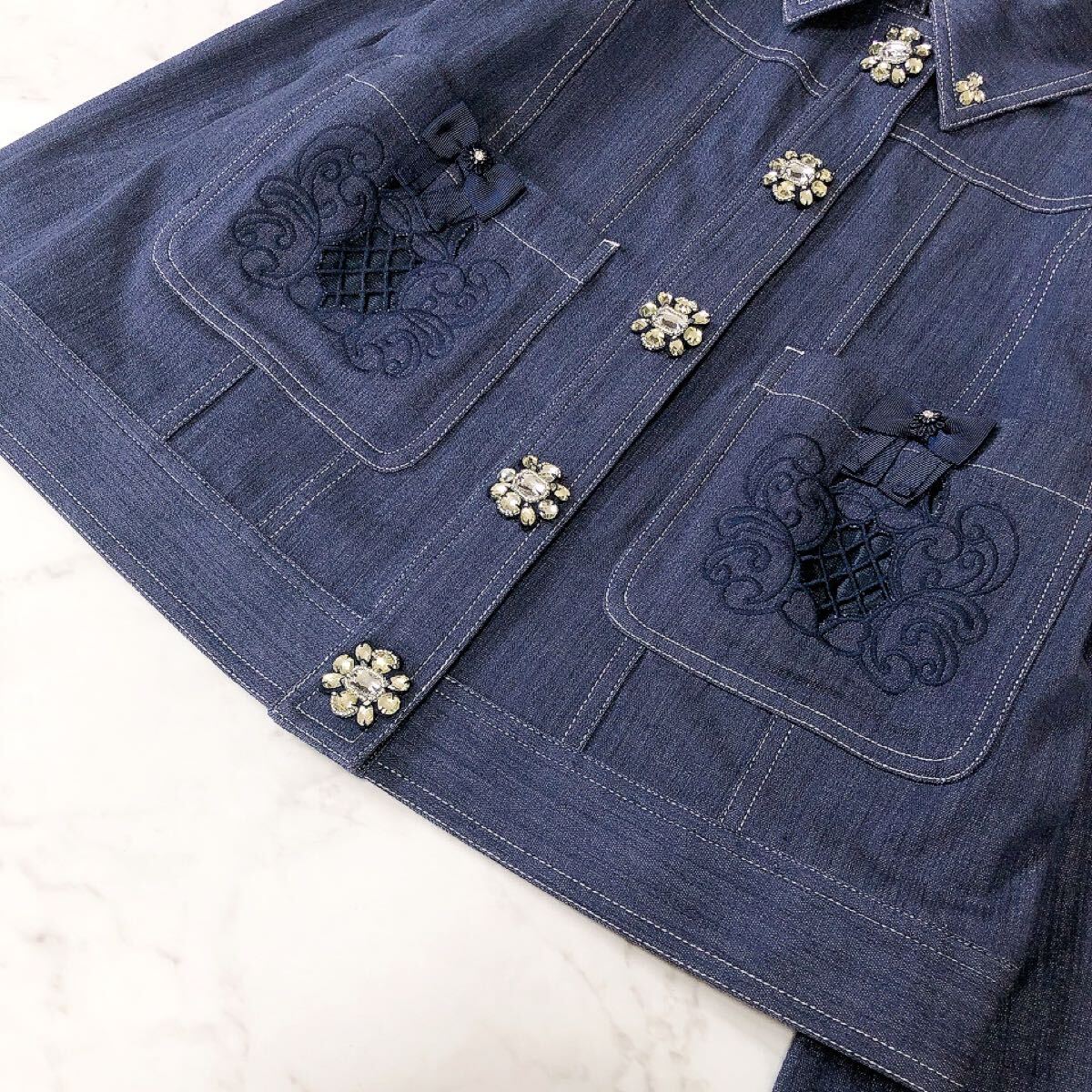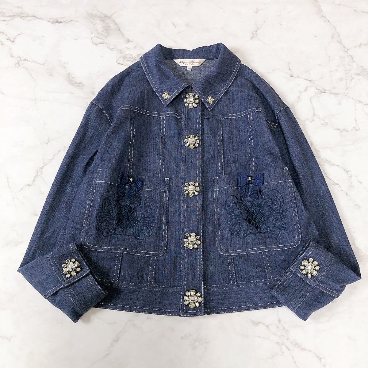 ビジューボタンや刺繍、リボン装飾が華やかなデニムジャケット