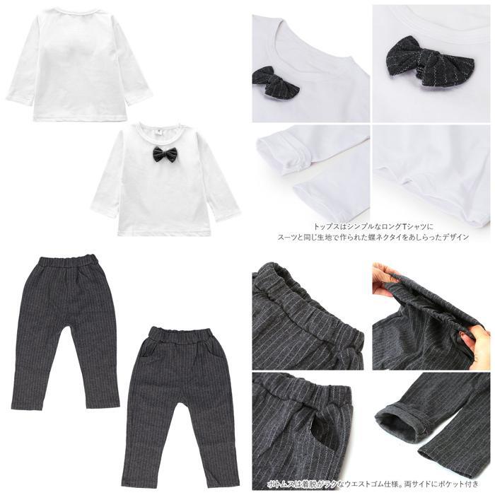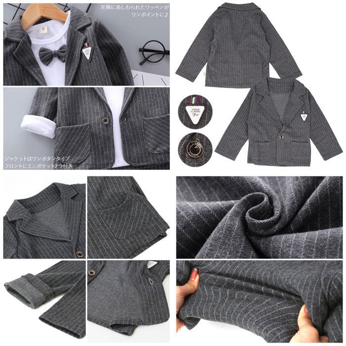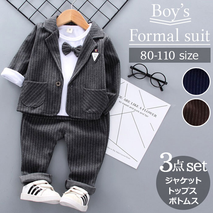 商品説明 | ・男の子用、長袖フォーマルスーツ3点セットが発売。 ・ジャケットはワンボタンタイプ。フロントにミニポケット2つ付き。 ・左胸にあしわられたワッペンがワンポイントに♪ ・トップスはシンプルなロングTシャツにスーツと同じ生地で作られた蝶ネクタイをあしらったデザイン。 ・ボトムスは着脱がラクなウエストゴム仕様。両サイドにポケット付き。 ・伸縮性のある肌触りの良い生地を採用。スーツなのに軽量な着心地。 80cmサイズから110cmサイズまで展開しているから、兄弟でお揃いもかっこいい! |