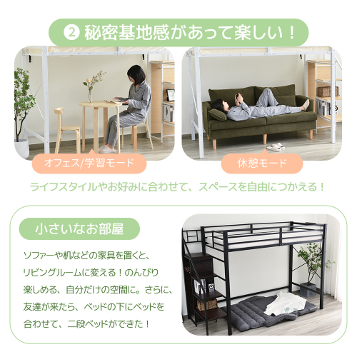 • 【秘密基地感があって楽しい】ソファーや机などの家具を置くと、リビングルームに変えます。さらに、友達が来たら、ベッドの下にベッドを合わせて、二段ベッドに変身します。