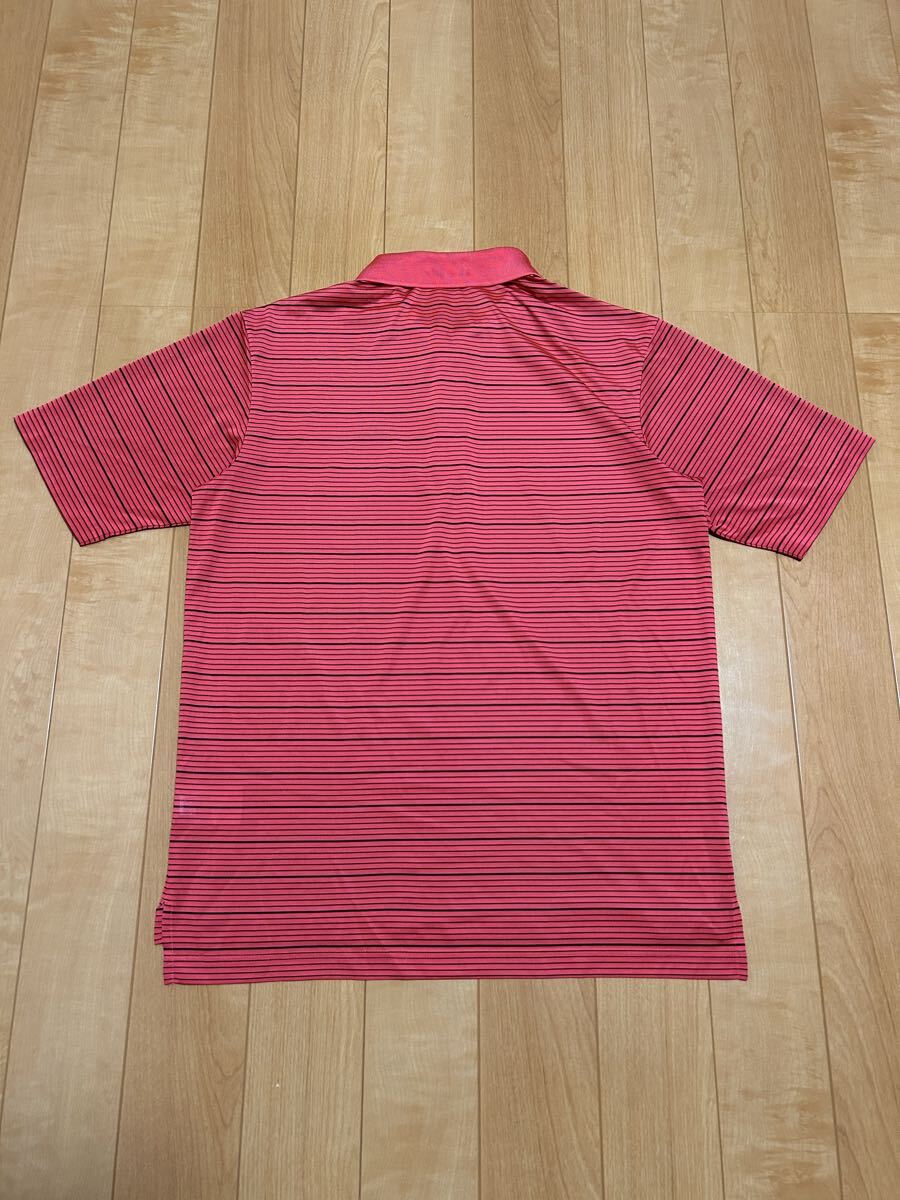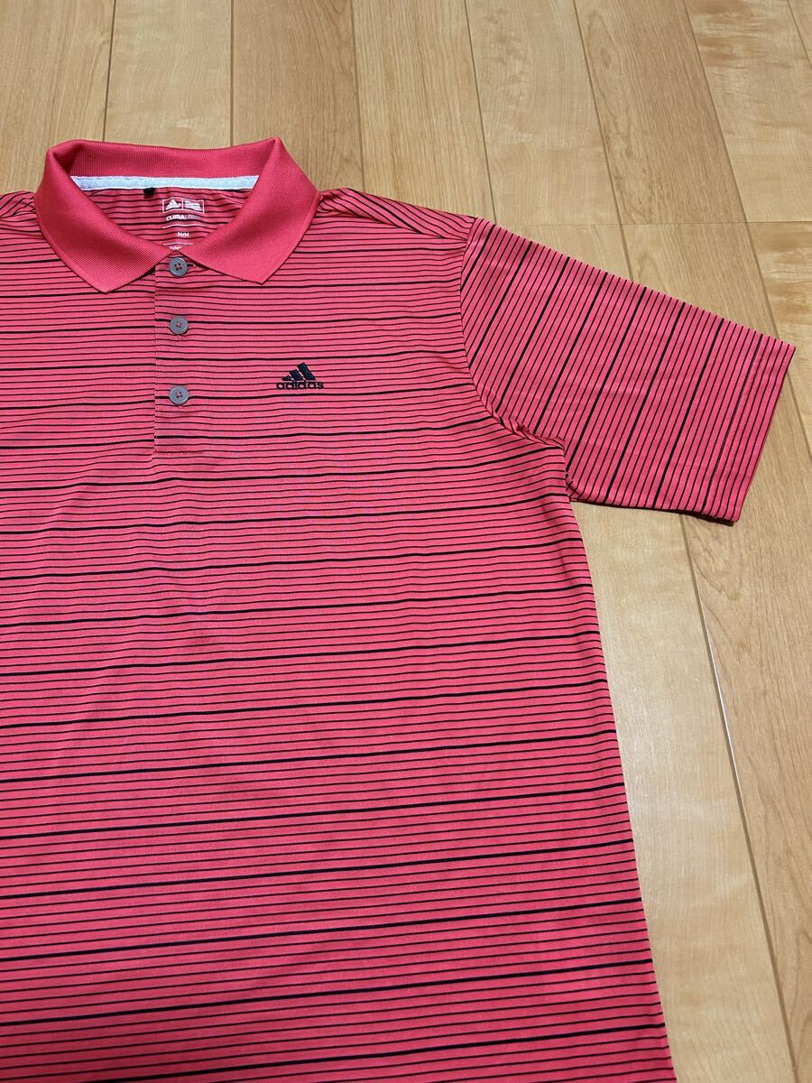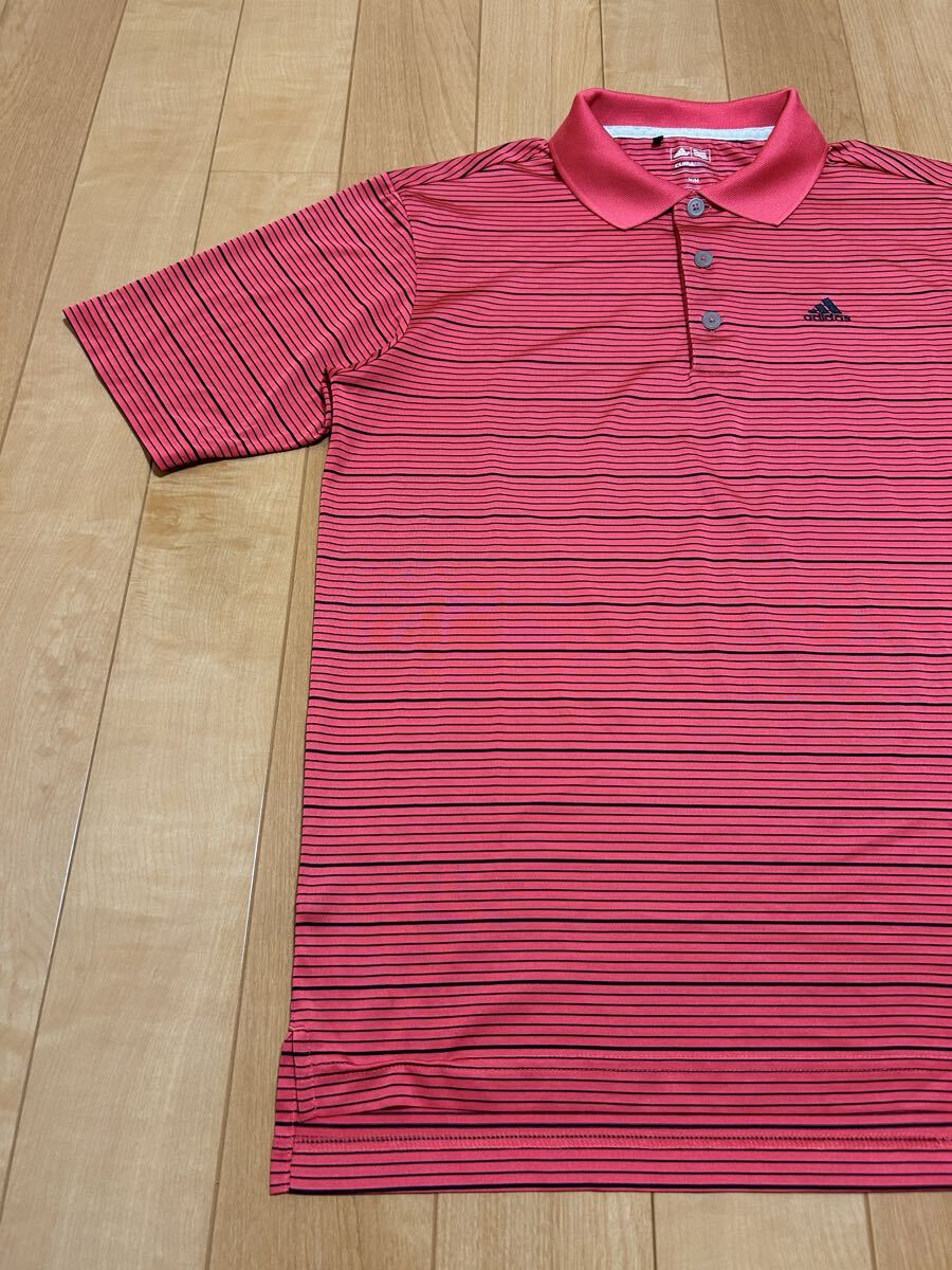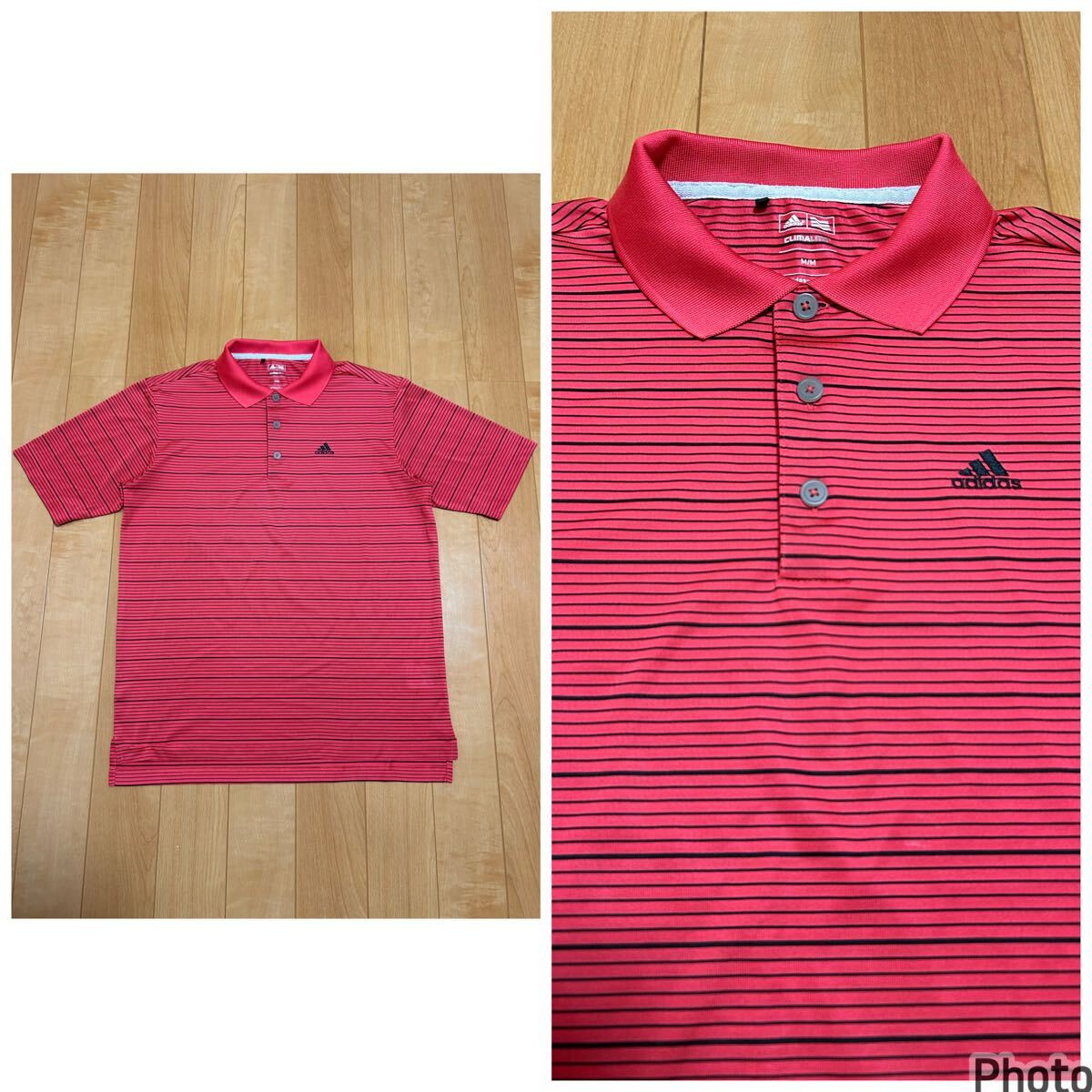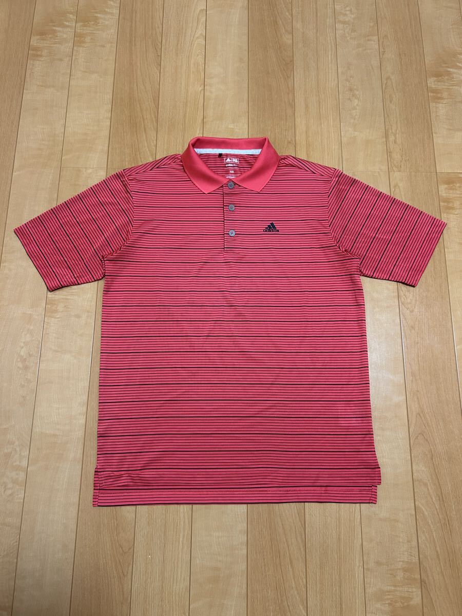 着用少な目.美品☆テーラーメイド社製/アディダス.ゴルフ サイズM大き目 ストレッチ性.速乾ドライ半袖ポロシャツ 細ボーダー総柄&ロゴ刺繍