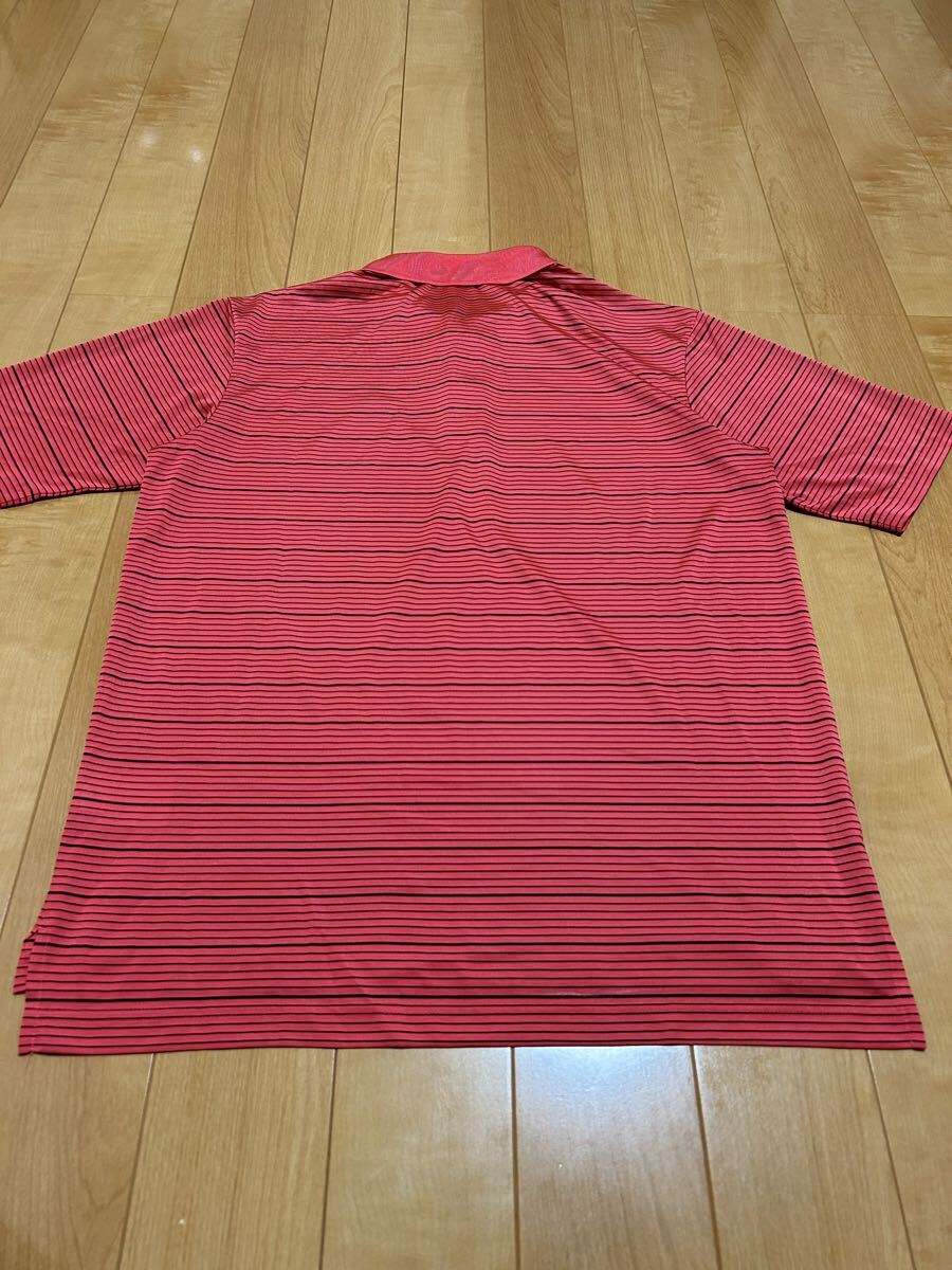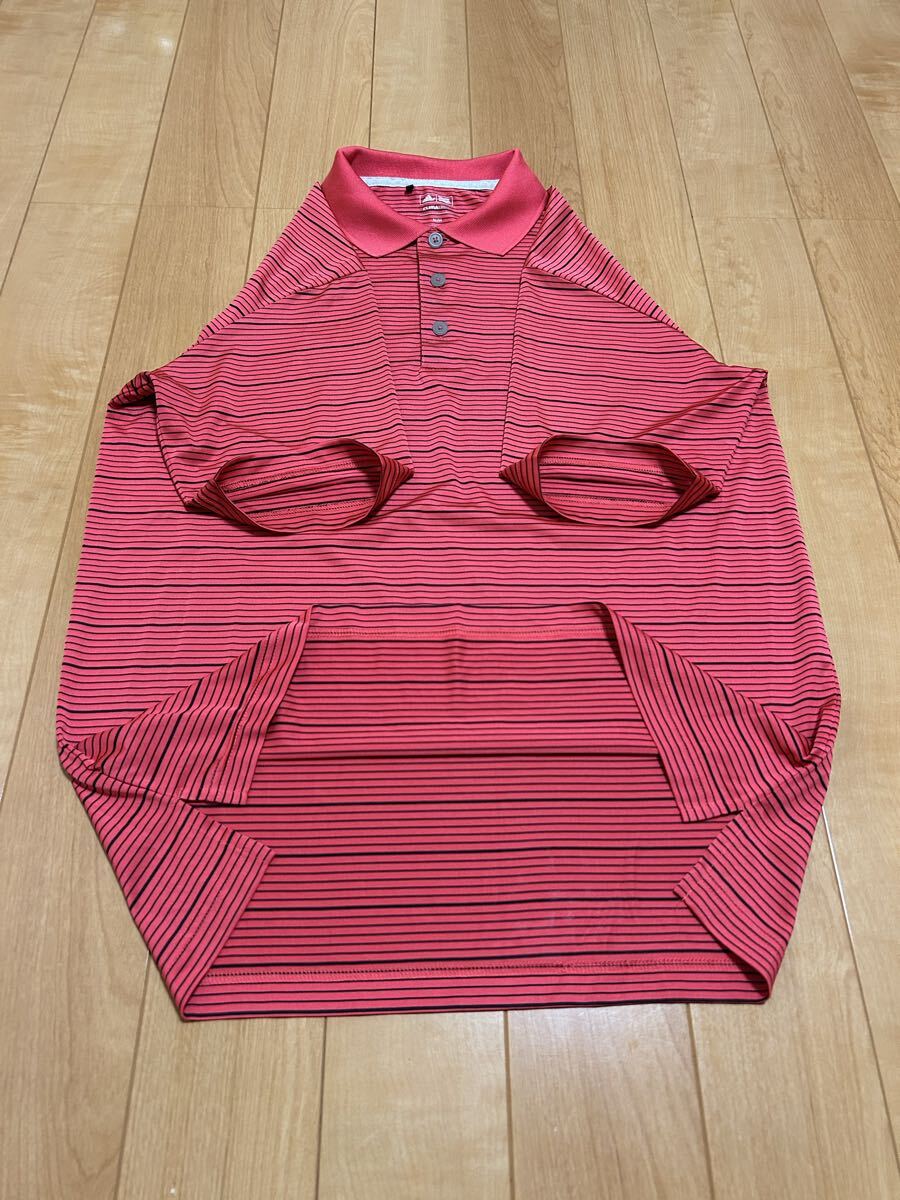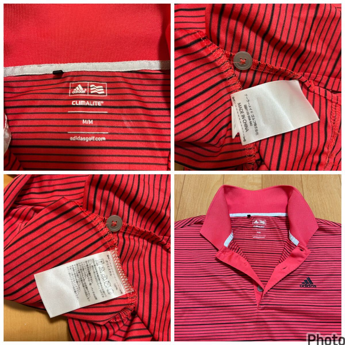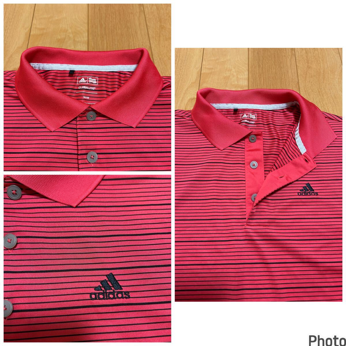 着用少な目.美品☆テーラーメイド社製/アディダス.ゴルフ サイズM大き目 ストレッチ性.速乾ドライ半袖ポロシャツ 細ボーダー総柄&ロゴ刺繍