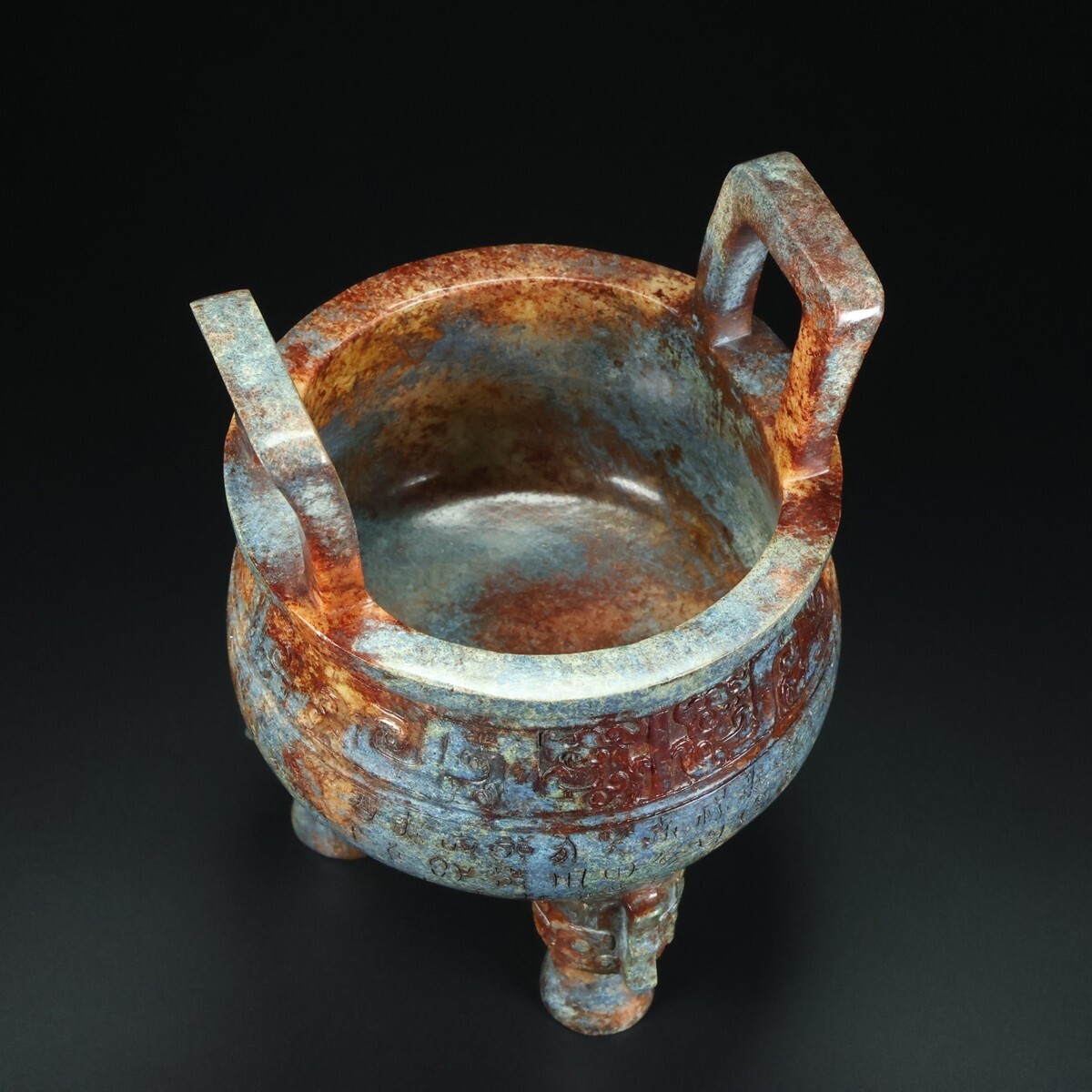 「時代物 和田玉 高古玉彫り 三足鼎立 銘文 双耳香炉」極細工 擺件 中国古賞物 古美術 旧蔵出