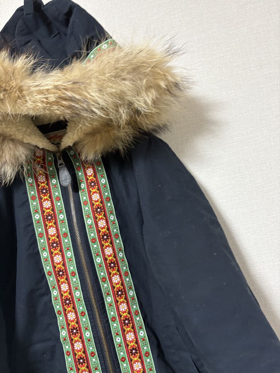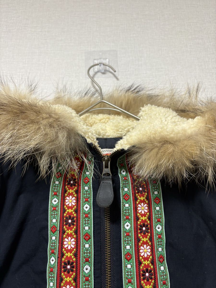 ファー付きフードと装飾的な刺繍が特徴のブラックモッズコート。