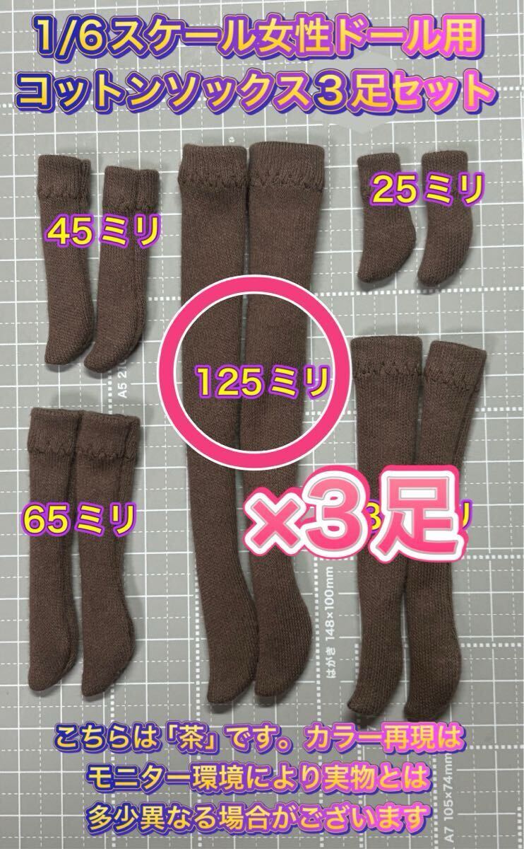 【即決】同じ長さ3足セット★オビツ・ジェニー・リカちゃんなど1/6女性ドール用★コットンソックス茶・約125ミリ