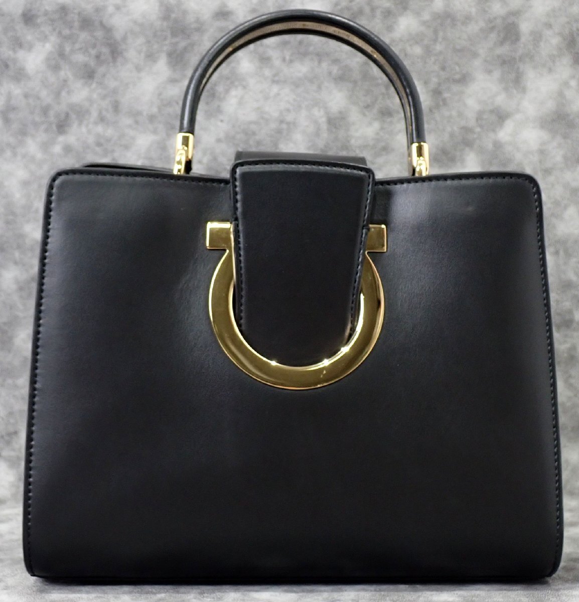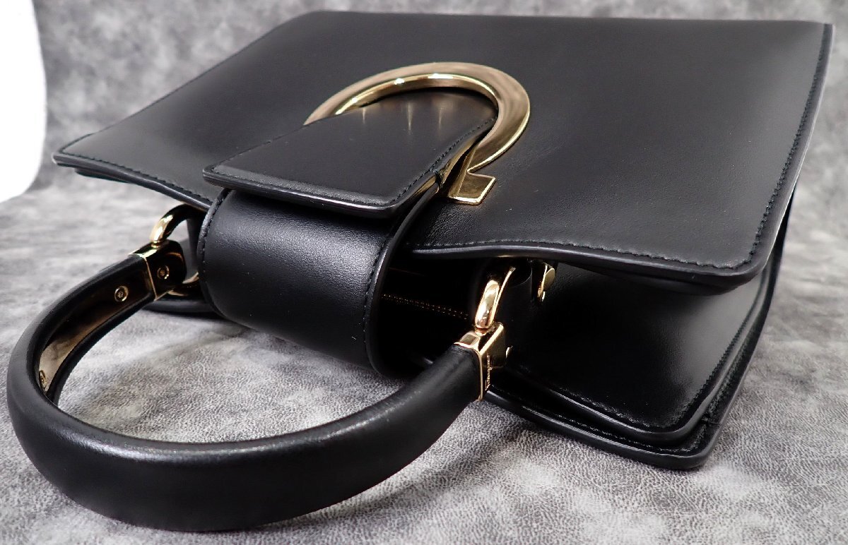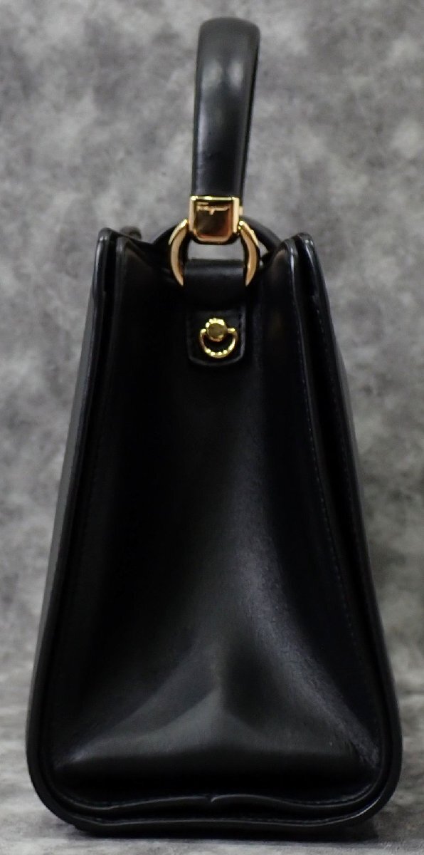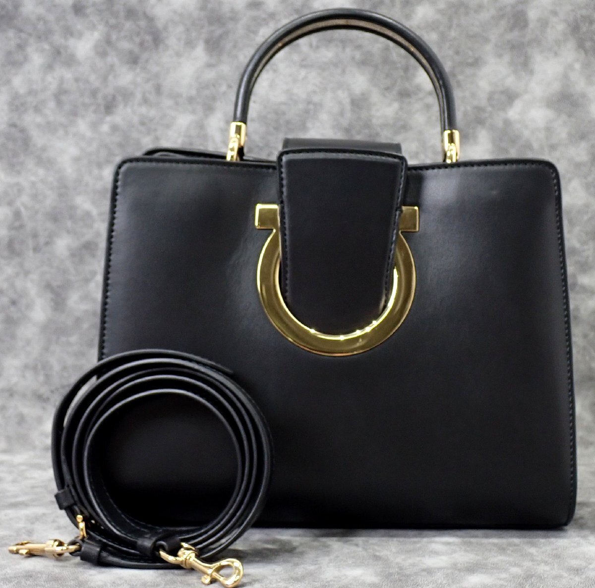 極美品 フェラガモ トップハンドル ケリー型 ガンチーニ レザー 2WAY ショルダーバッグ ハンドバッグ ブラック ゴールド金具 ガンチョ 2041
