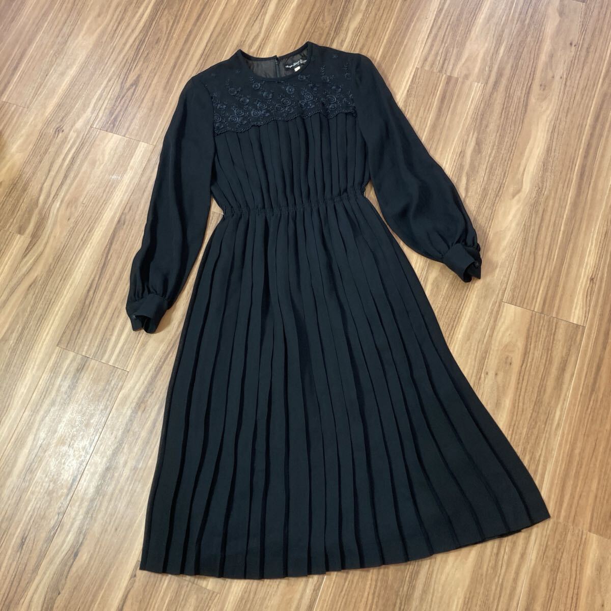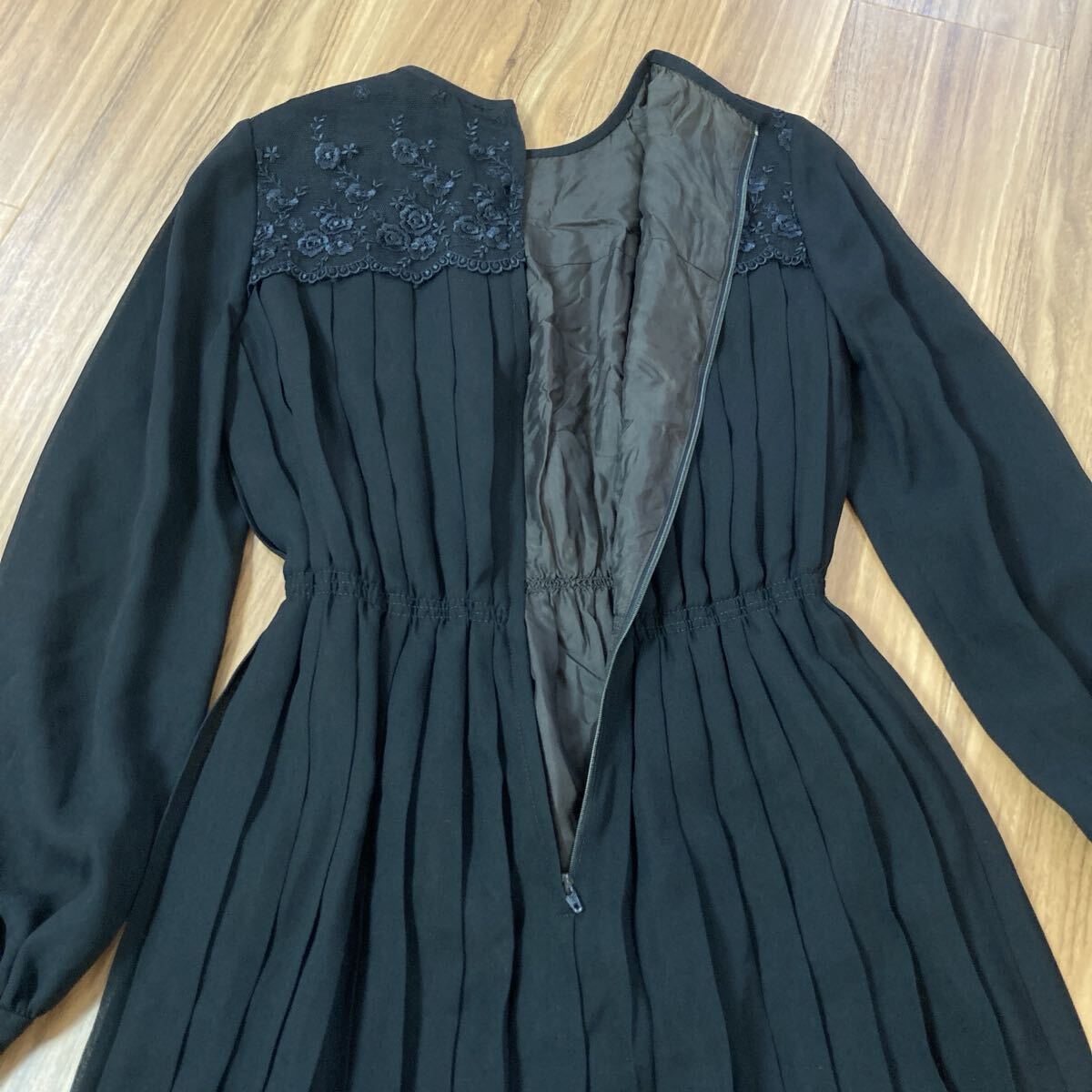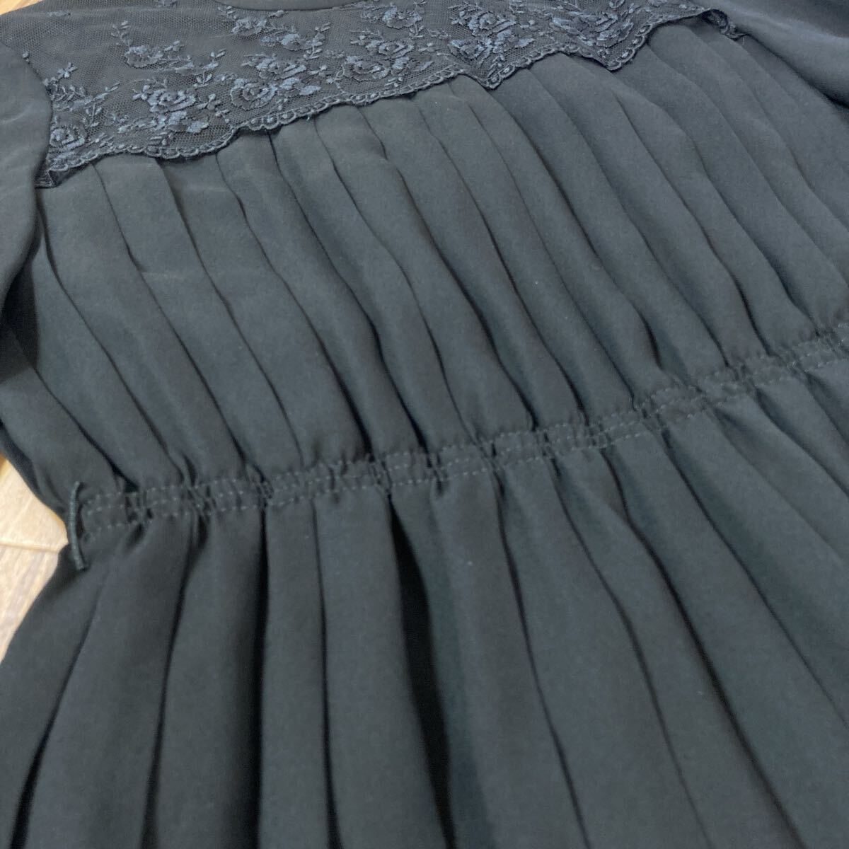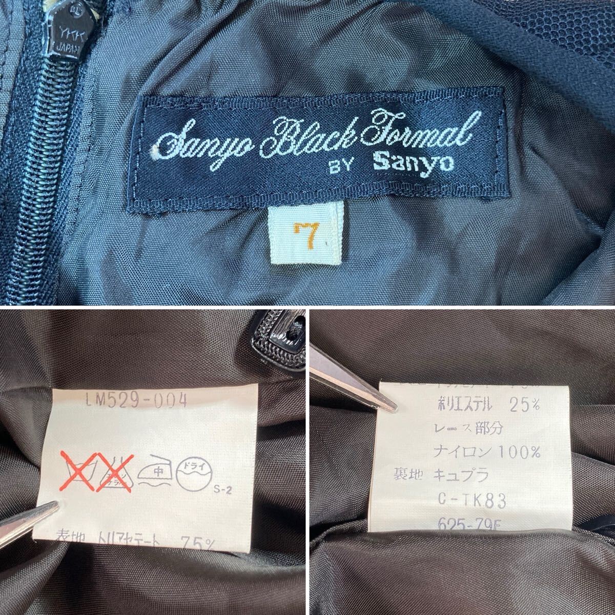 YT3757 Sanyo サンヨー ブラックフォーマル ワンピース サイズ7 プリーツ レース 袖シースルー 裏地あり ウエスト総ゴム 冠婚葬祭 礼服