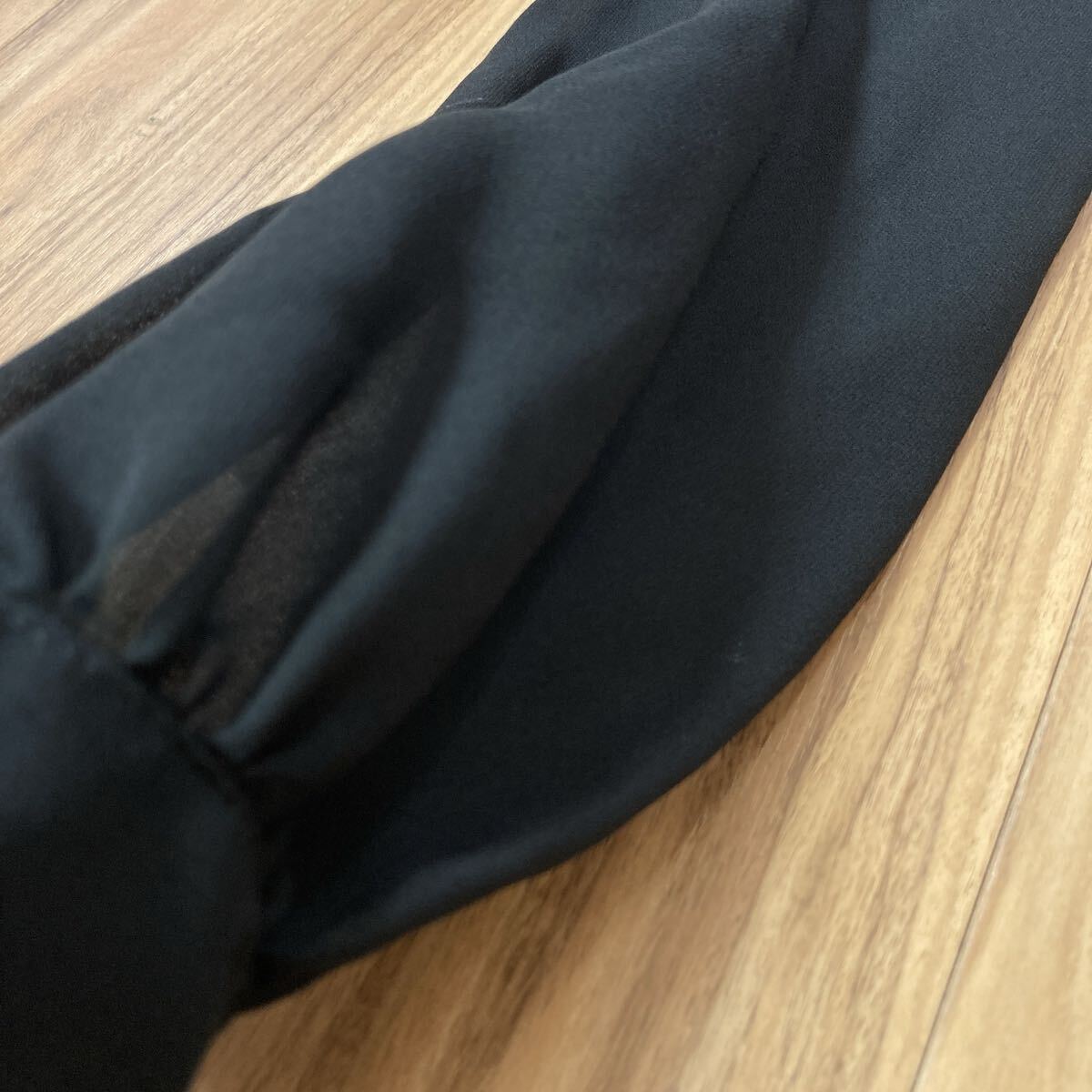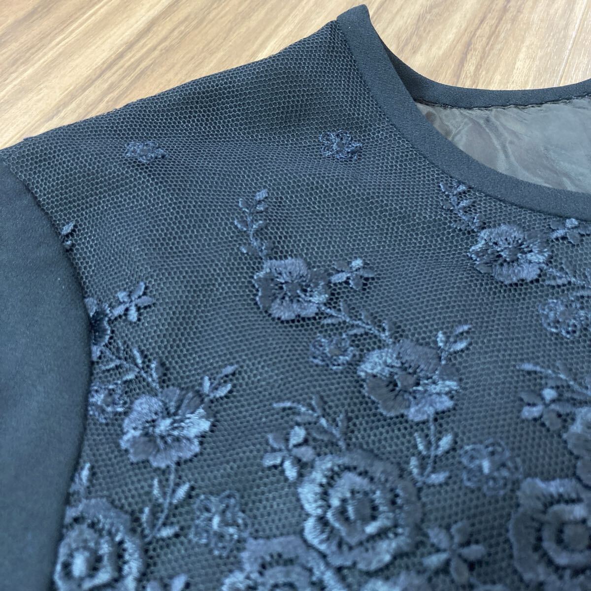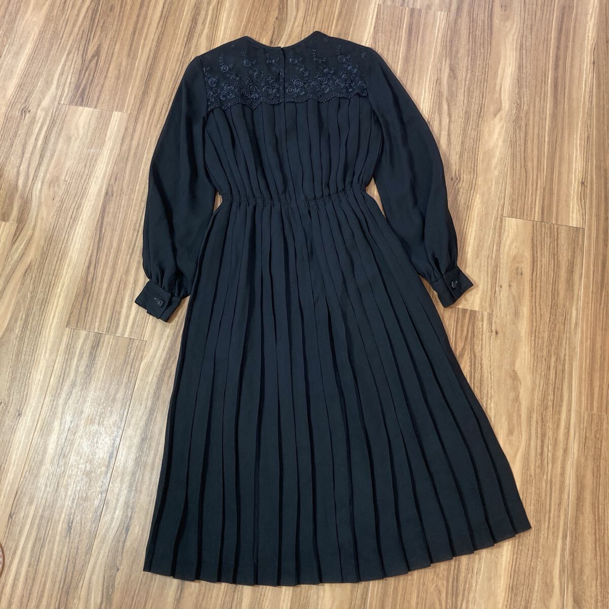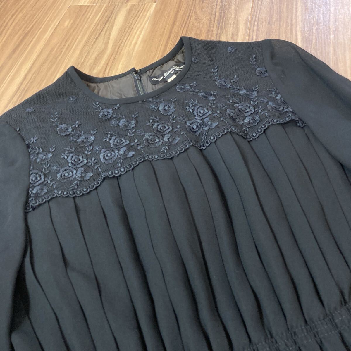 YT3757 Sanyo サンヨー ブラックフォーマル ワンピース サイズ7 プリーツ レース 袖シースルー 裏地あり ウエスト総ゴム 冠婚葬祭 礼服