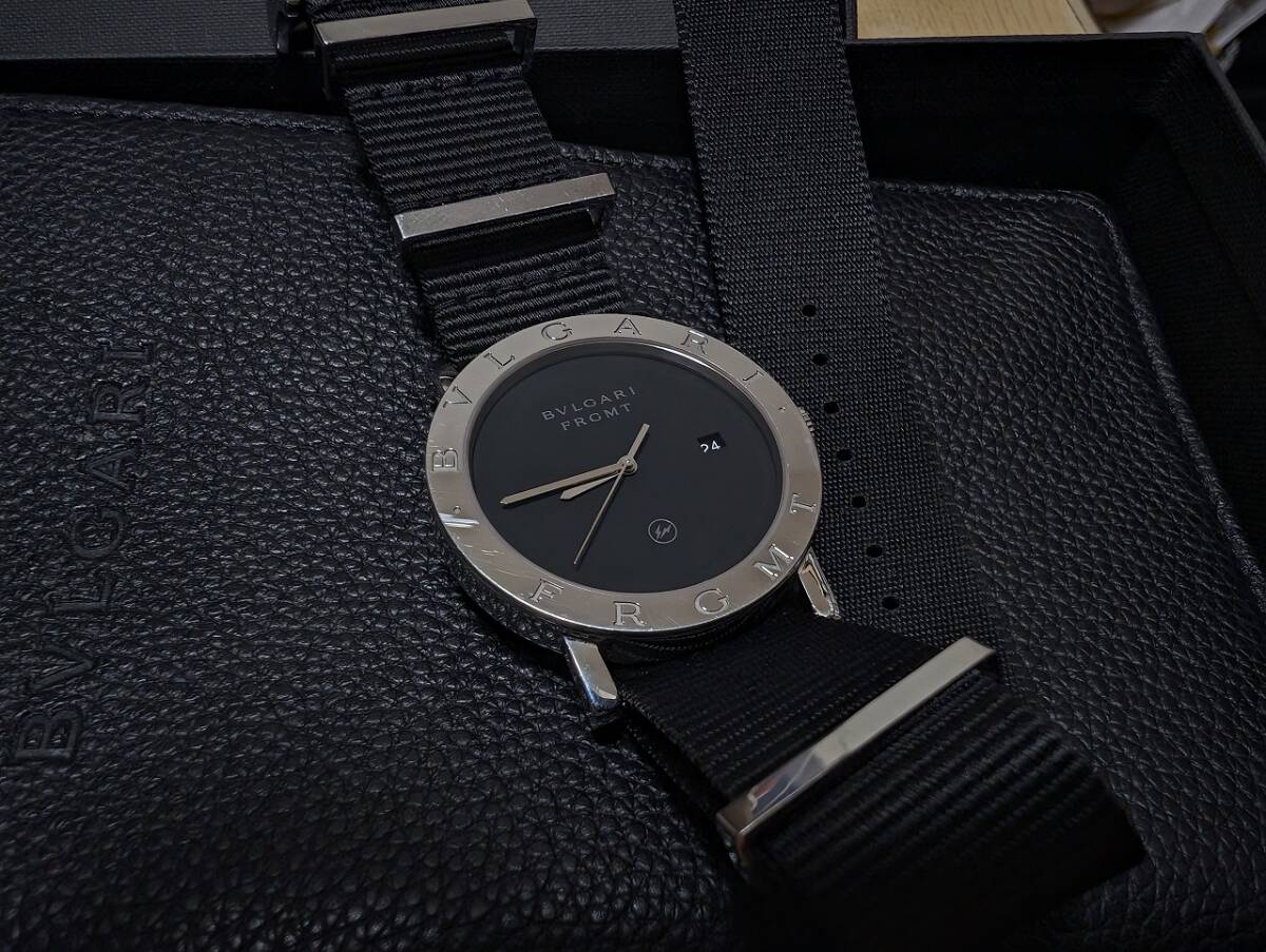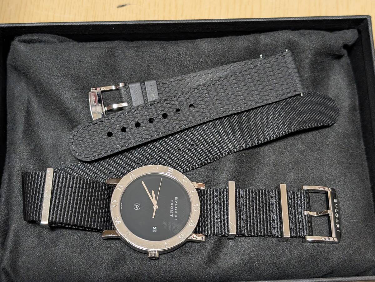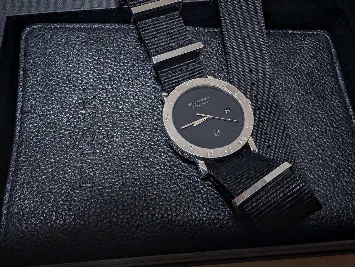 BVLGARI ブルガリブルガリ Fragment フラグメント デザインの限定品です。箱、ケース、保証カードなどついています。本来の付属品に加え、純正ラバーストラップを追加で購入していたのでお付けします。傷は少し多めですが深いものはないと思います。藤原ヒロシさんこだわりの時計です。使用に支障のある部分はないと思います。