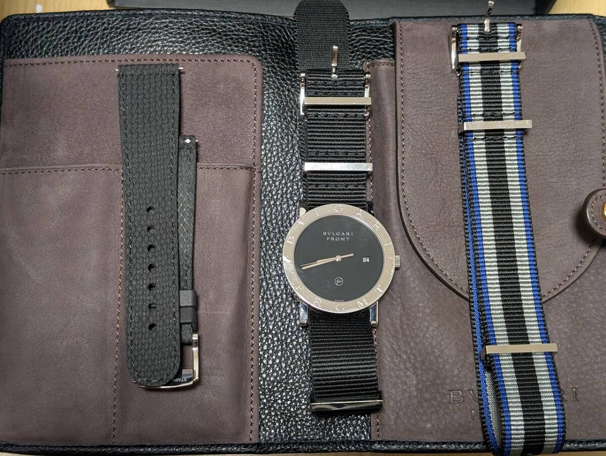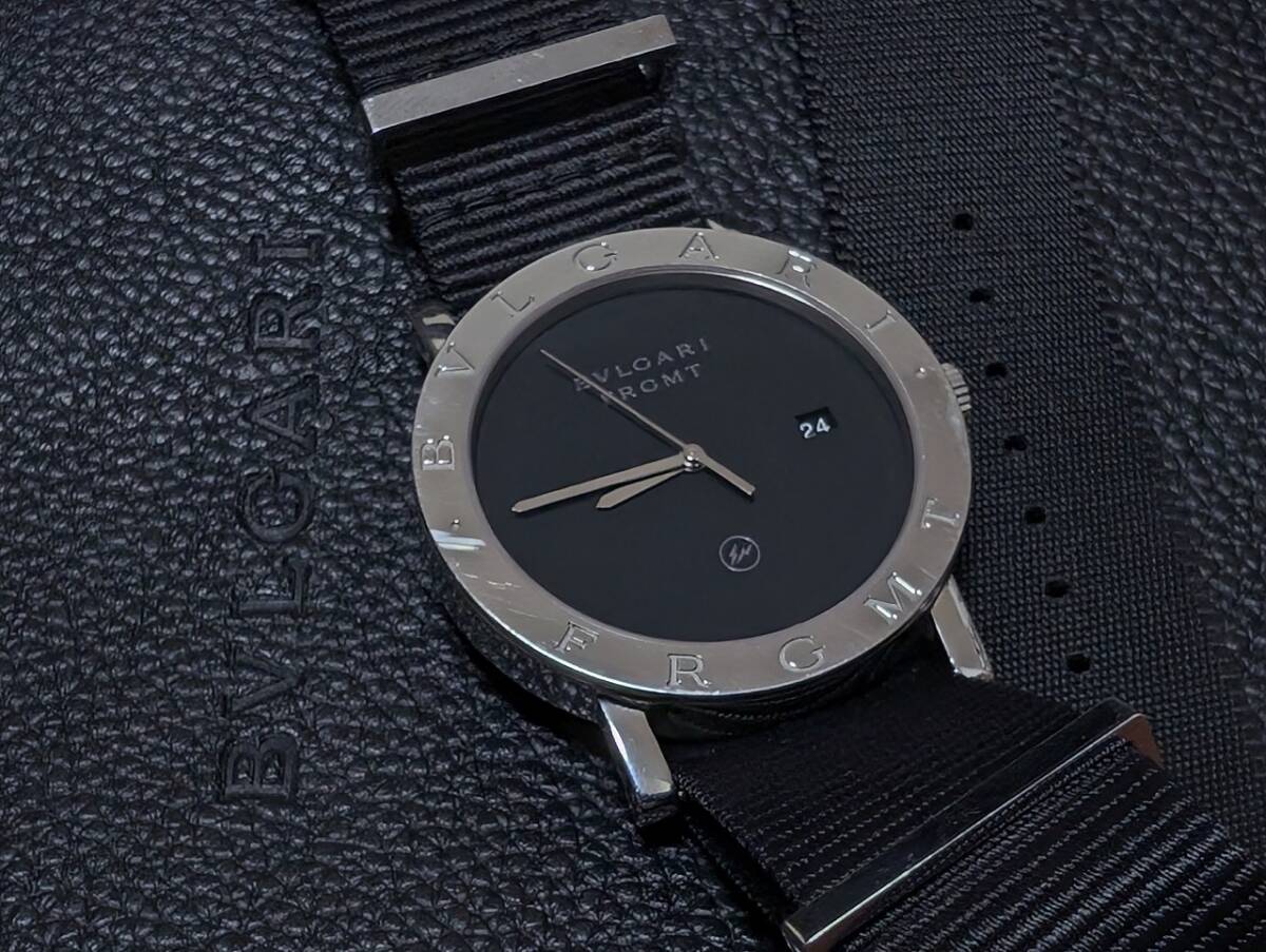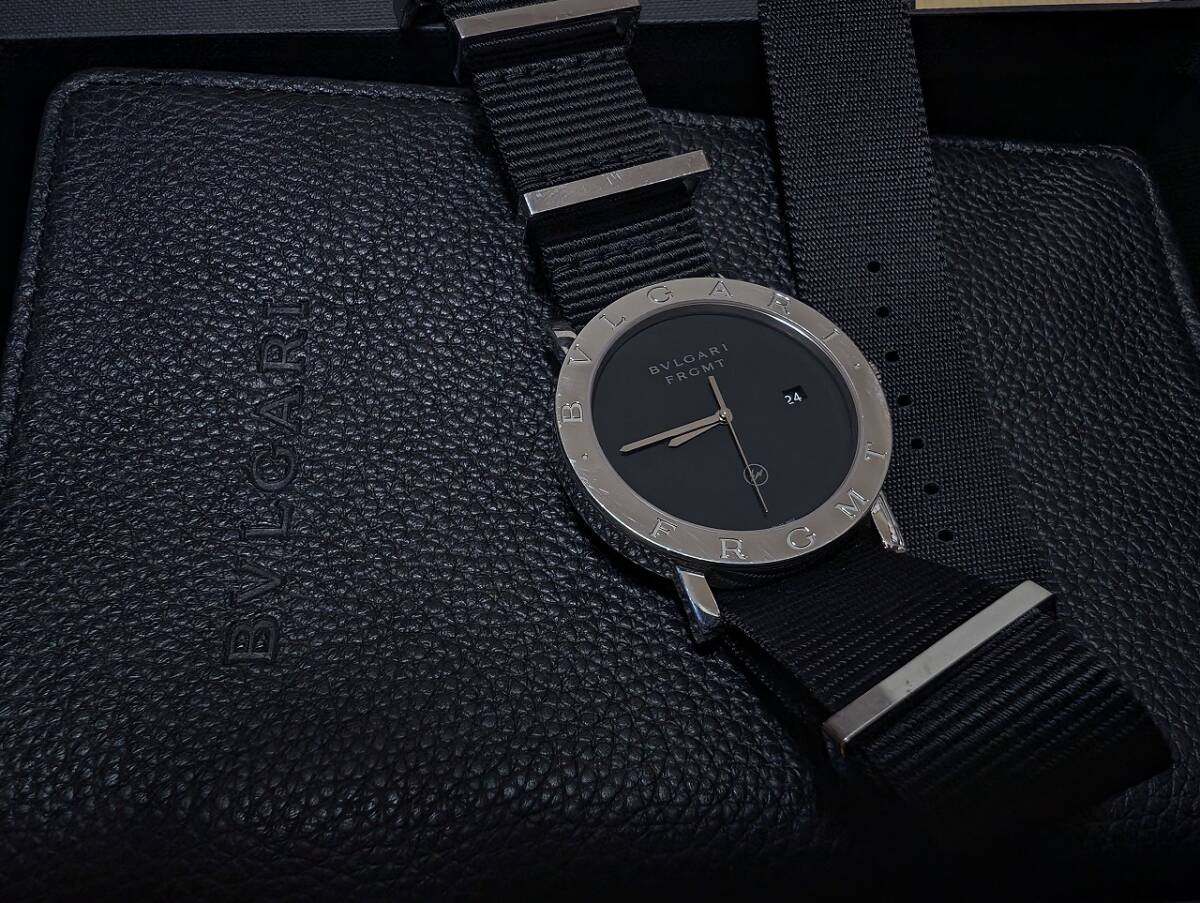 BVLGARI ブルガリブルガリ Fragment フラグメント デザインの限定品です。箱、ケース、保証カードなどついています。本来の付属品に加え、純正ラバーストラップを追加で購入していたのでお付けします。傷は少し多めですが深いものはないと思います。藤原ヒロシさんこだわりの時計です。使用に支障のある部分はないと思います。