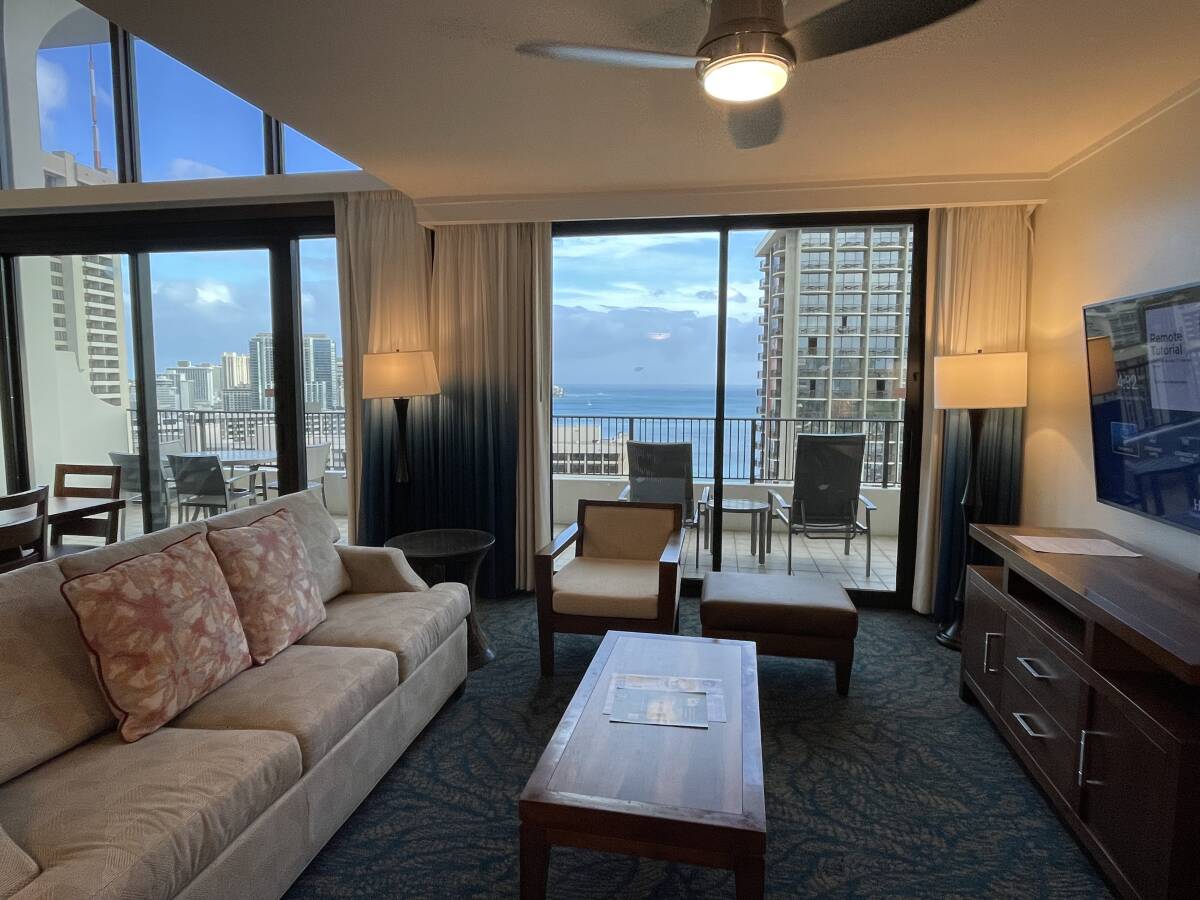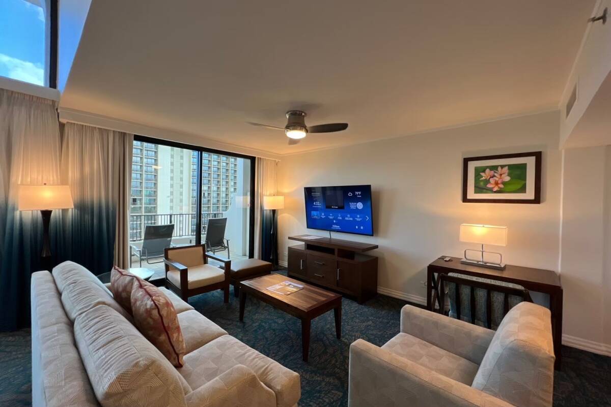 2階層ラナイのついた広い2ベッドルーム、2バスルームペントハウスオーシャンビュースイートのプライマリーベッドルームには、キングサイズベッド、55インチ薄型HDTV、スタンダードサイズのシャワー付きバスタブとTOTOウォシュレットがついたバスルームを備えています。2つ目のベッドルームには、ツインサイズベッド2台またはダブルサイズベッド2台、55インチ薄型HDTV、スタンダードサイズのシャワーとバスタブがついたバスルームがあります。また広いリビングルームには独立ダイニングエリア、モバイルデバイスからのコンテンツストリーミングが可能な65インチの薄型HDTV、クイーンサイズのソファベッド、フルキッチンにはコンロ、オーブン、冷蔵庫、食器洗浄器、電子レンジ、電気ポット、コーヒーメーカーと炊飯器がついています。