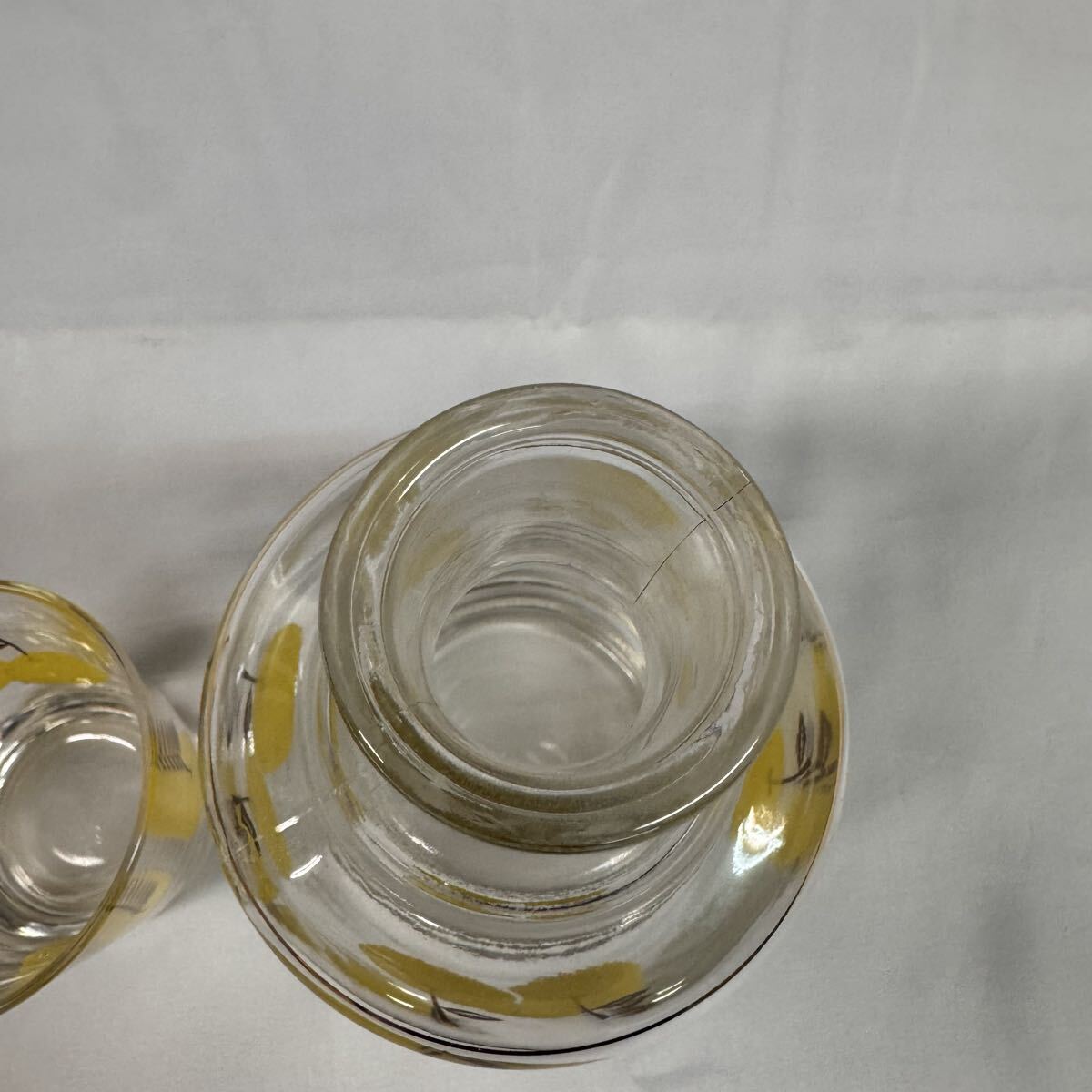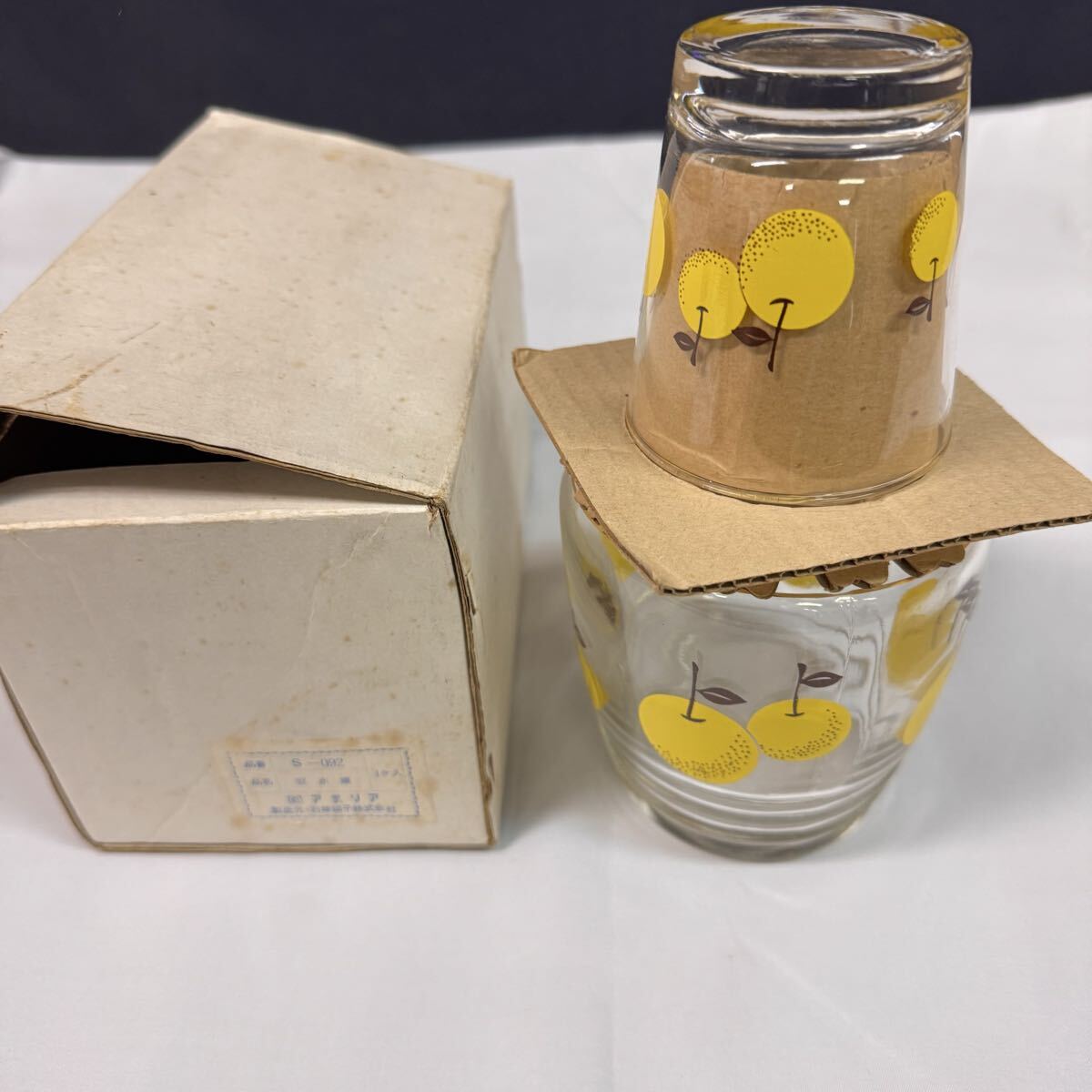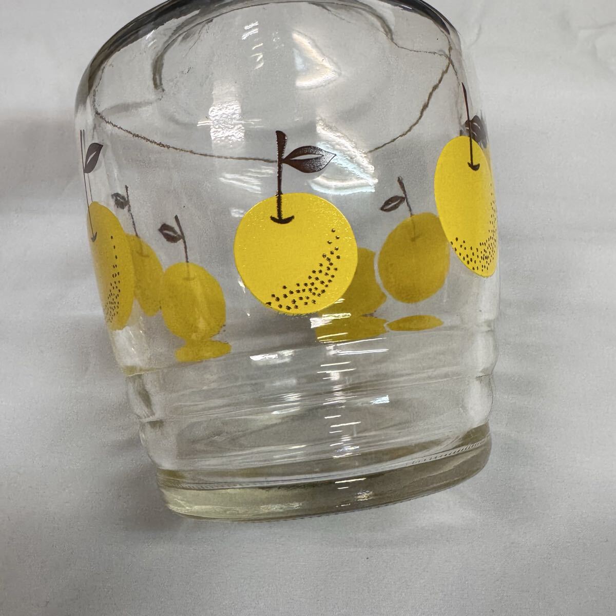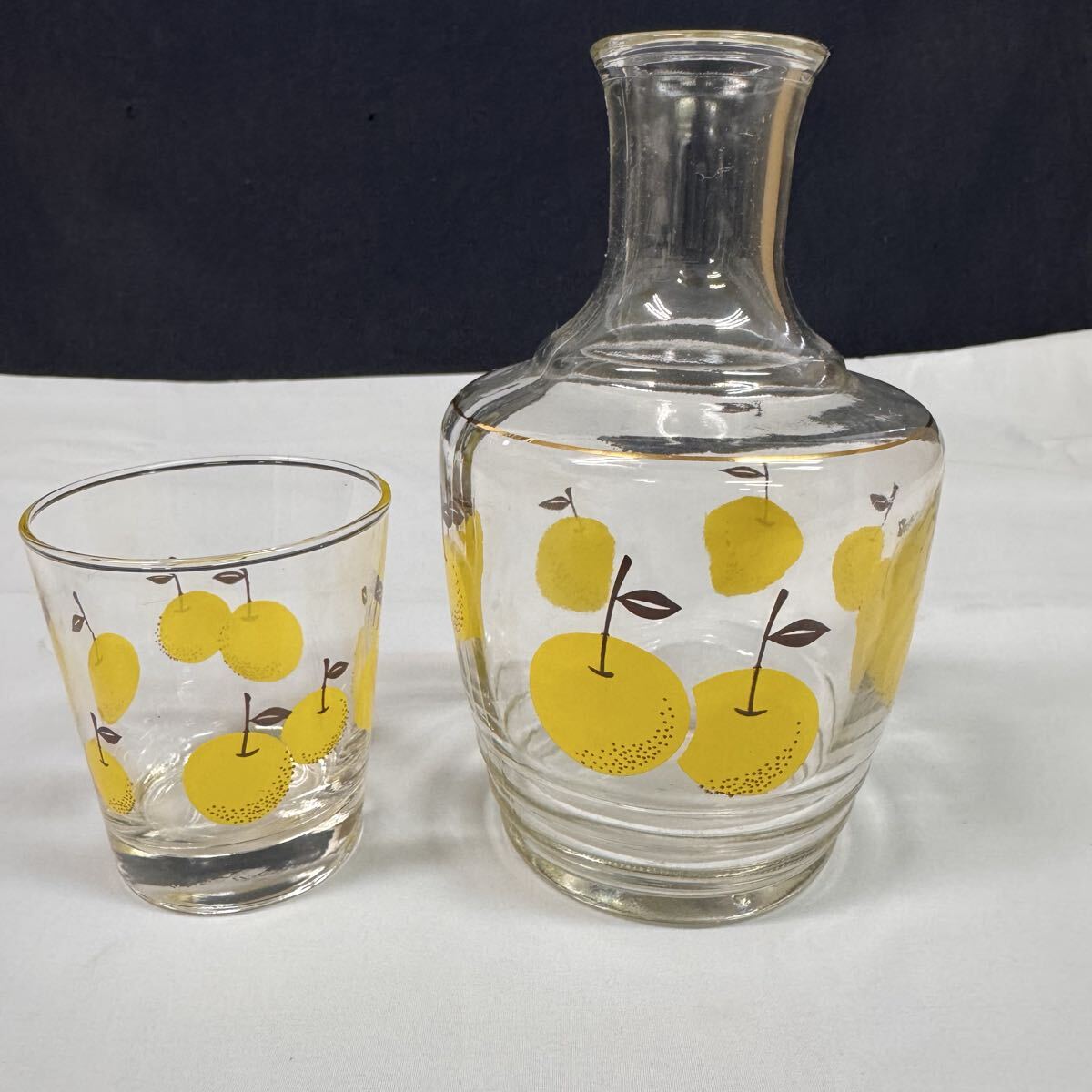 ◆昭和レトロ ADERIA/アデリア 梨柄 冠水瓶 グラス&水差しセット ガラス ワンカップ ピッチャー レトロポップ 箱付 当時物 食器 269-44