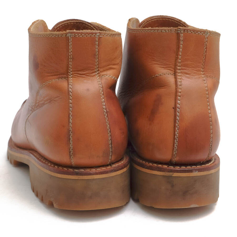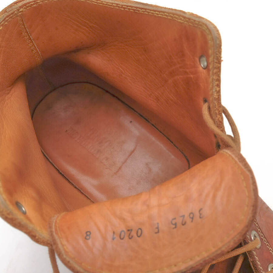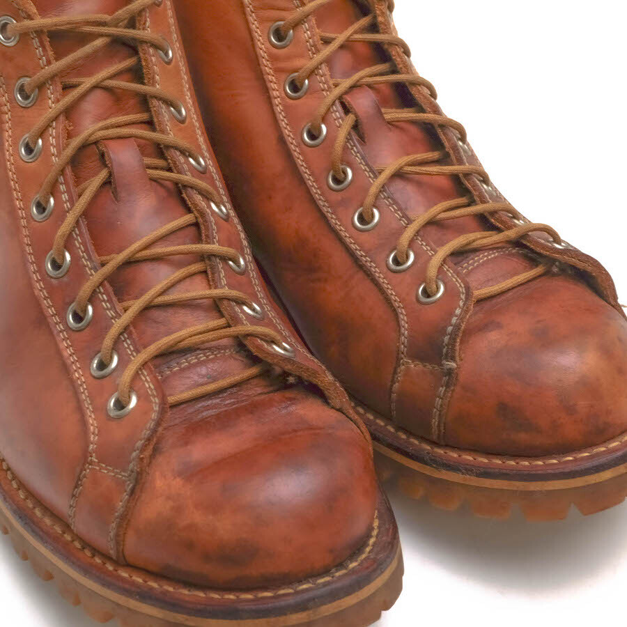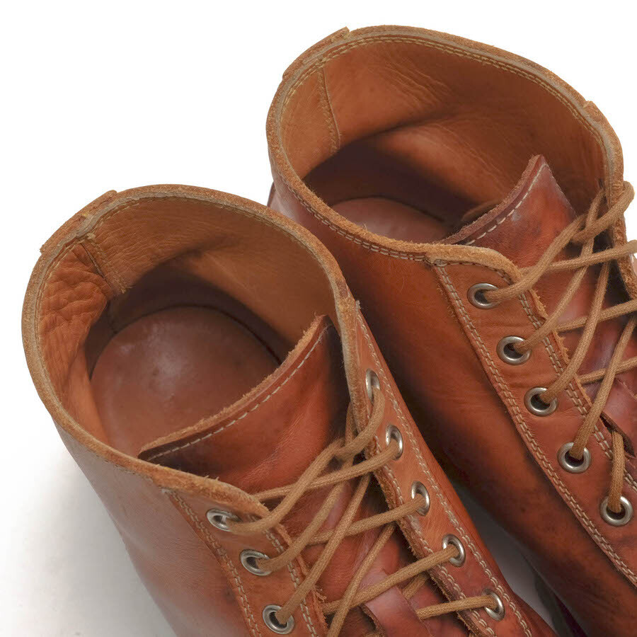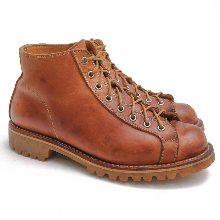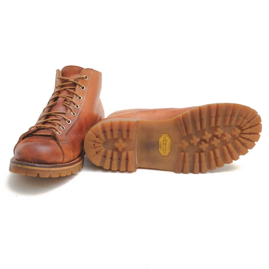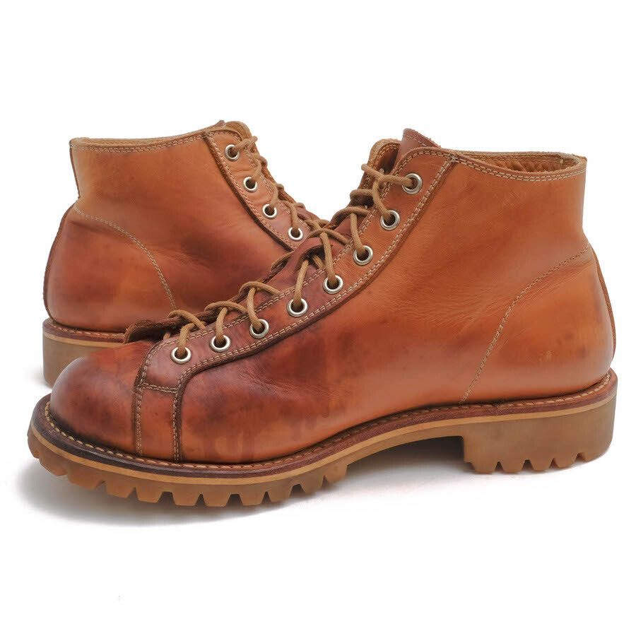 本来、屋根の上で作業する人の為に(電線工路)開発されたワークブーツをサンプリングしたモデル。表地にヌメ革、ソールはビブラムソールを使用しており、エイジングを楽しめる逸品。 |
